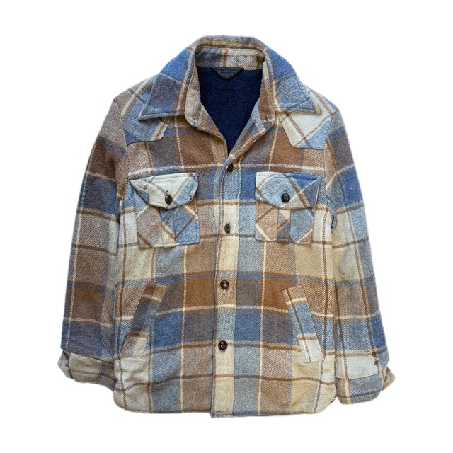 1970〜80年代頃のSears製チェックシャツ。 アメリカ3大ストアブランドのひとつであるSears。 配色はブルーをベースに、ベージュとネイビーを組み合わせたクラシックチェック。ワークウェア的な無骨さを残しつつ、柄ピッチや色バランスは比較的整っており、当時の量販系シャツの中でも完成度の高いパターンです。 生地はポリエステル素材を採用。 この時代、ウール調の見た目を保ちながら軽量化・耐久性・イージーケア性を高める目的でポリエステル生地が多く採用され始めました。天然素材志向とは異なる、「量産時代のリアルアメリカンウェア」を象徴する素材感です。 【ブランド】Sears 【年代】推定1970〜80年代 【表記サイズ】S 【素材】ポリエステル 【生産国】韓国製 【状態】全体的に使用感や毛羽立ちが見られます。袖口や裾付近に擦れや糸抜けが見られますが、着用に支障のある大きなダメージはなく、ヴィンテージとして雰囲気良く着用可能なコンディションです。 【サイズ】 着丈78cm 身幅55cm 肩幅45cm 袖丈57cm 画像がある場合、着用モデルの体型は168cm58kgとなります。 ※着用の参考画像をご希望されるお客様はお気軽にお問い合わせくださいませ。 ※商品の写真について、実物の色味にできるだけ近くなるよう調整しておりますが、異なる場合がございます。予めご了承ください。 ※当店が扱っている商品はすべてUSED商品となります。重大な欠陥がある場合をのぞき返品、返金等のご対応は出来かねます。予めご了承の上、ご検討ください。 ※なお、2点以上お買い上げの際はおまとめでの発送となり”ヤマト運輸または日本郵便”にてお届けいたします。 ※サイズの計測方法について 身丈: 衿の付け根から裾の先端までを直線で測った長さ 身幅:両袖のわきの下を直線で測った長さ 肩幅:両肩の縫い目から縫い目を直線で測った長さ 袖丈: 肩先から袖口の縫い目までを直線で測った長さ