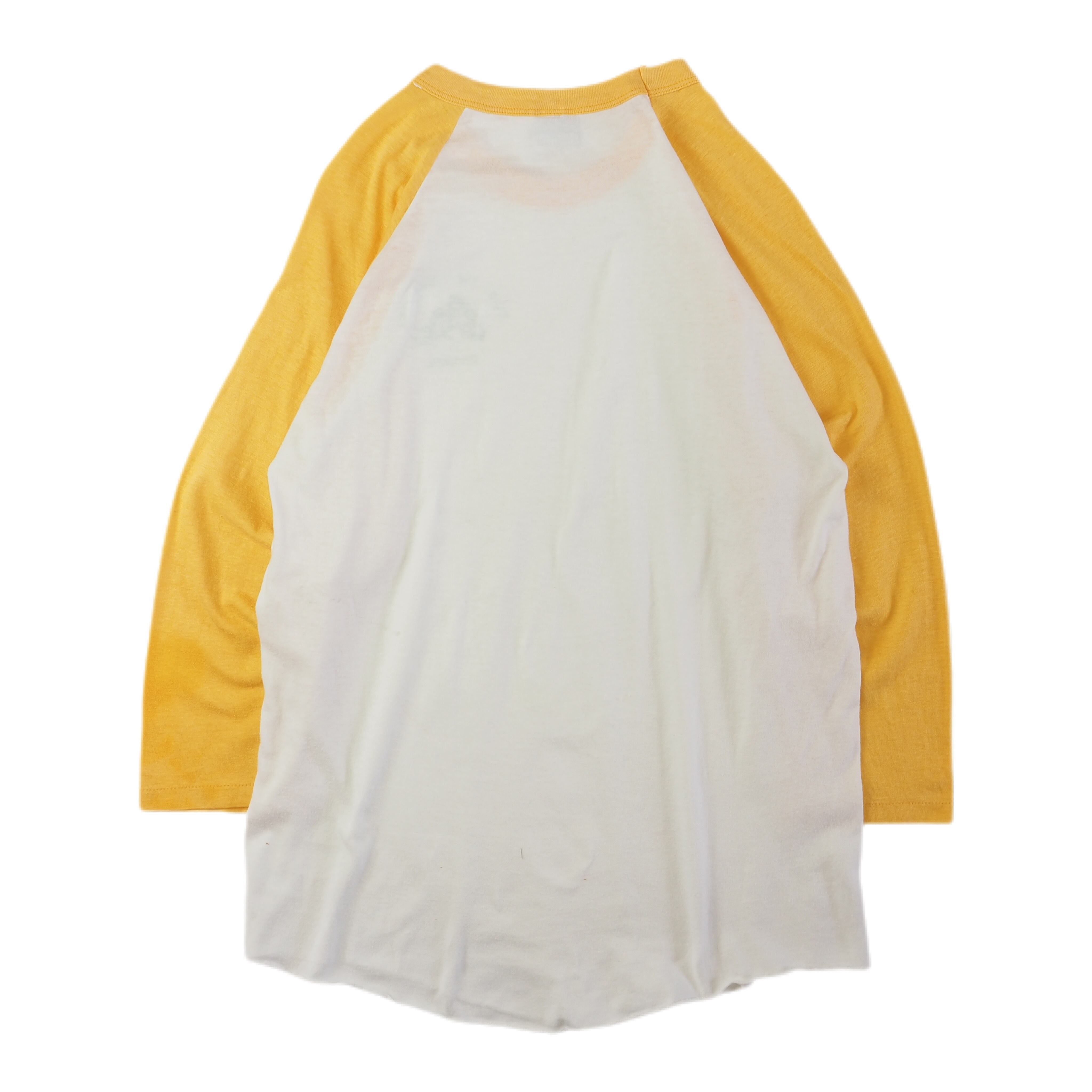80年代HanesタグのラグランスリーブTシャツです。ホワイトボディにイエロースリーブの爽やかな配色が特徴的な一着。フロントにはアメリカの老舗スニーカーショップ「champs」のロゴとスニーカーモチーフのグラフィックがプリントされています。ファブリックは80年代らしいポリエステル混紡の柔らかい生地感。サイズ感