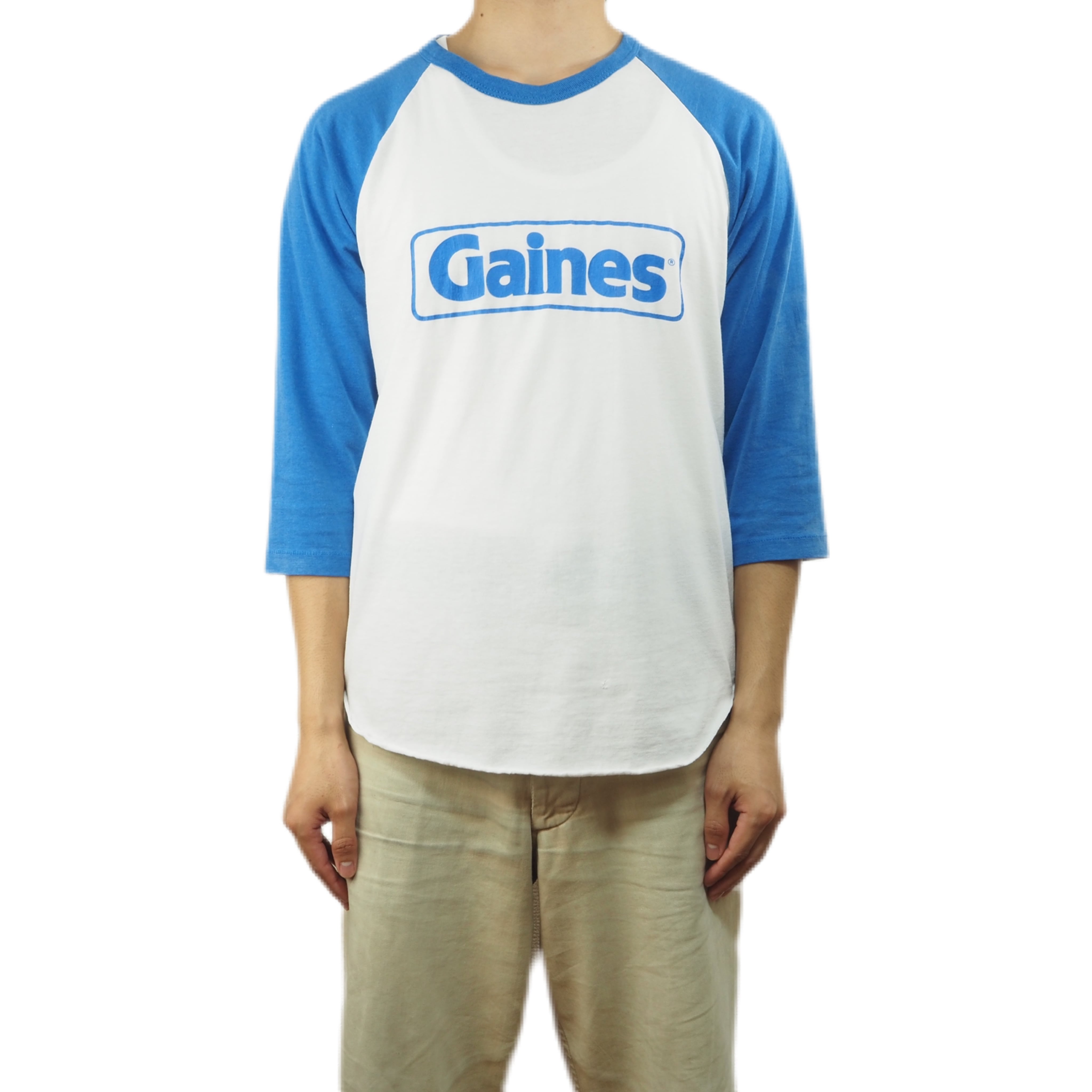 80年代のラグランスリーブTシャツです。ホワイトボディにブルースリーブの爽やかな配色が特徴的な一着。フロントには「Gaines」のロゴが大胆にプリントされています。ファブリックは80年代らしいポリエステル混紡の柔らかい生地感。サイズ感ですが普段Mサイズを着用する私でちょうどよく着用出来ました。