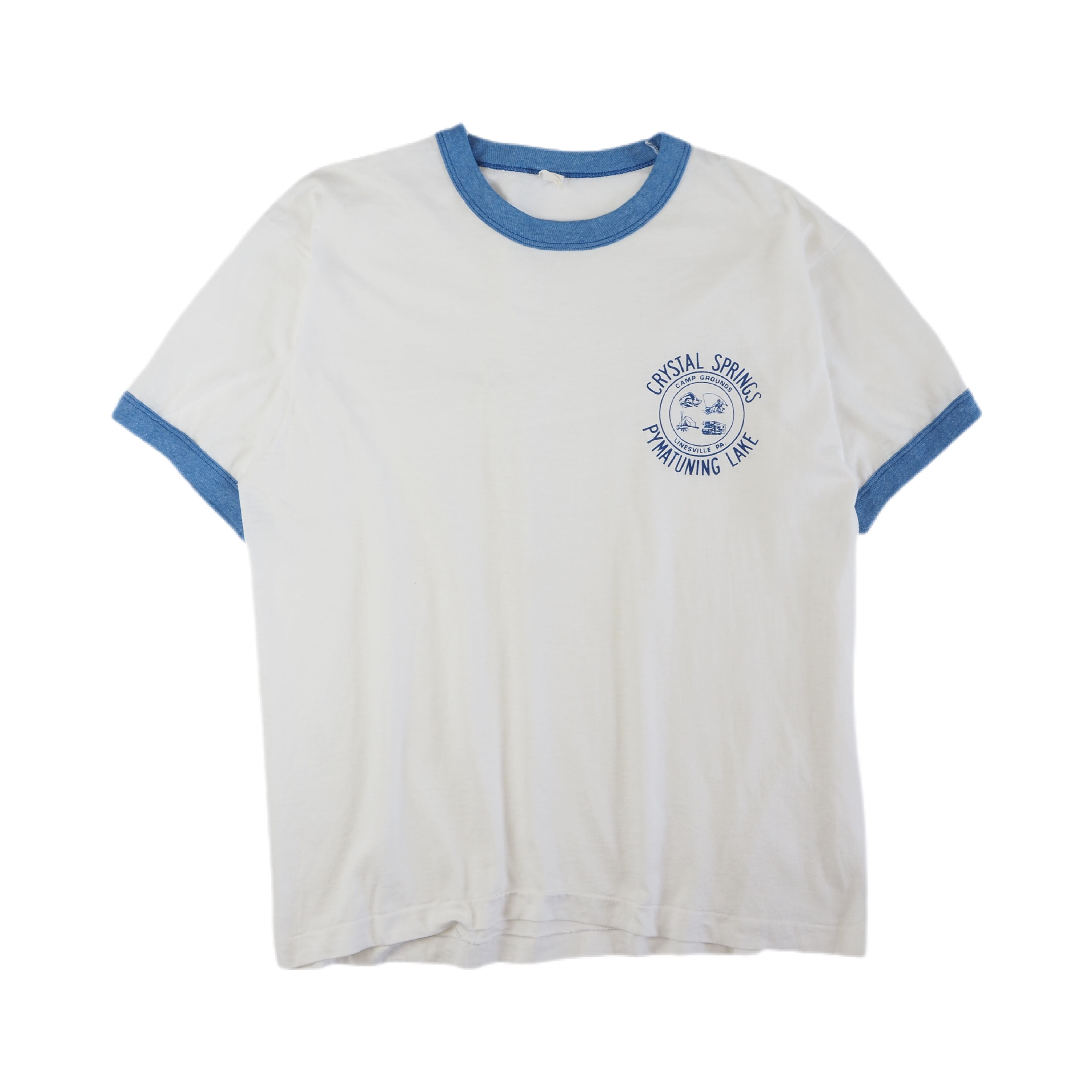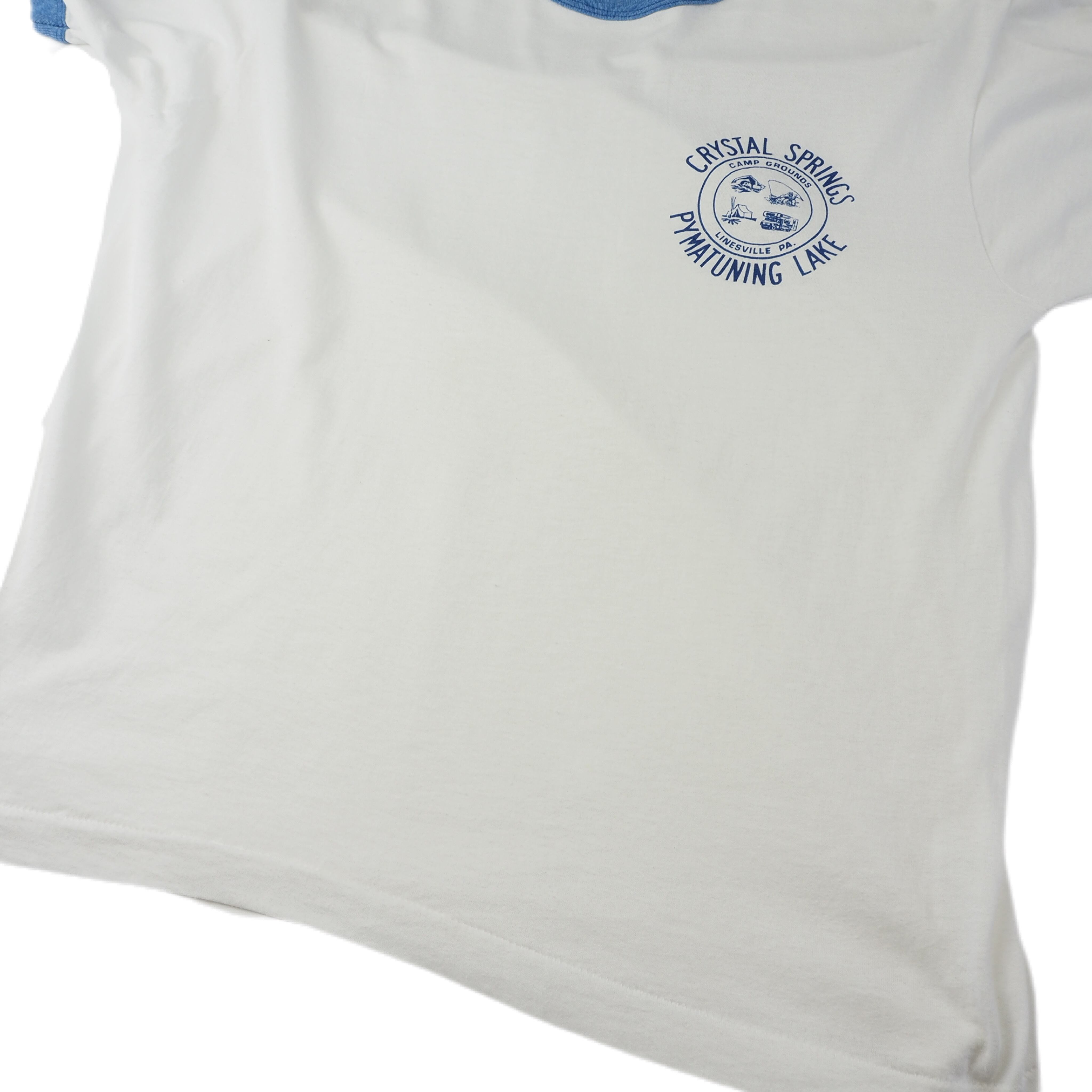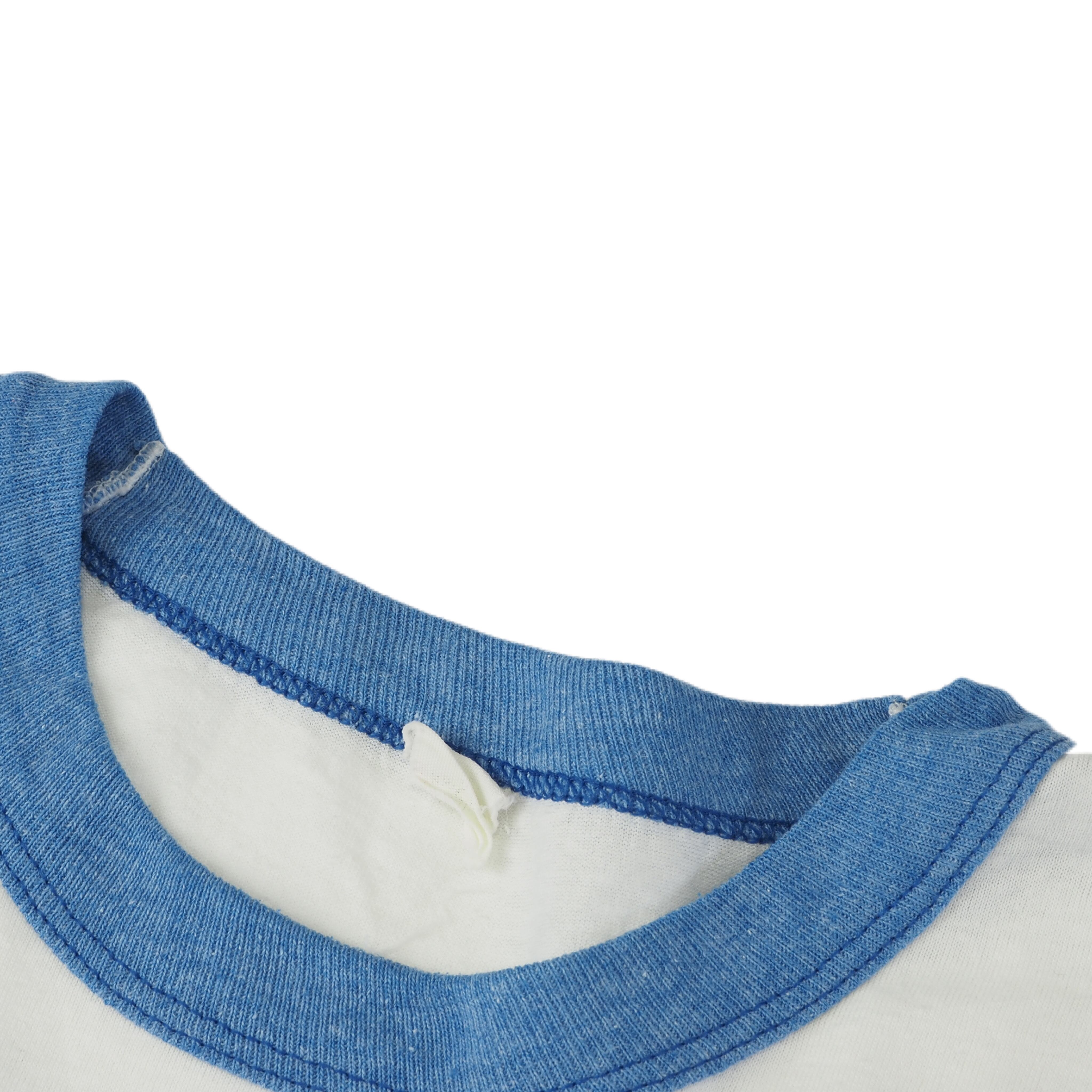 80年代のリンガーTシャツです。ホワイトボディとリブの水色の配色が良い一着。胸元にはワンポイントのキャンプ場のロゴがあり、テントやキャンピングカーなどのキャンプらしいグラフィックがプリントされています。ファブリックは80年代らしいコットンとポリエステルの柔らかい生地感。非常に使いやすく、活躍間違い無しの一着です。サイズ感は普段Mサイズを着用する私でゆとりをもって着用でき、普段Lサイズを着用する方でジャストに着用できると思います。