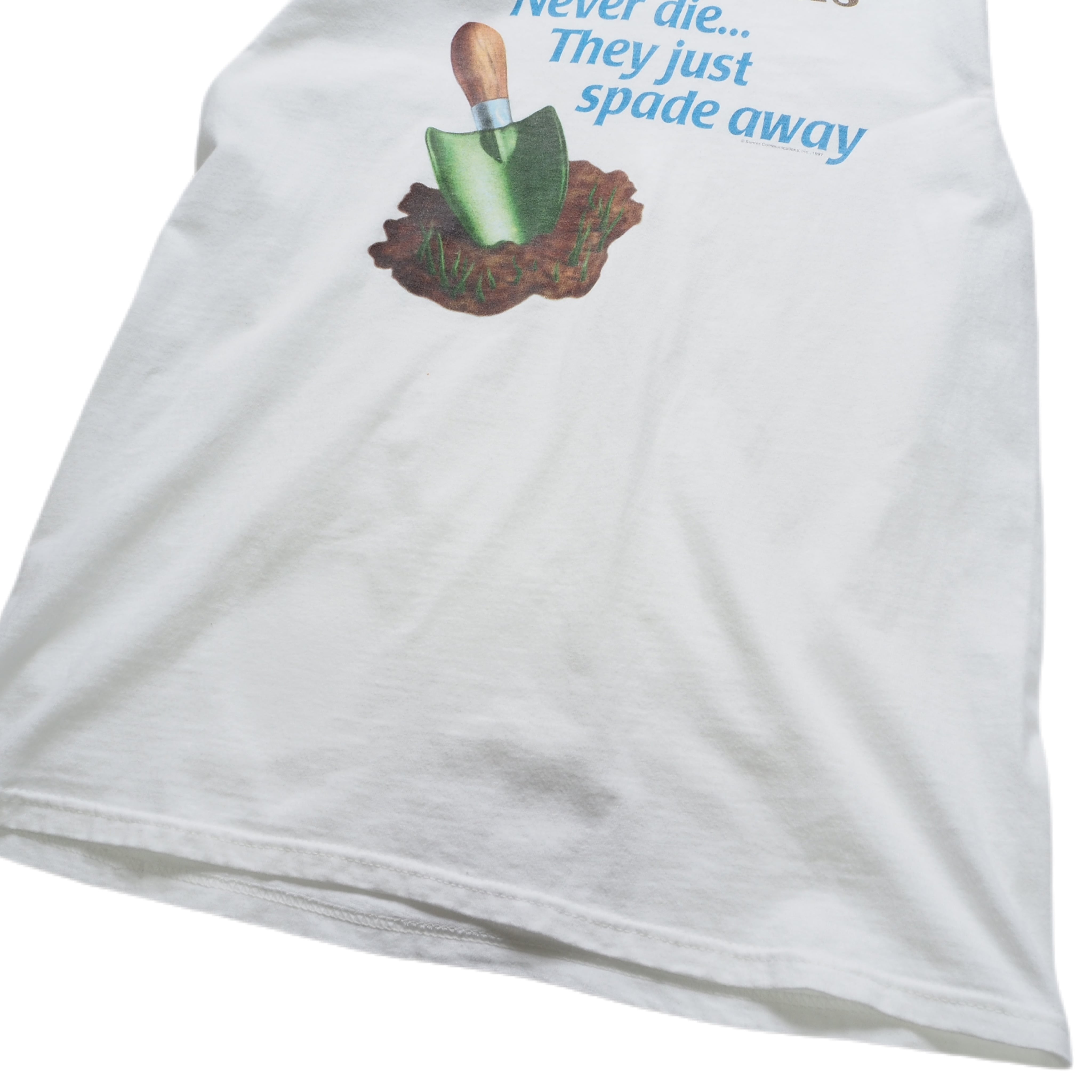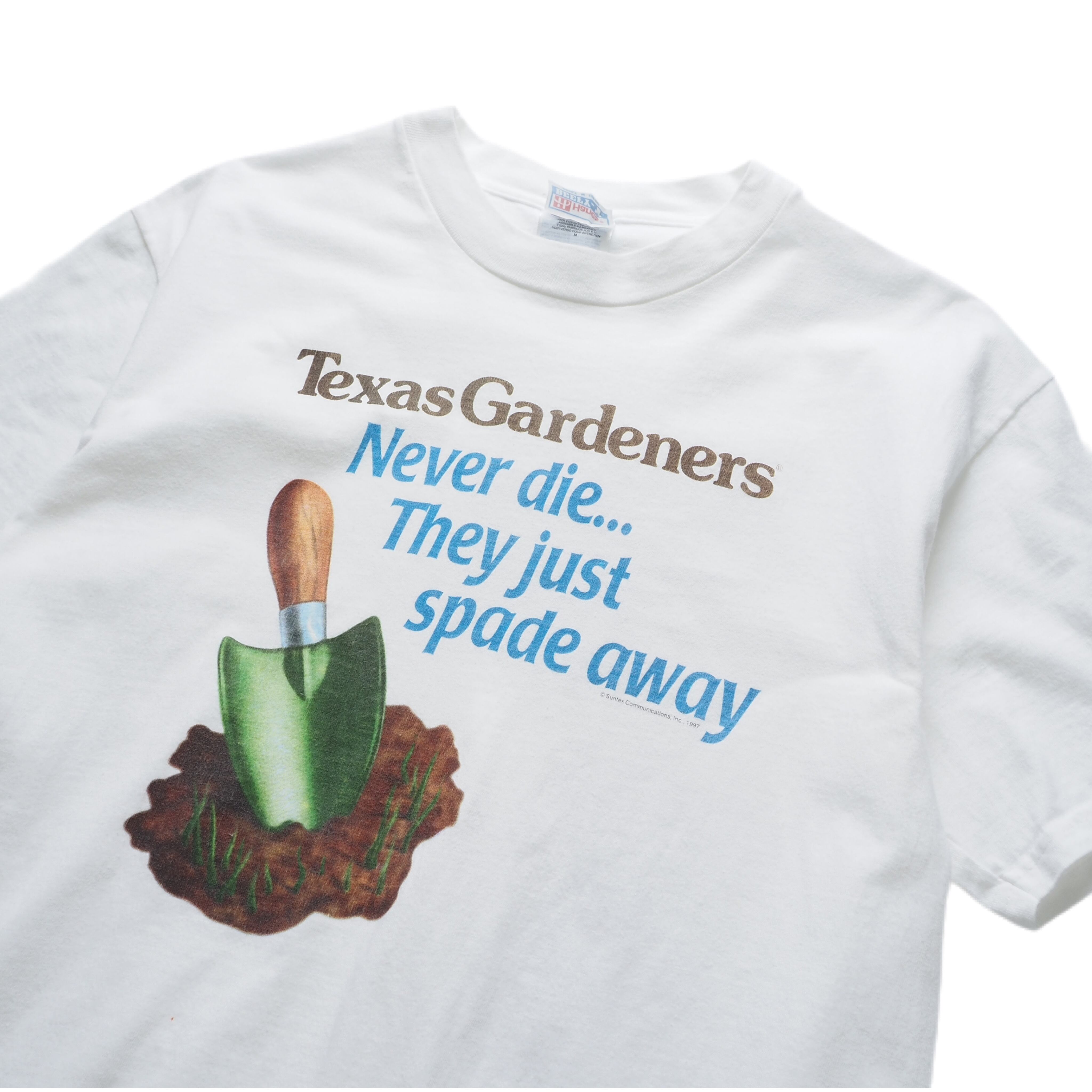 ガーデニング愛が炸裂する、洒落の効いた一枚。フロントに大きくプリントされたメッセージは、Texas Gardeners Never die… They just spade away(テキサスのガーデナーは死なない。スコップ持って、どこかに行っちゃうだけ)