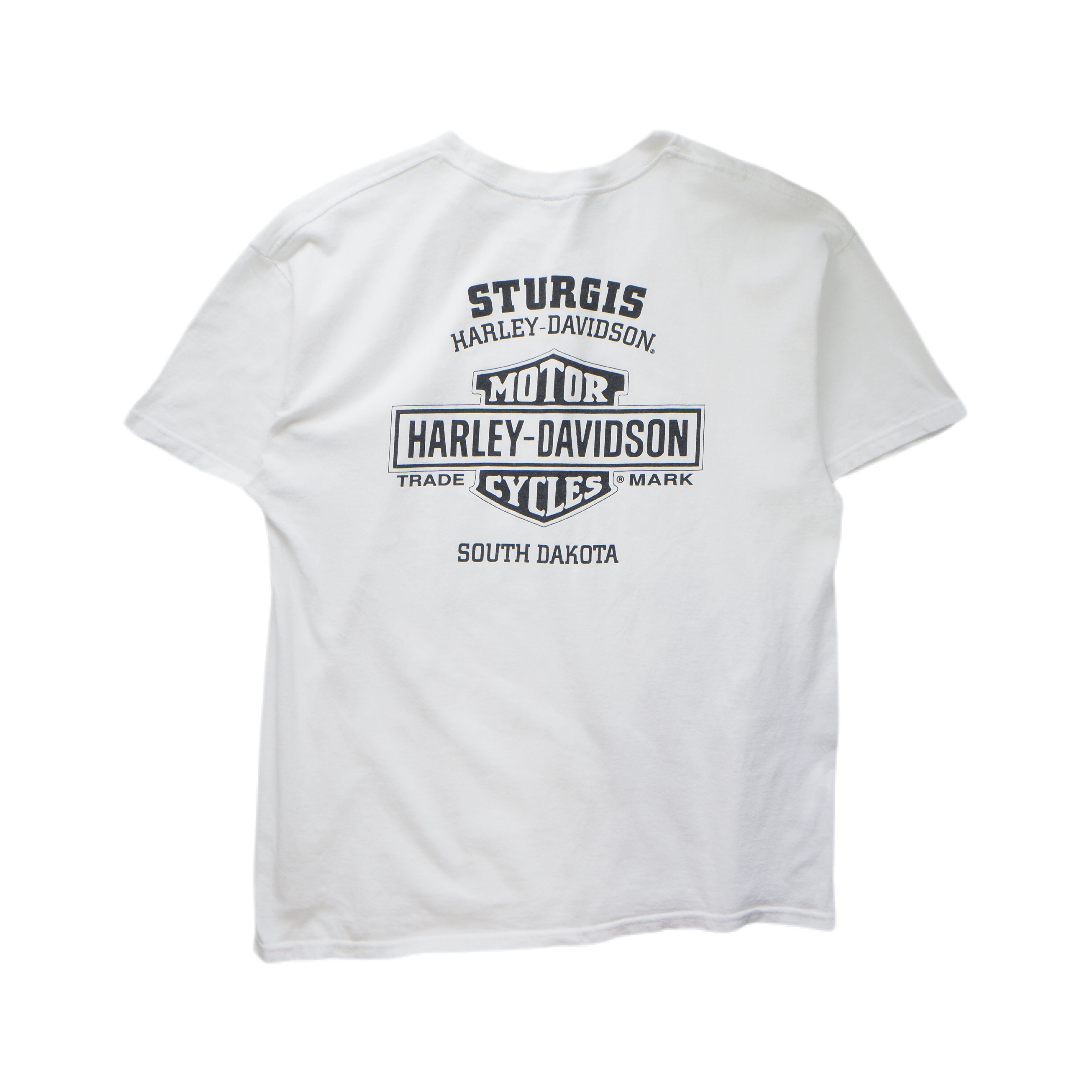 バックは、アメリカ最大級のバイカーズイベントの聖地、Sturgis(スタージス)/サウスダコタ州のご当地ディーラープリント。王道のバー&シールドロゴと地名をシンプルにレイアウトし、ハーレー乗りの旅の記録としての意味合いも強い仕様です。