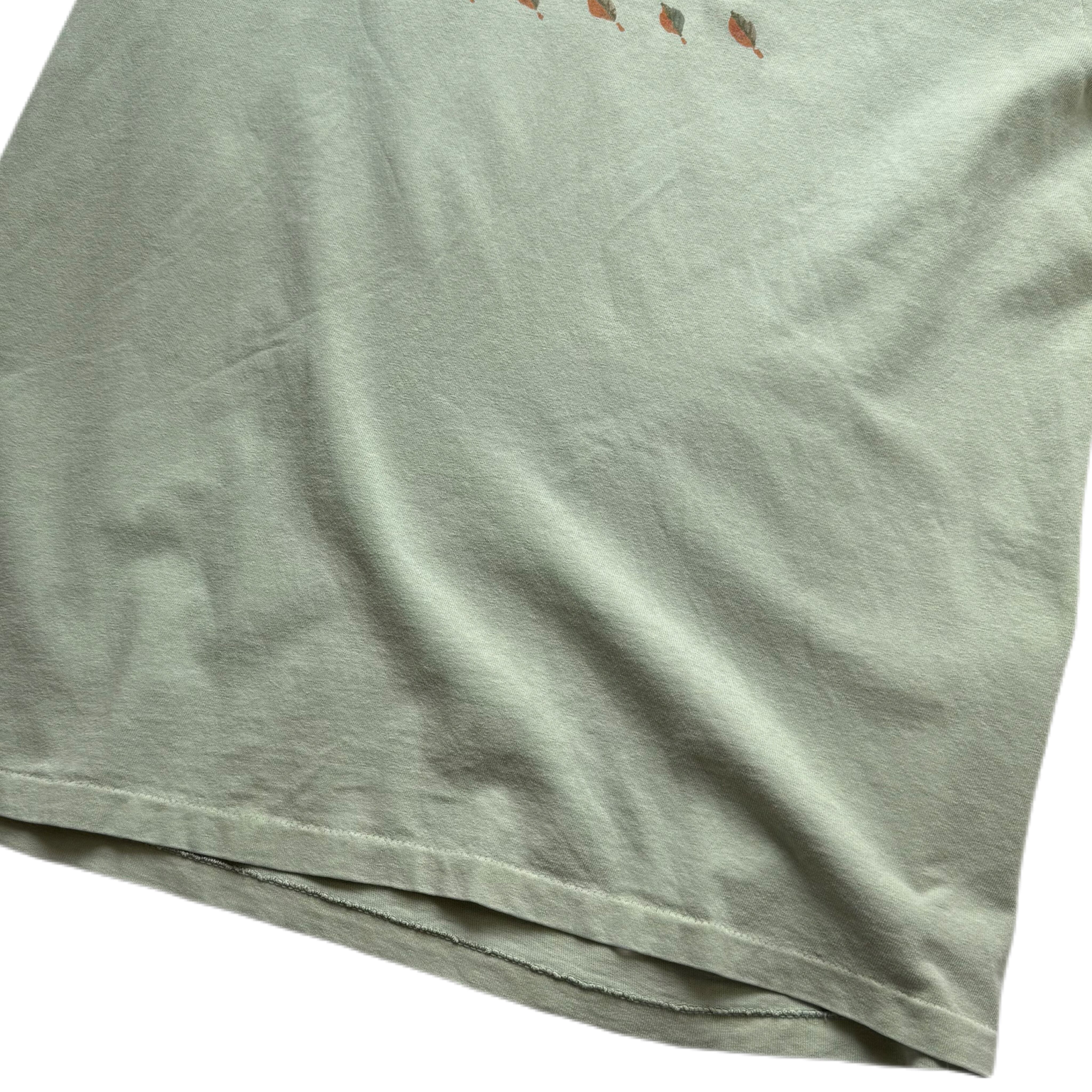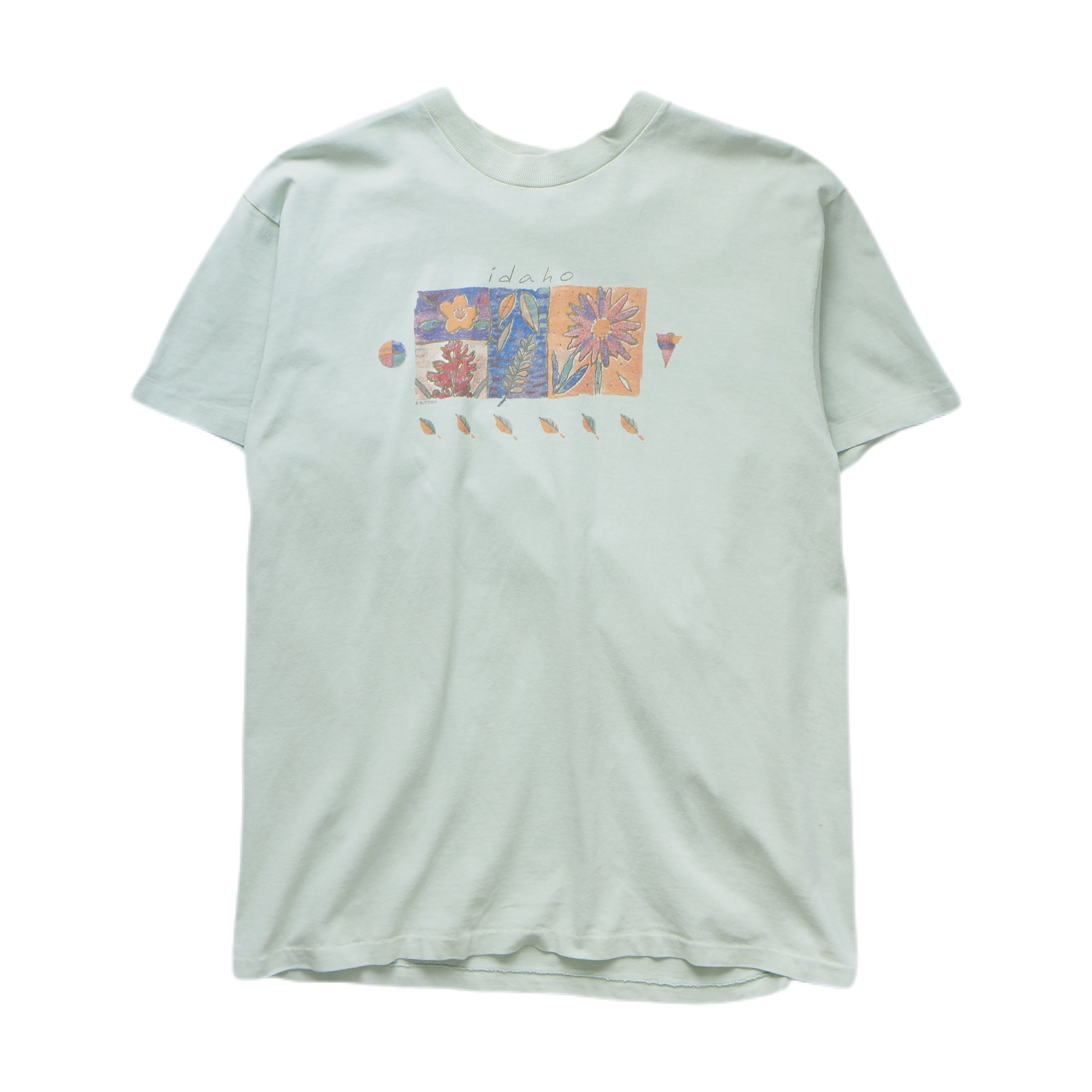 淡いペールグリーンのボディに、アイダホ州の自然や植物をアート風に表現したグラフィックが映える一枚。手描きタッチの花々やリーフモチーフが、90年代らしい柔らかく温かみのある雰囲気。