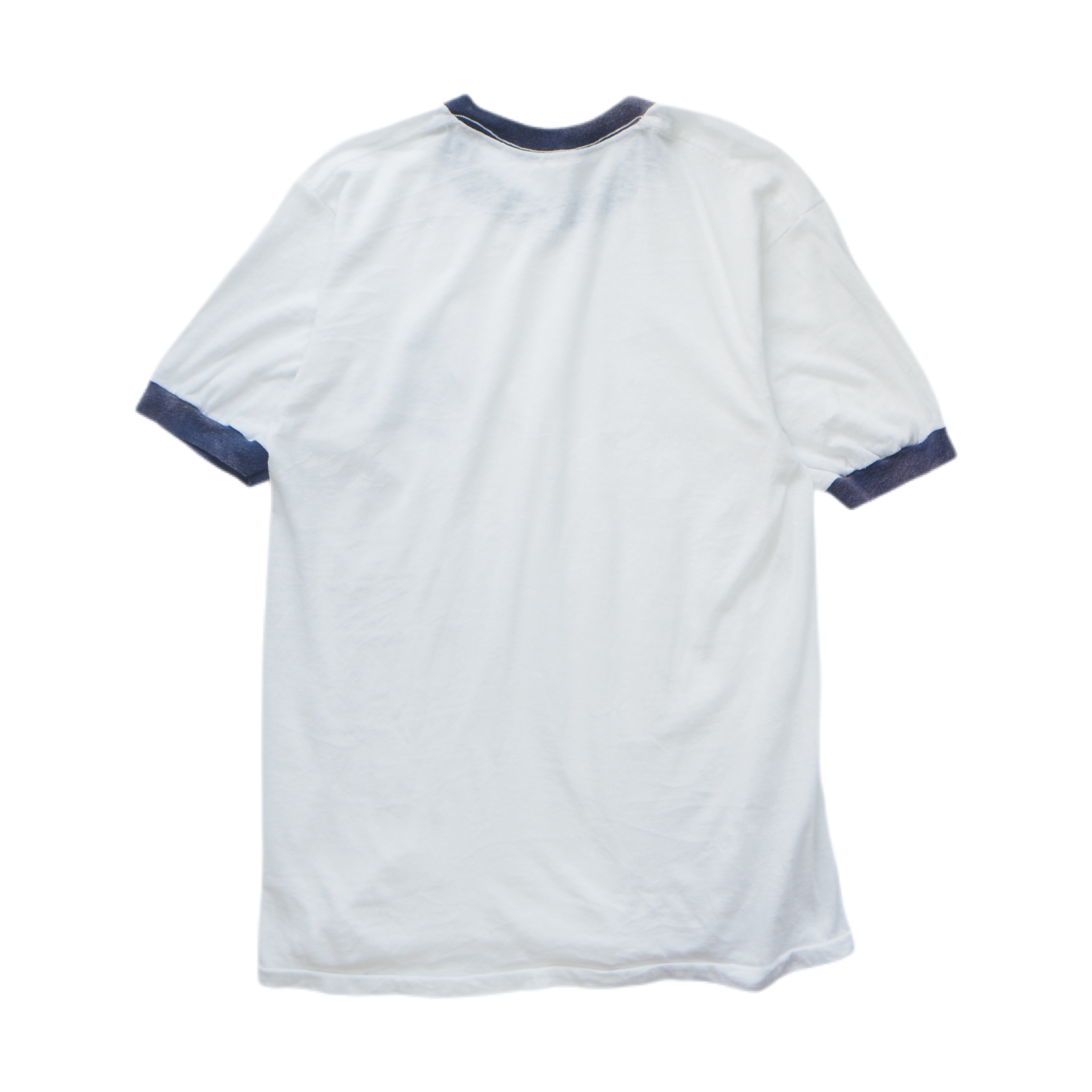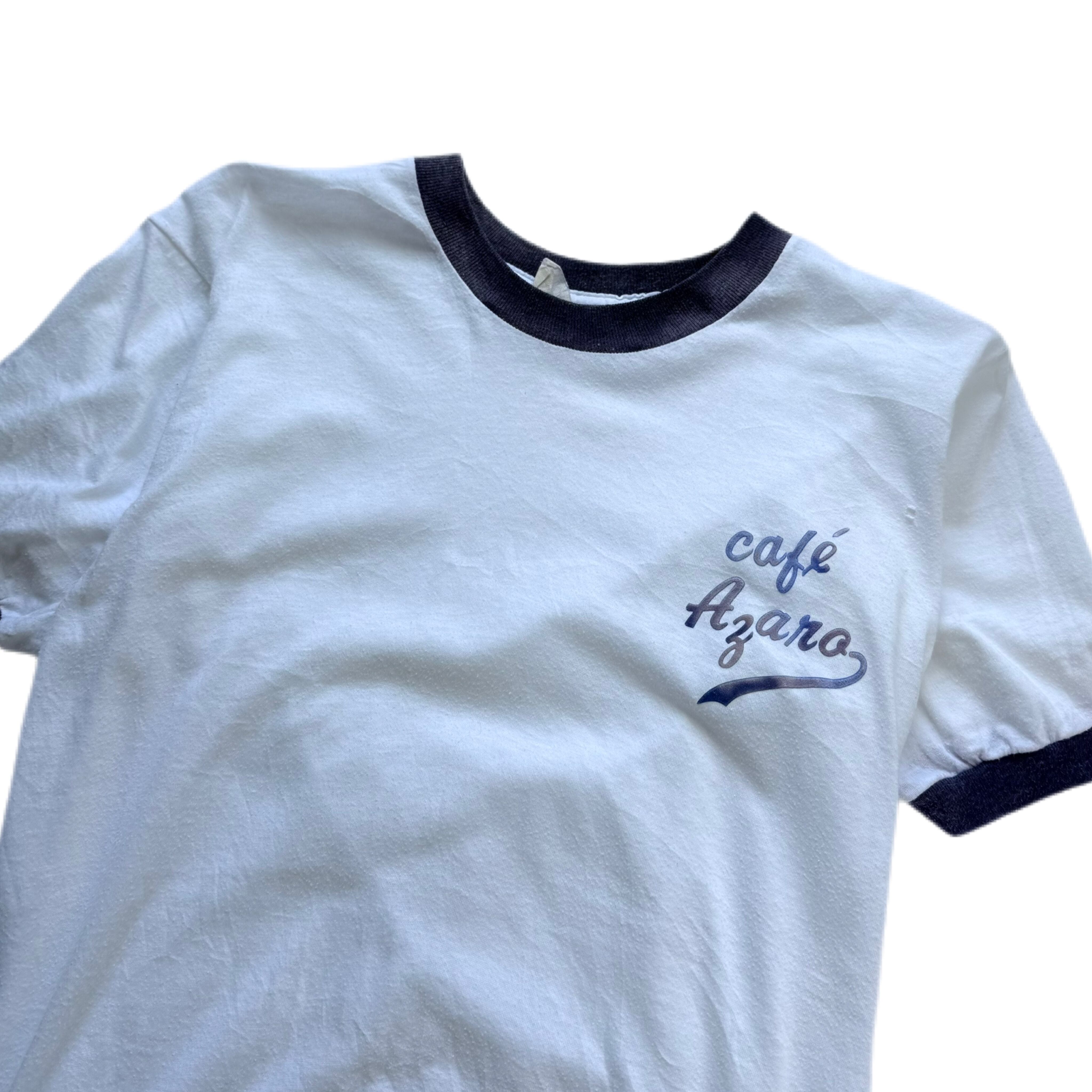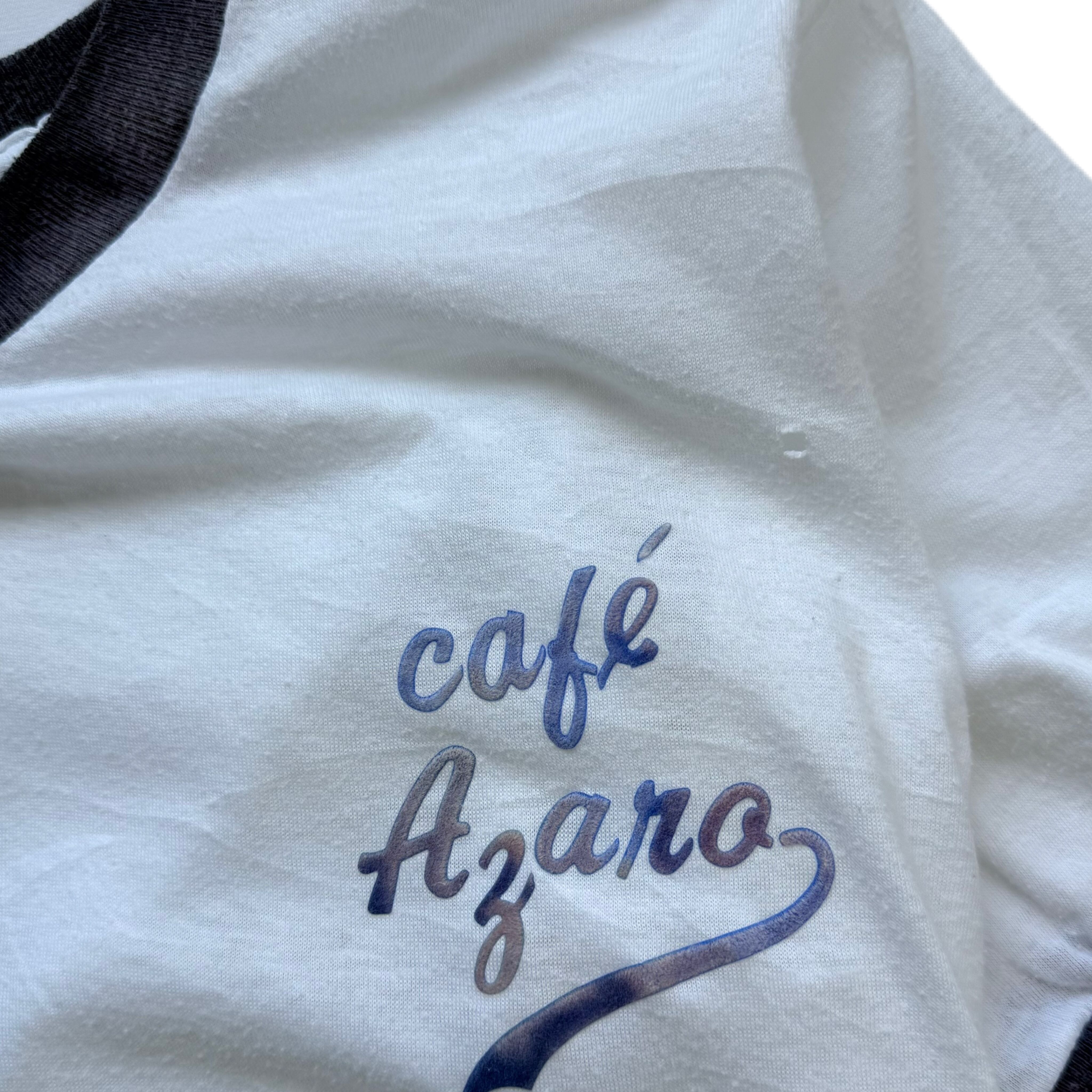 80年代のリンガーTシャツ。フロント左胸には「café Azara」と筆記体でプリントされ、控えめながらどこか気品を感じさせる一着です。実在するカフェかは定かではないものの、当時のローカルビジネスやスタッフ用Tシャツによく見られるデザインで、アメリカンカルチャーを感じさせる雰囲気が魅力。