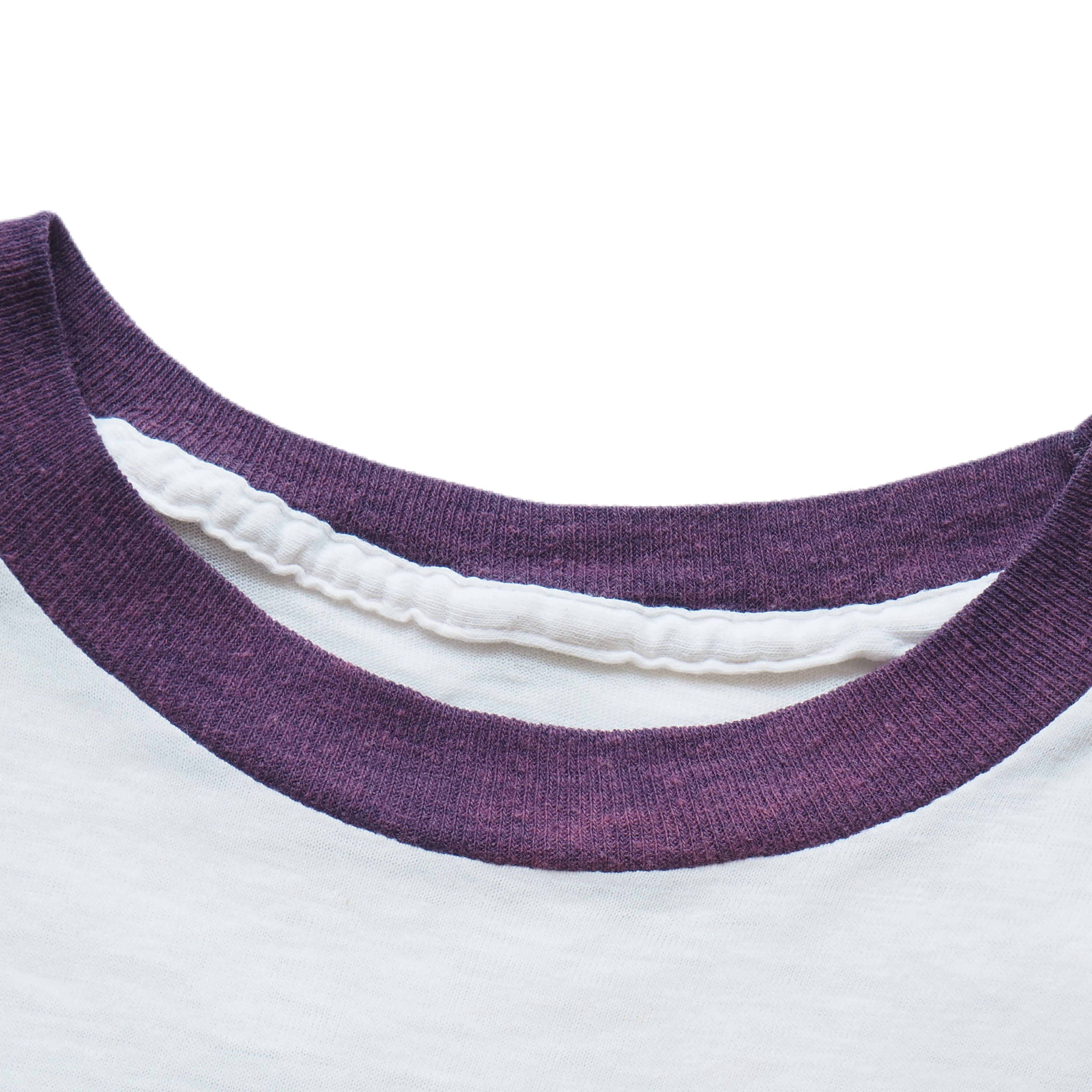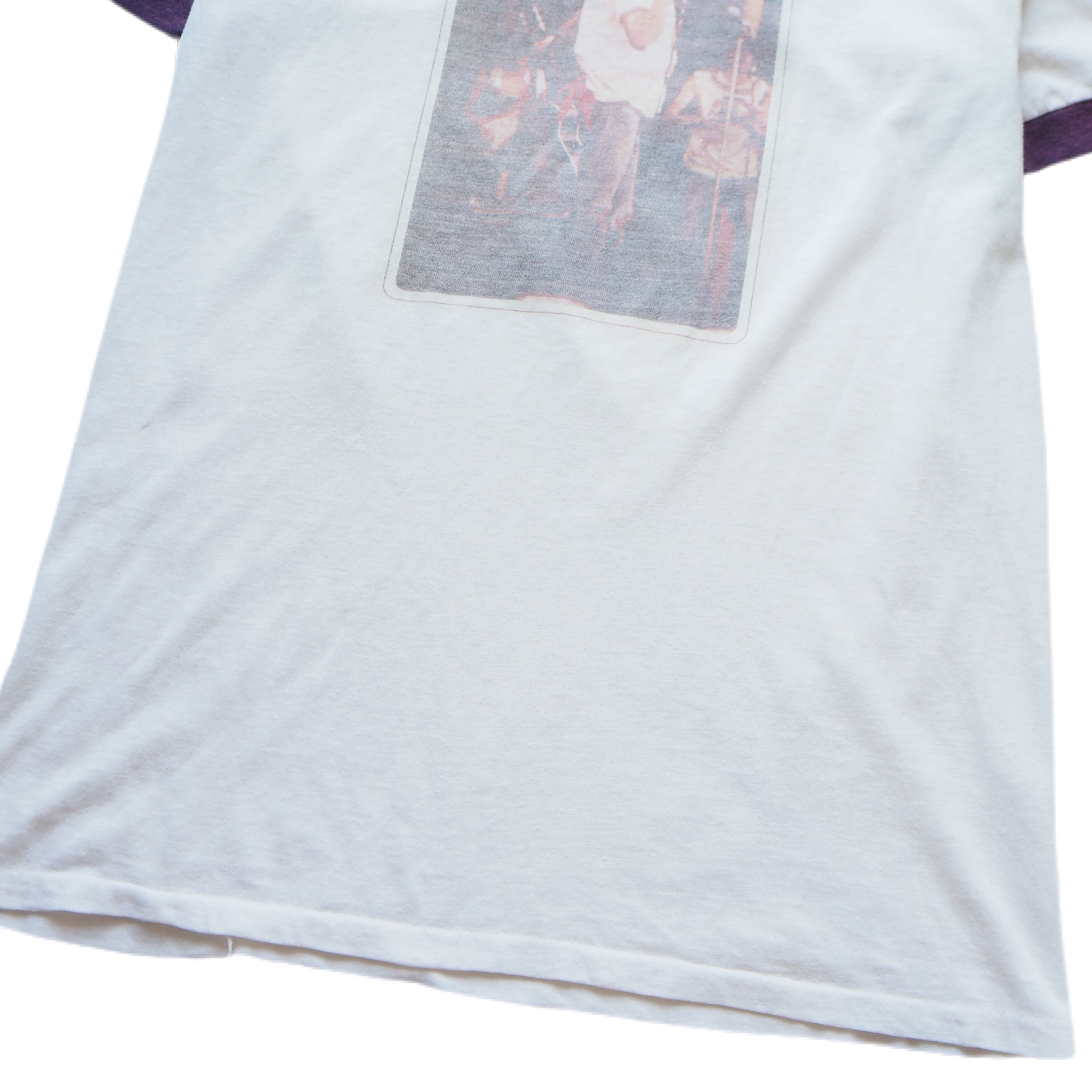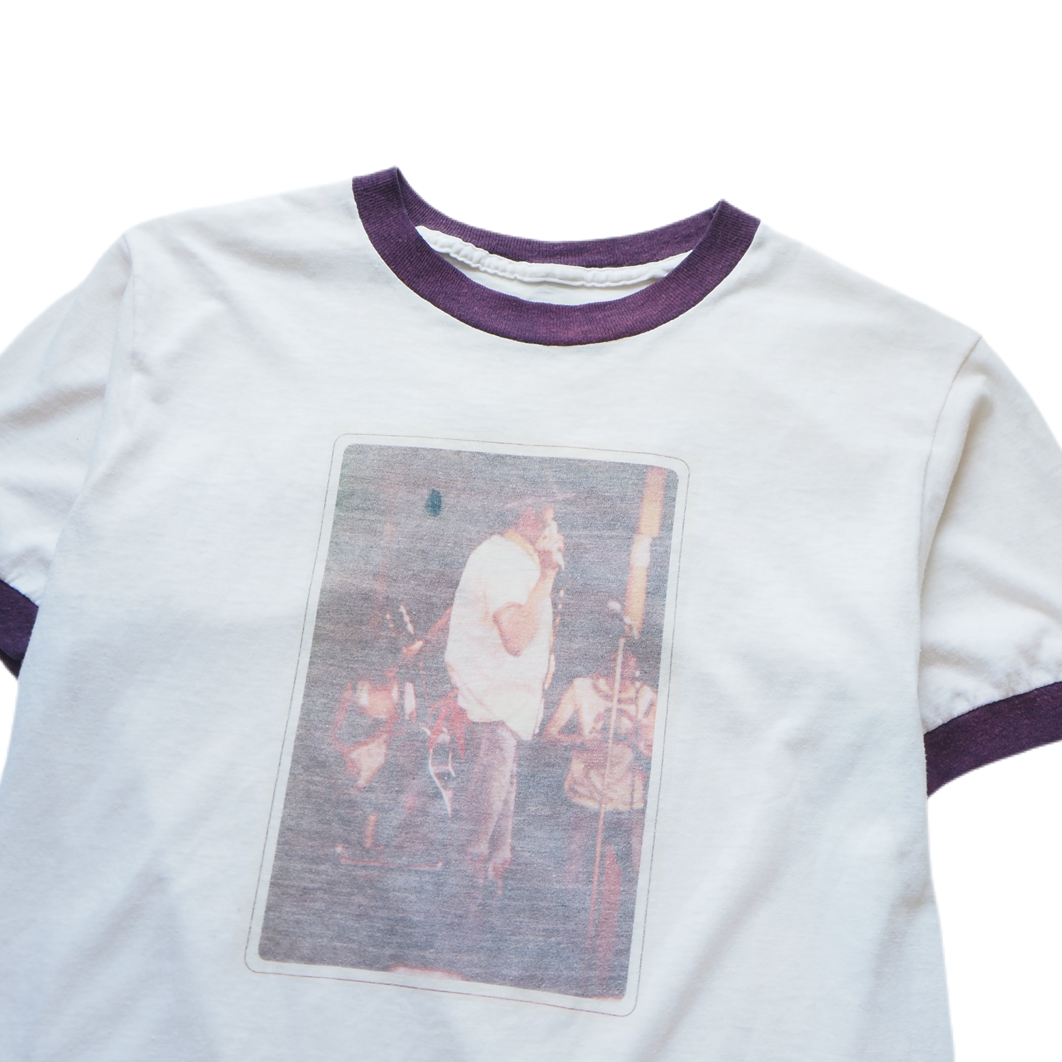ボディは80年代らしいコットンポリのリンガーT。フェード感、フロッキープリントとヴィンテージ好きに刺さるディテール。