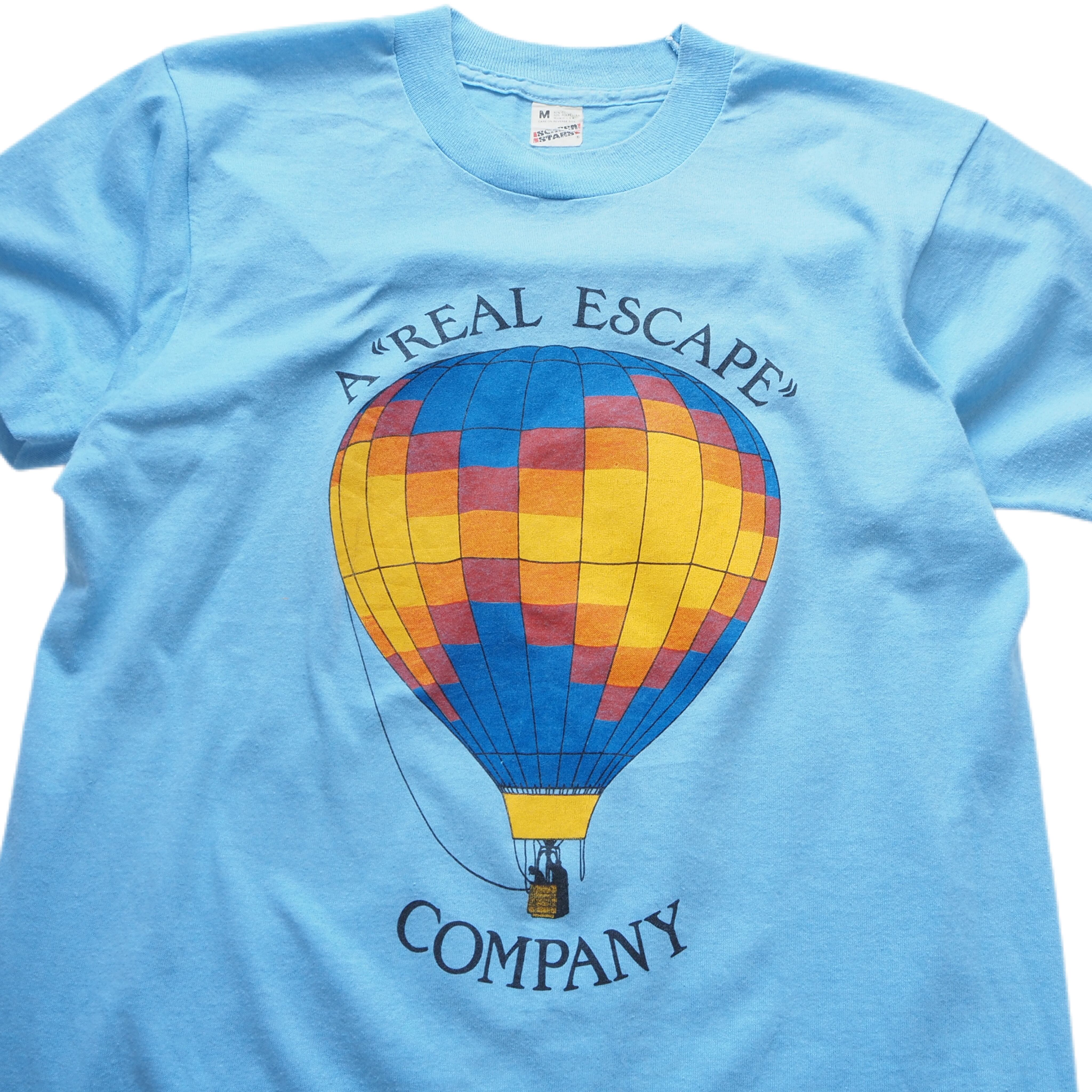 フロントには「A “REAL ESCAPE” COMPANY(本物の逃避体験を提供する会社)」の文字と、空へと浮かぶバルーンが描かれており、当時のイベントTやアクティビティ関連のプロモーション用に制作された可能性のある一着。