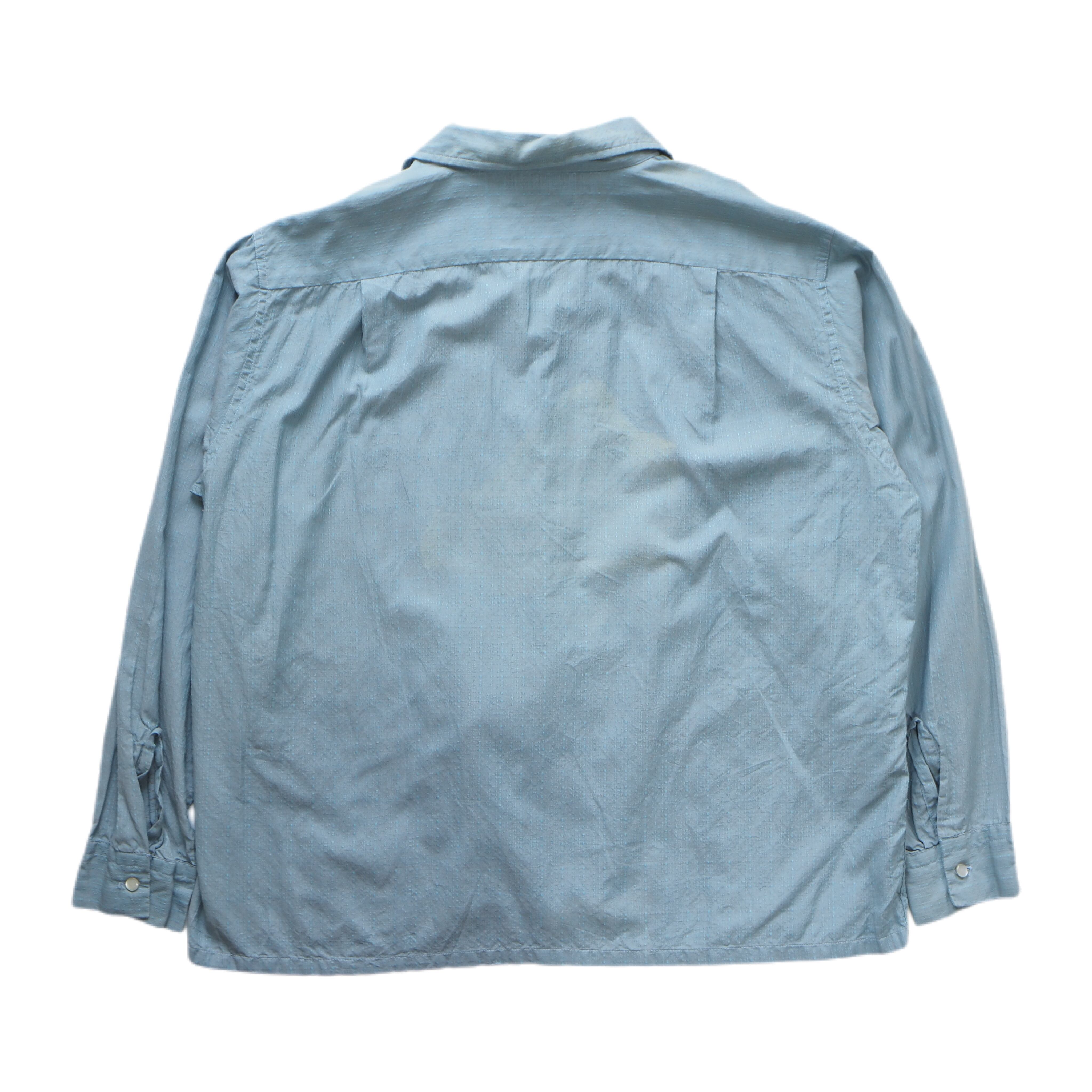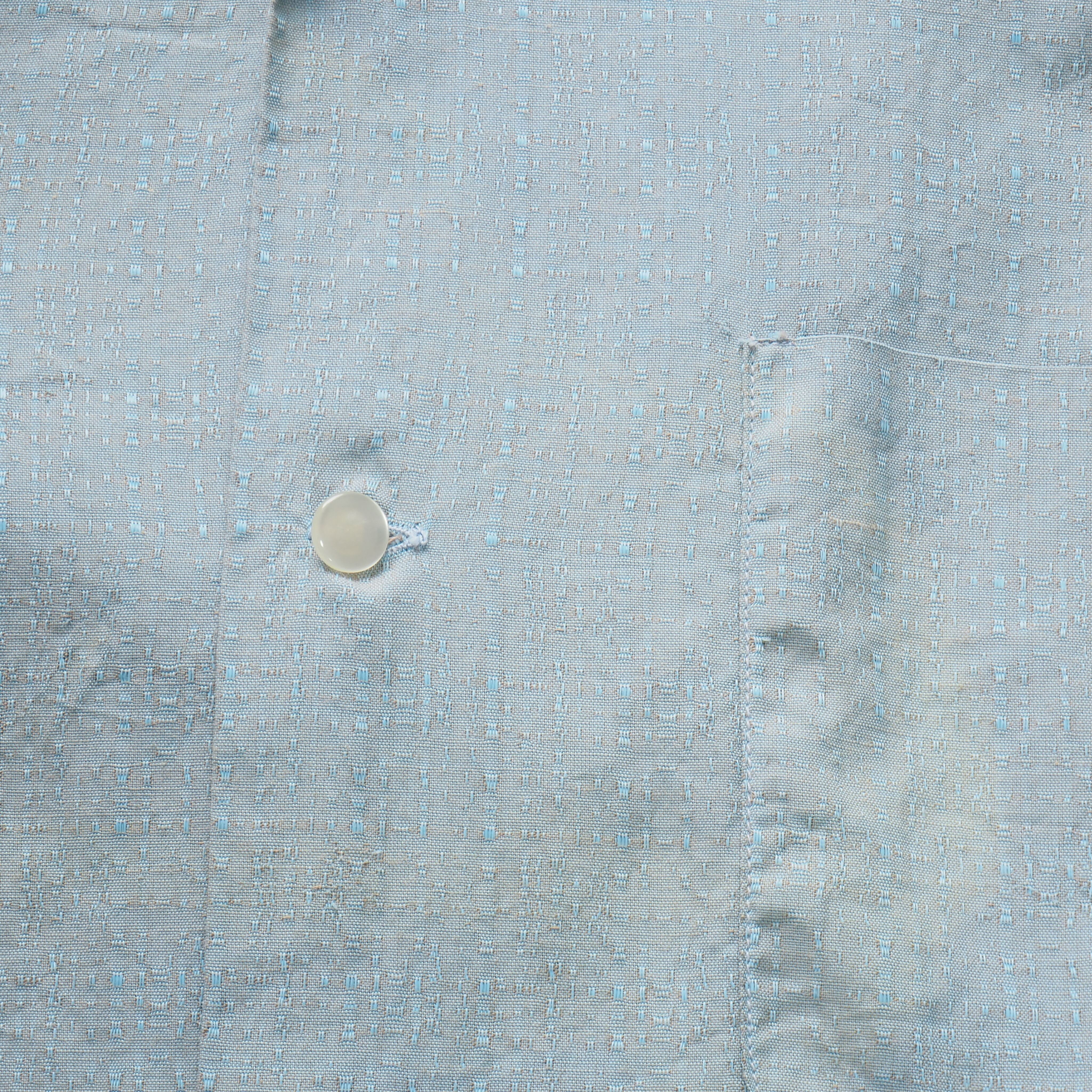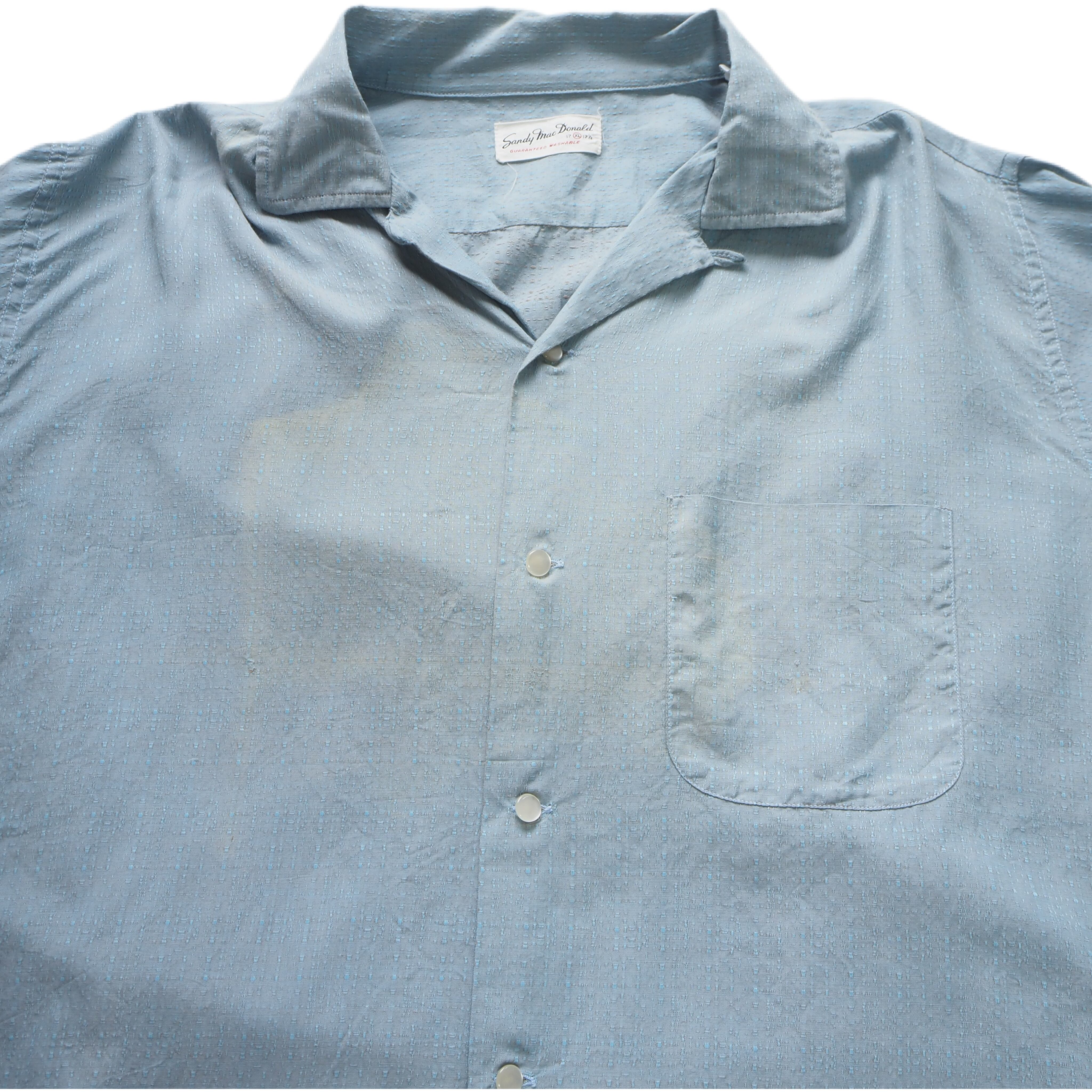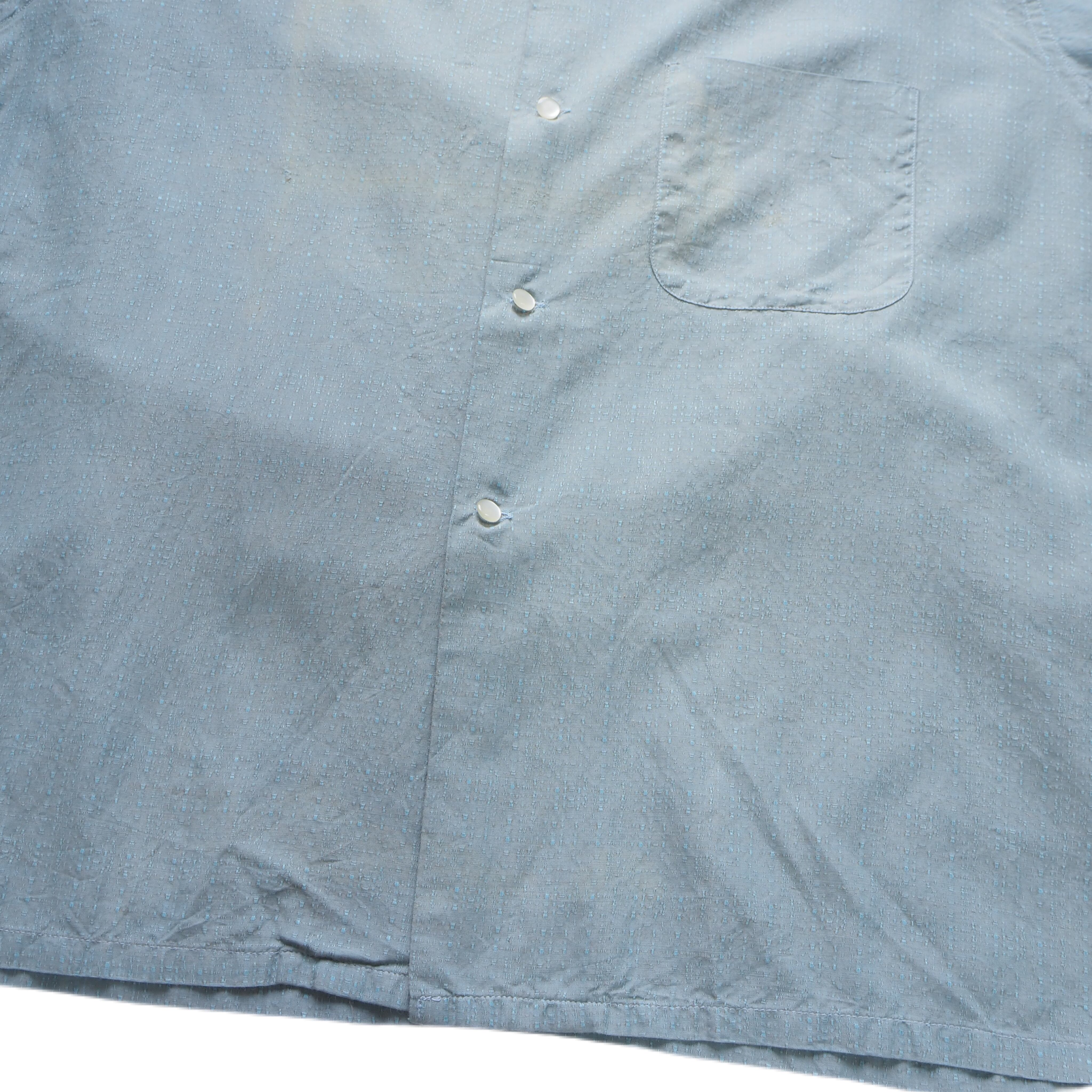 淡いサックスブルーのボディに、凹凸のあるドビー織りが美しく浮かび上がる1950年代のヴィンテージオープンカラーシャツ。