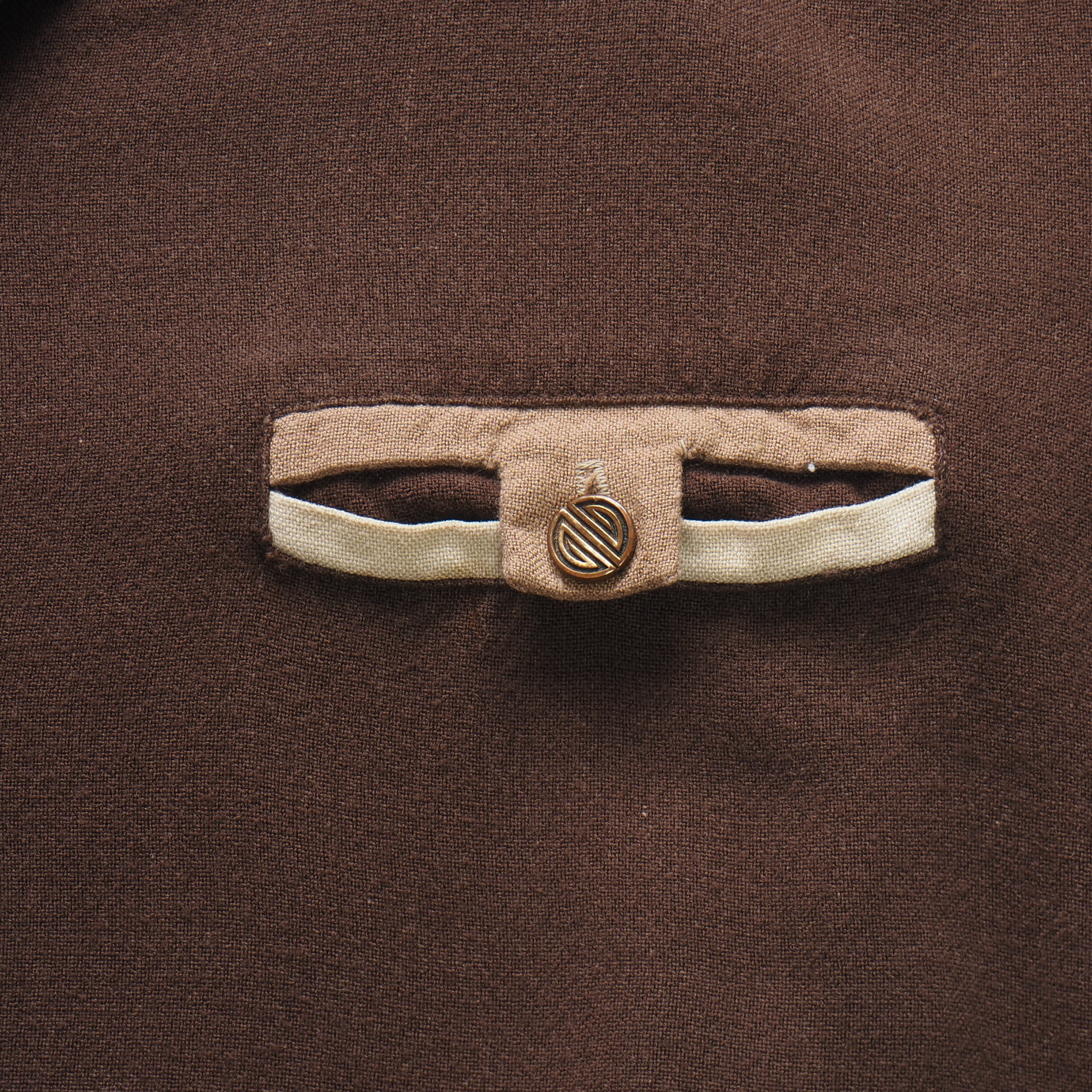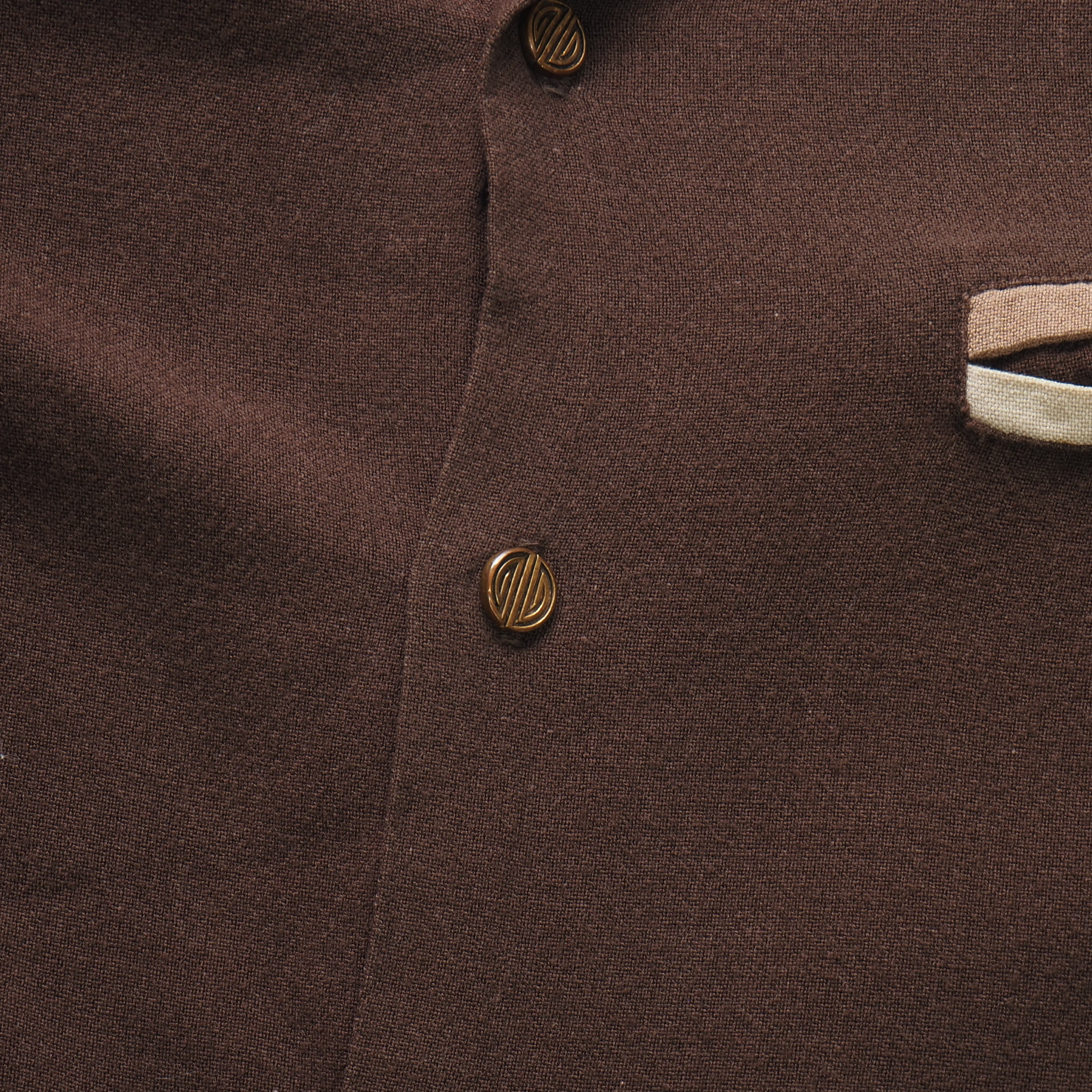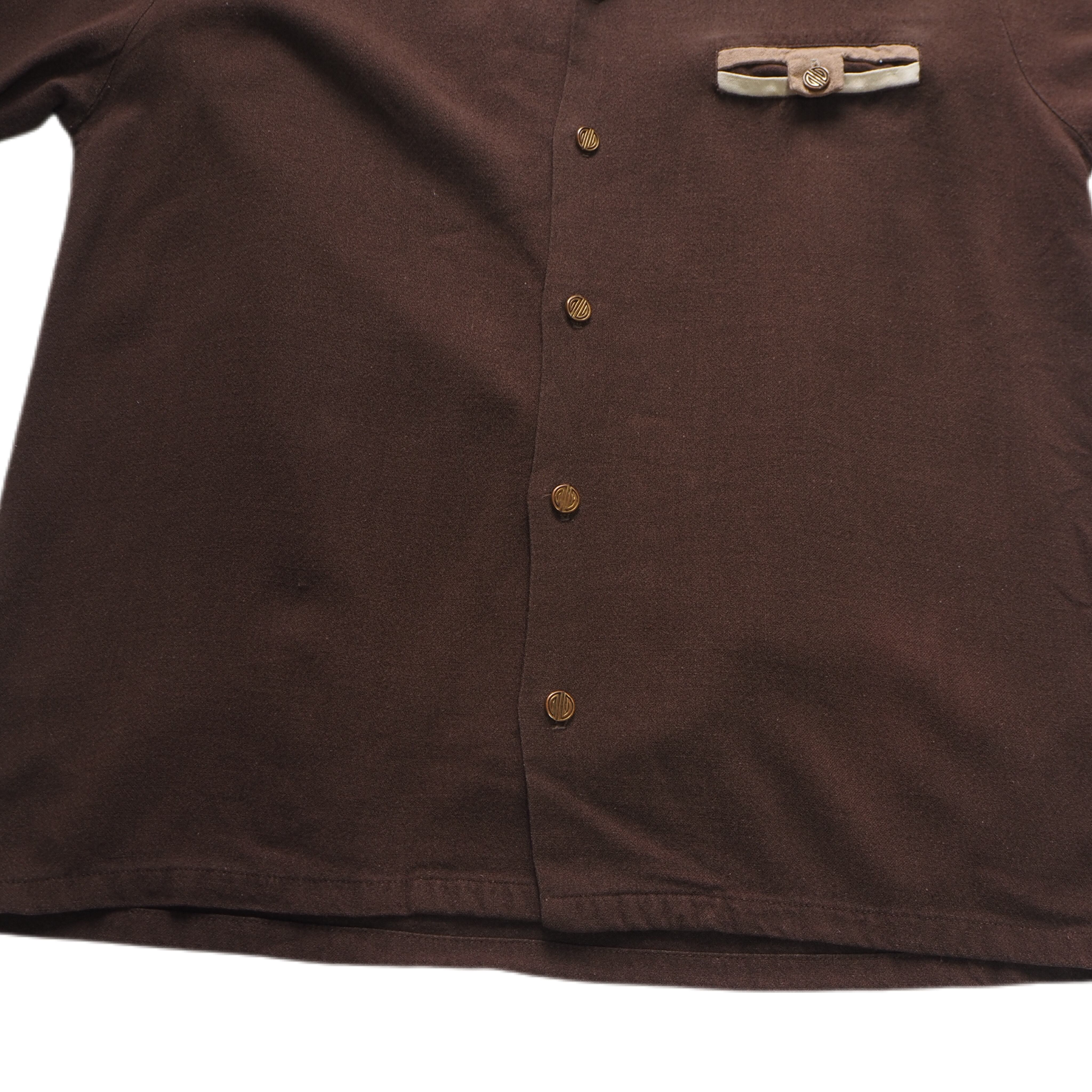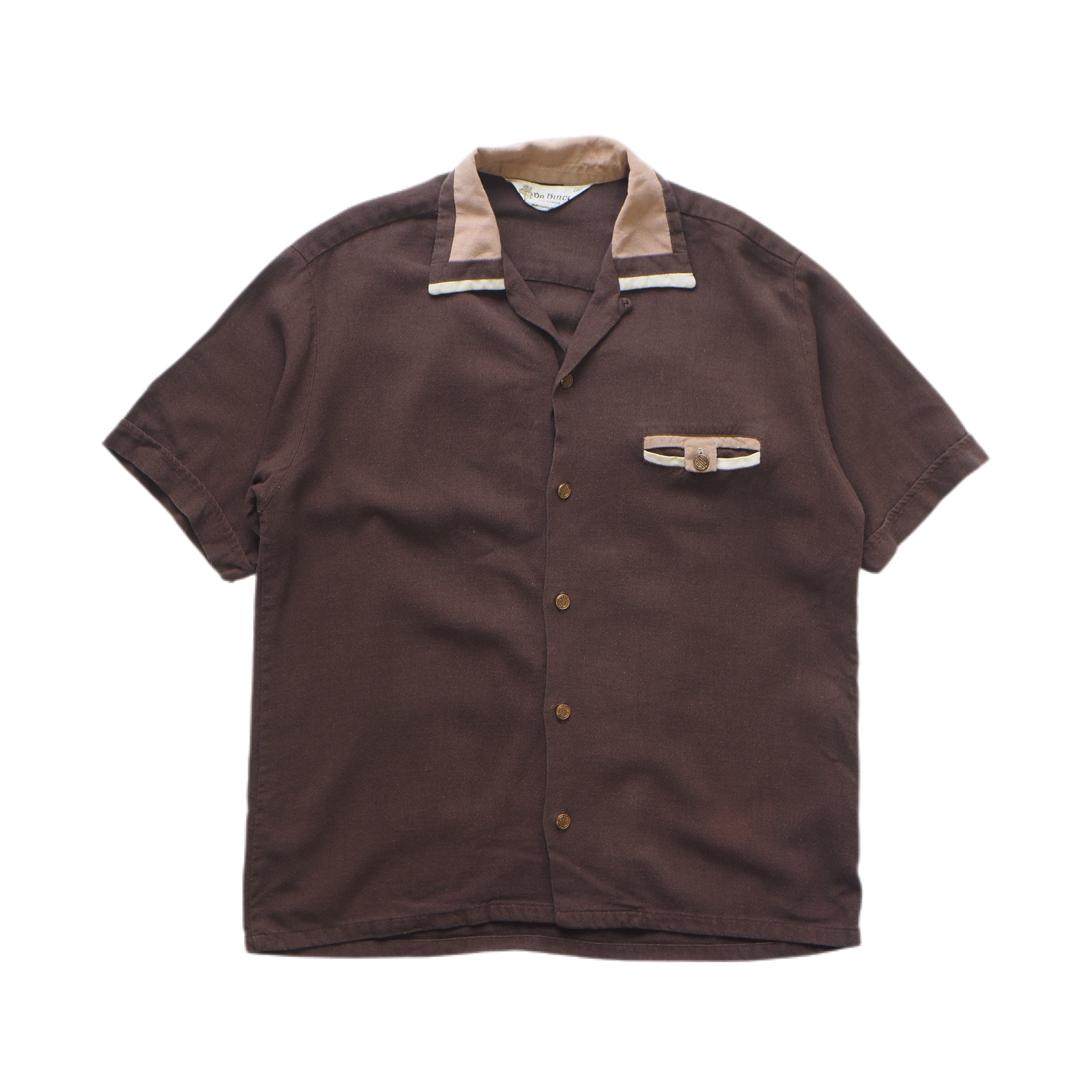 1950年代頃の「Da Vinci CALIFORNIA」製ヴィンテージオープンカラーシャツ。深みのあるダークブラウンのボディに、襟と胸ポケットに配されたベージュとアイボリーの切り替えが映える一着です。