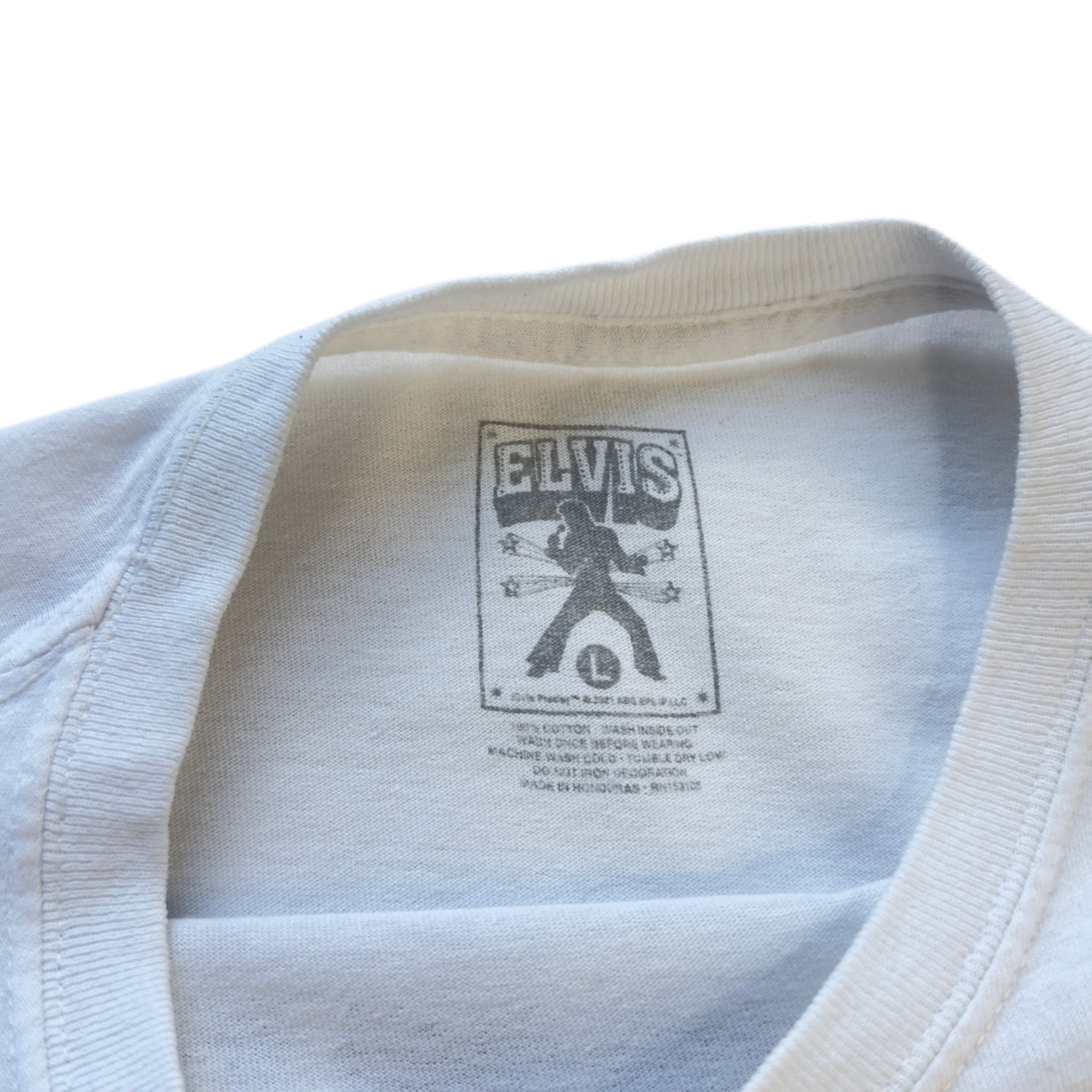 ボディは2000年代のエルヴィス公式ライセンス入りで、タグレス仕様のプリントラベル。柔らかく程よく着込まれたコットン素材で、当時の雰囲気を現代的に再構築したファン必見のアイテムです。