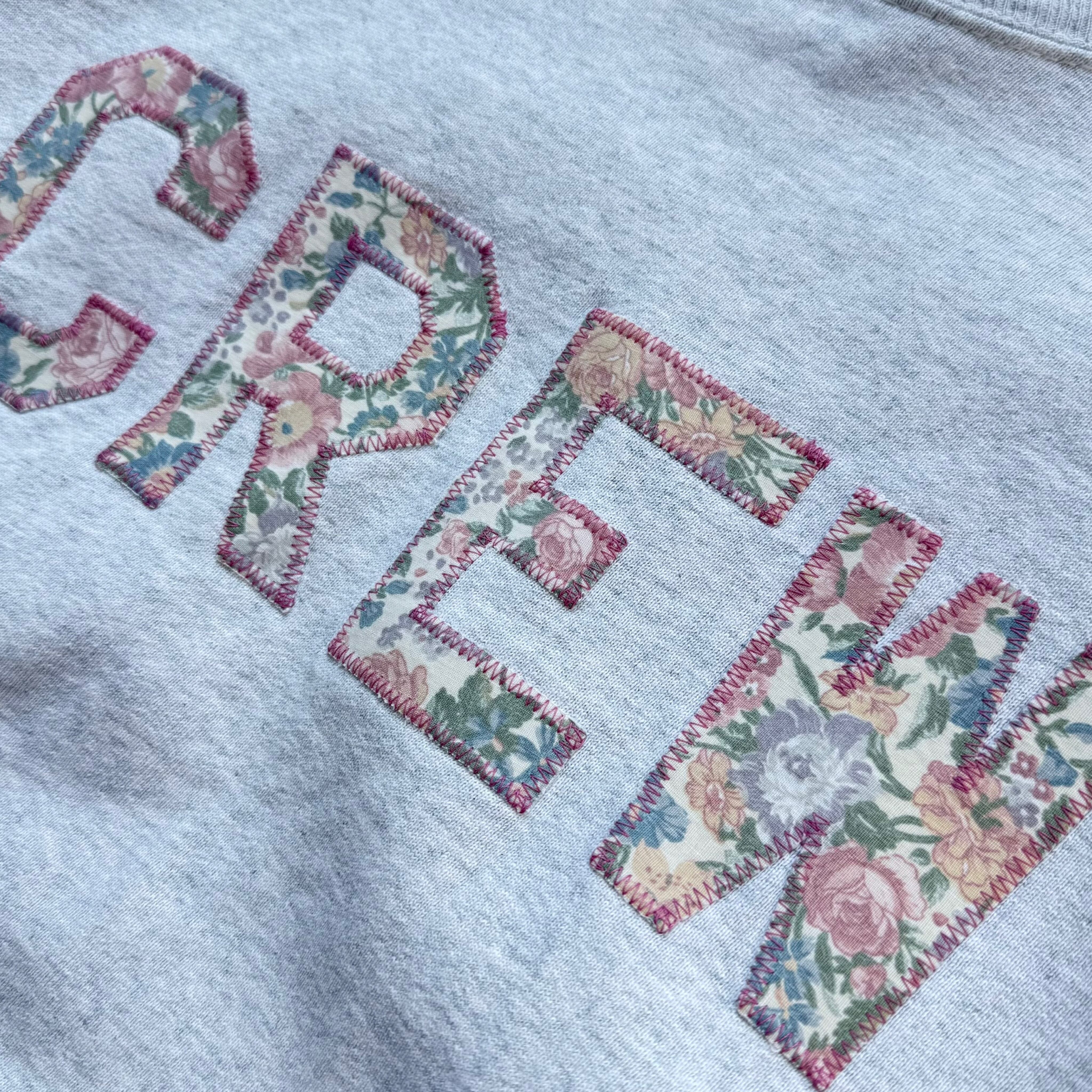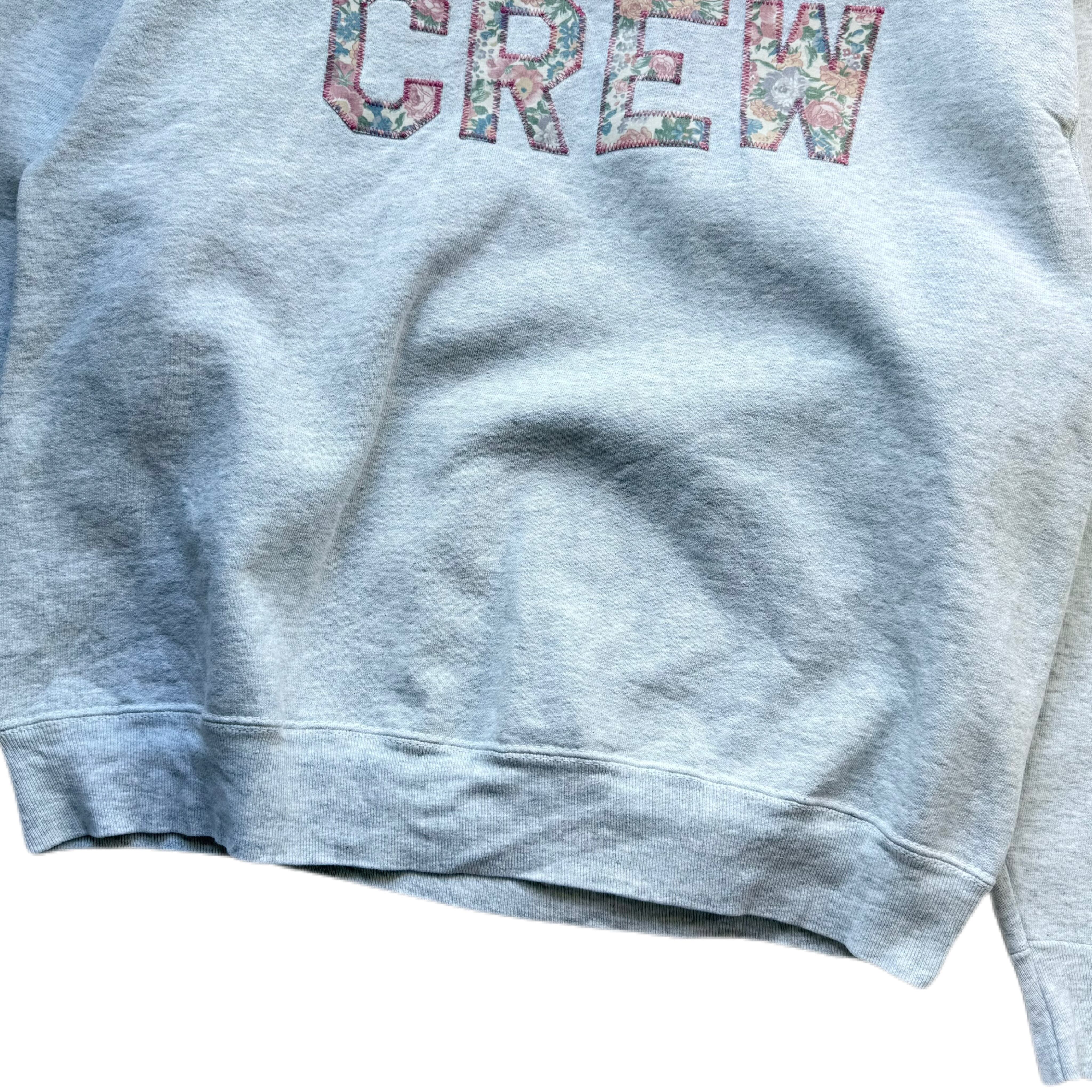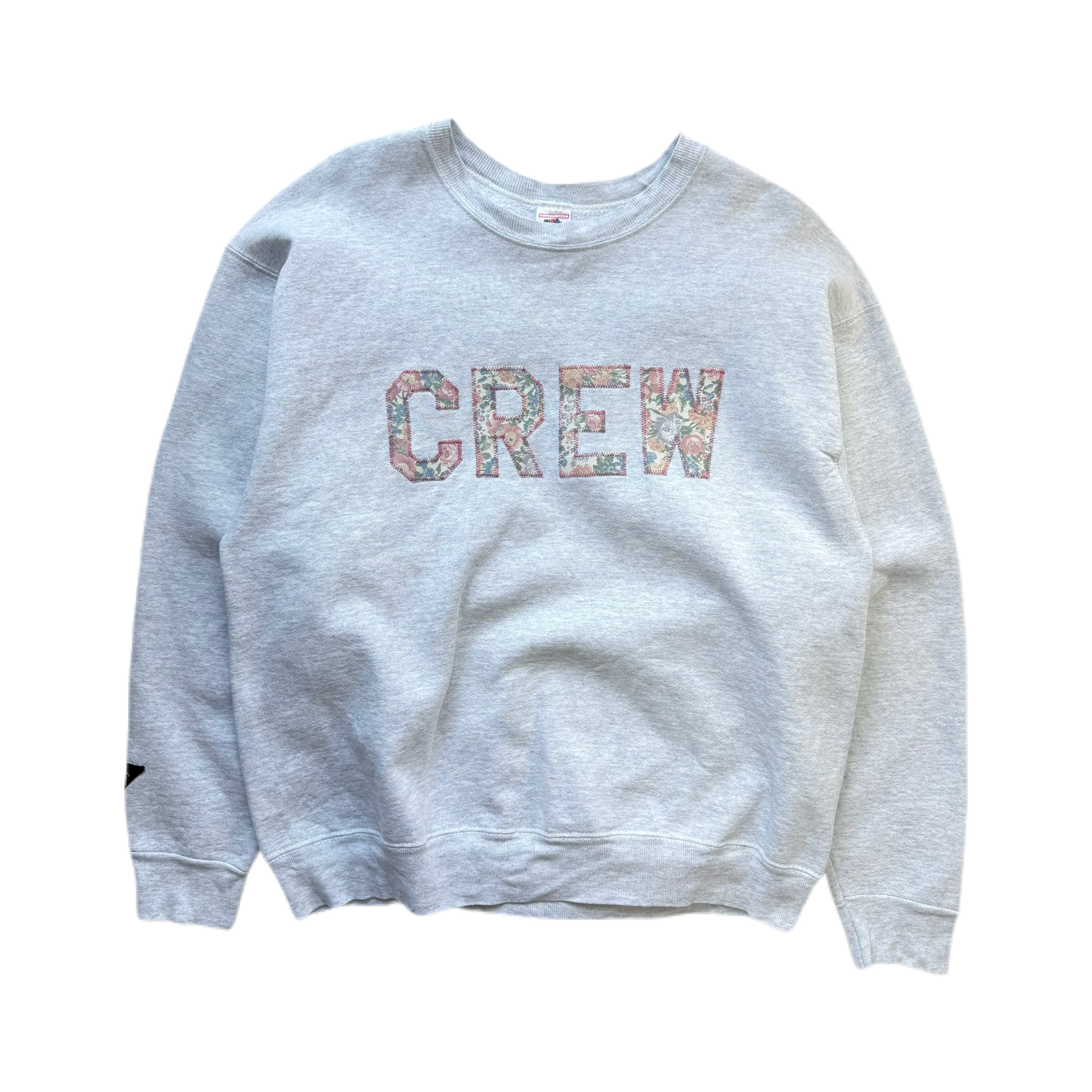 フロントに大きく「CREW」とプリントされており、文字の中に花柄が落とし込まれたユニークなデザインが特徴です。