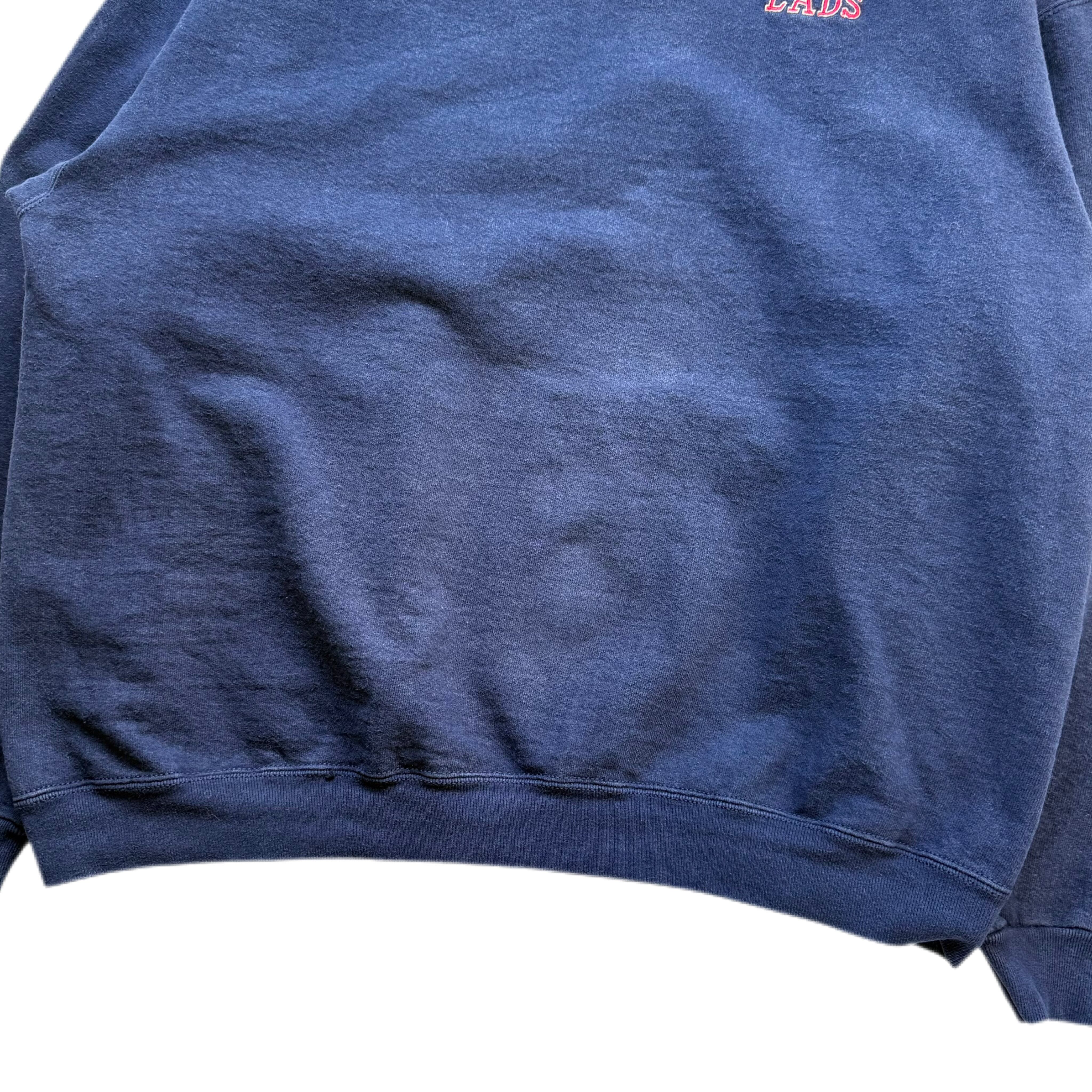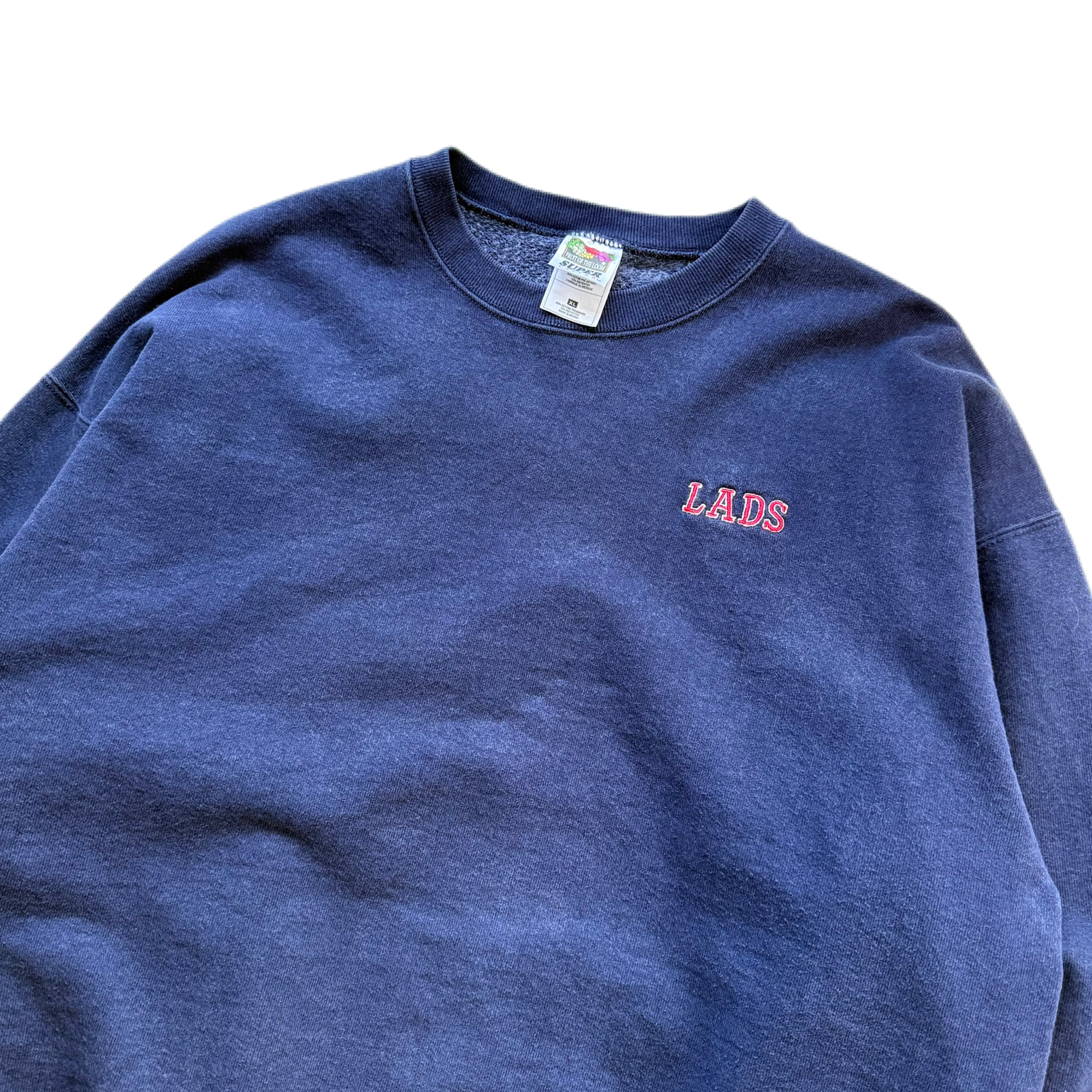 1990年代、FRUIT OF THE LOOM(フルーツオブザルーム)ボディのスウェットシャツ。ネイビーカラーをベースに、胸元に「LADS」と赤の刺繍が入ったシンプルかつ存在感ある一着です。