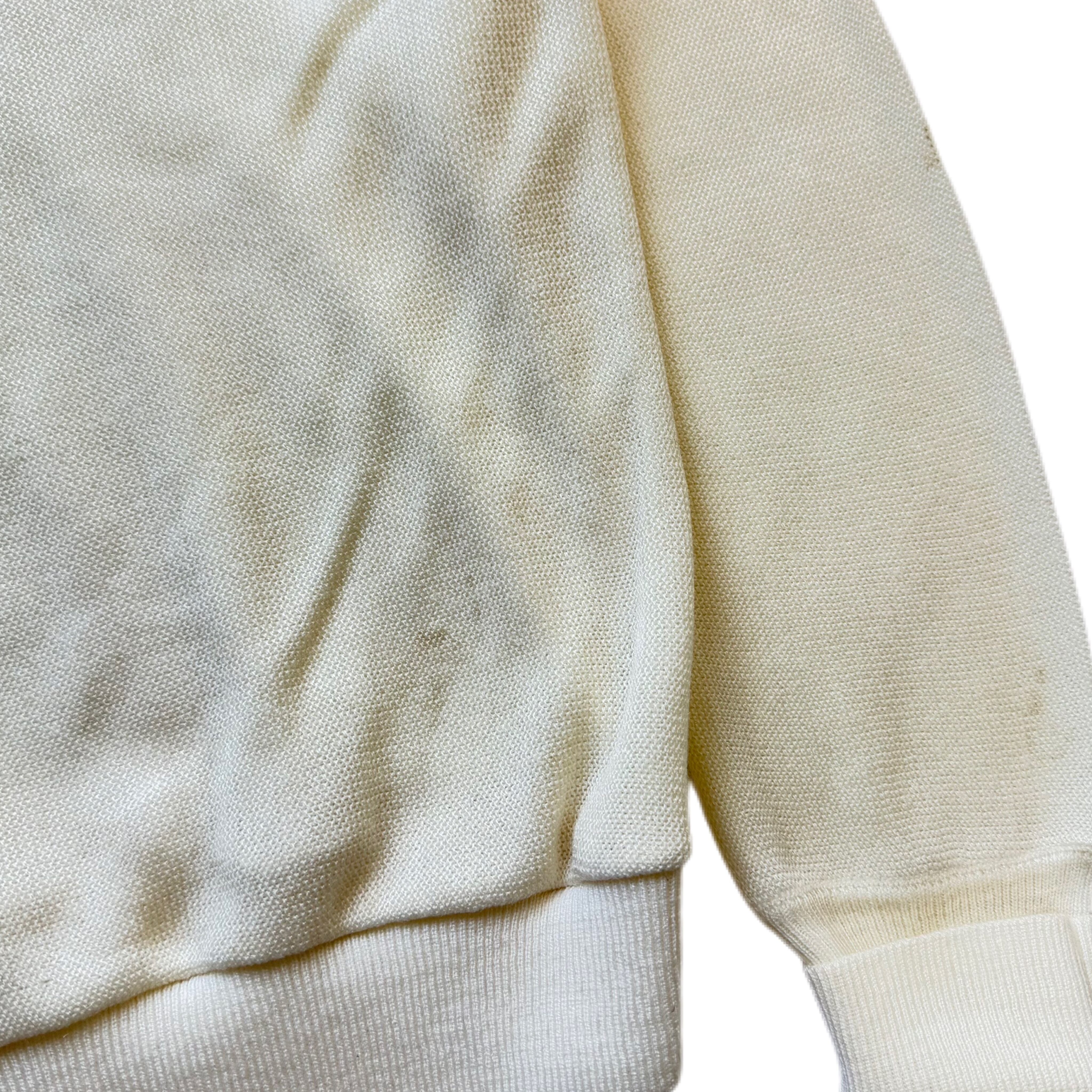 CHEMISE LACOSTE(シュミーズ・ラコステ)、通称フレラコのVネックニットセーター。生成りに近いナチュラルなホワイトカラーで、胸元には銀刺繍のワニロゴがあしらわれています。深めに開いたVネックがクラシカルかつ品のある雰囲気を演出し、シャツとのレイヤードにも相性抜群。