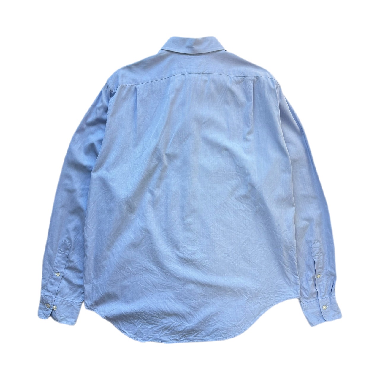 クラシックなレギュラーカラーと落ち着いたブルーの色味。ワードローブに一枚あると重宝するアイテムです。