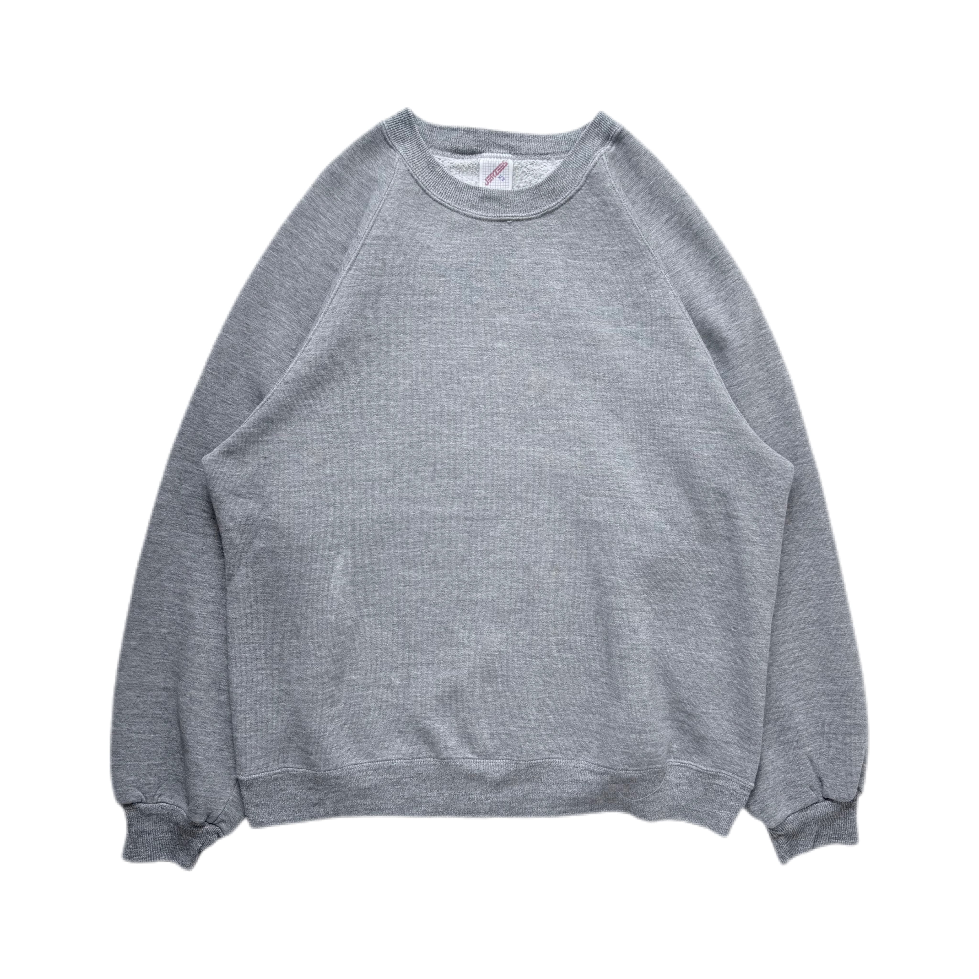Jerzees(ジャージーズ)のラグランスウェットシャツ。80年代~90年代頃のMADE IN USAタグ付きで、グレーの無地ボディは幅広いスタイリングに馴染むベーシックな一着です。
