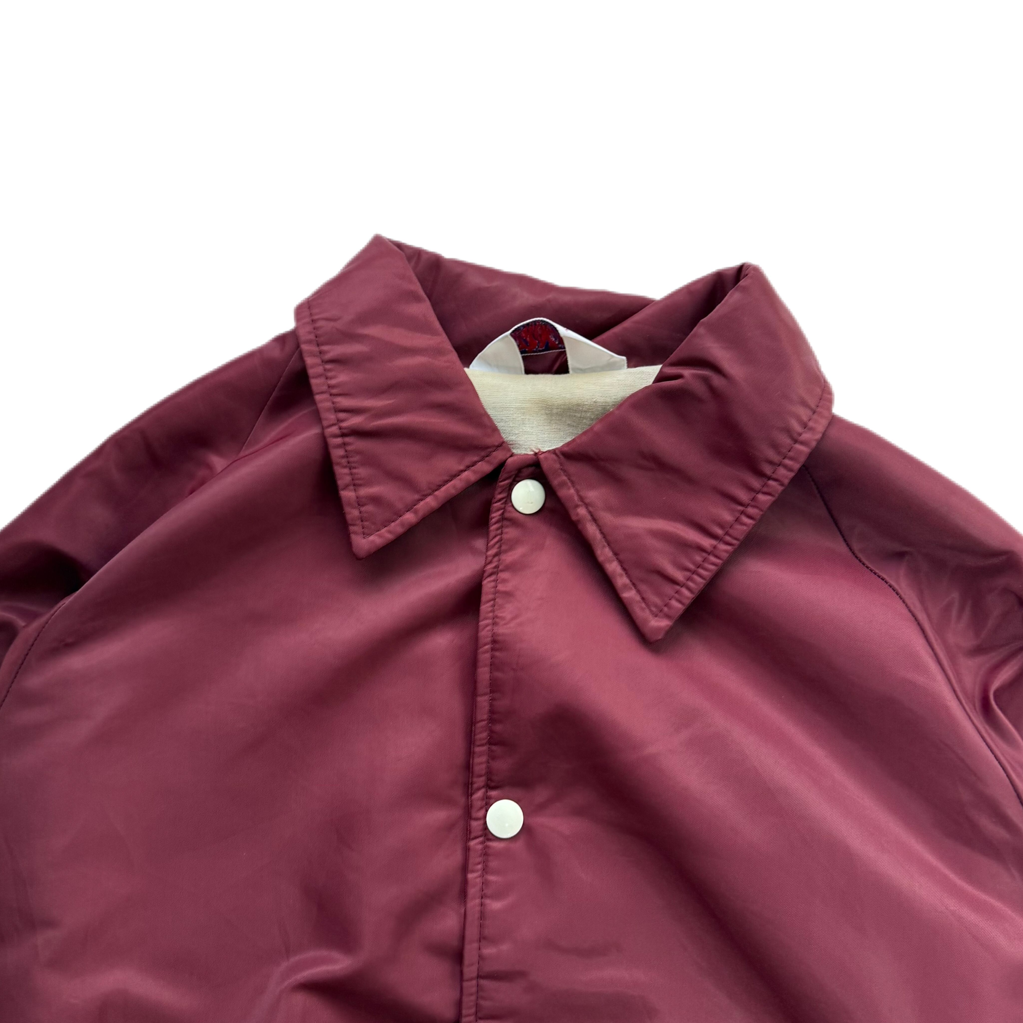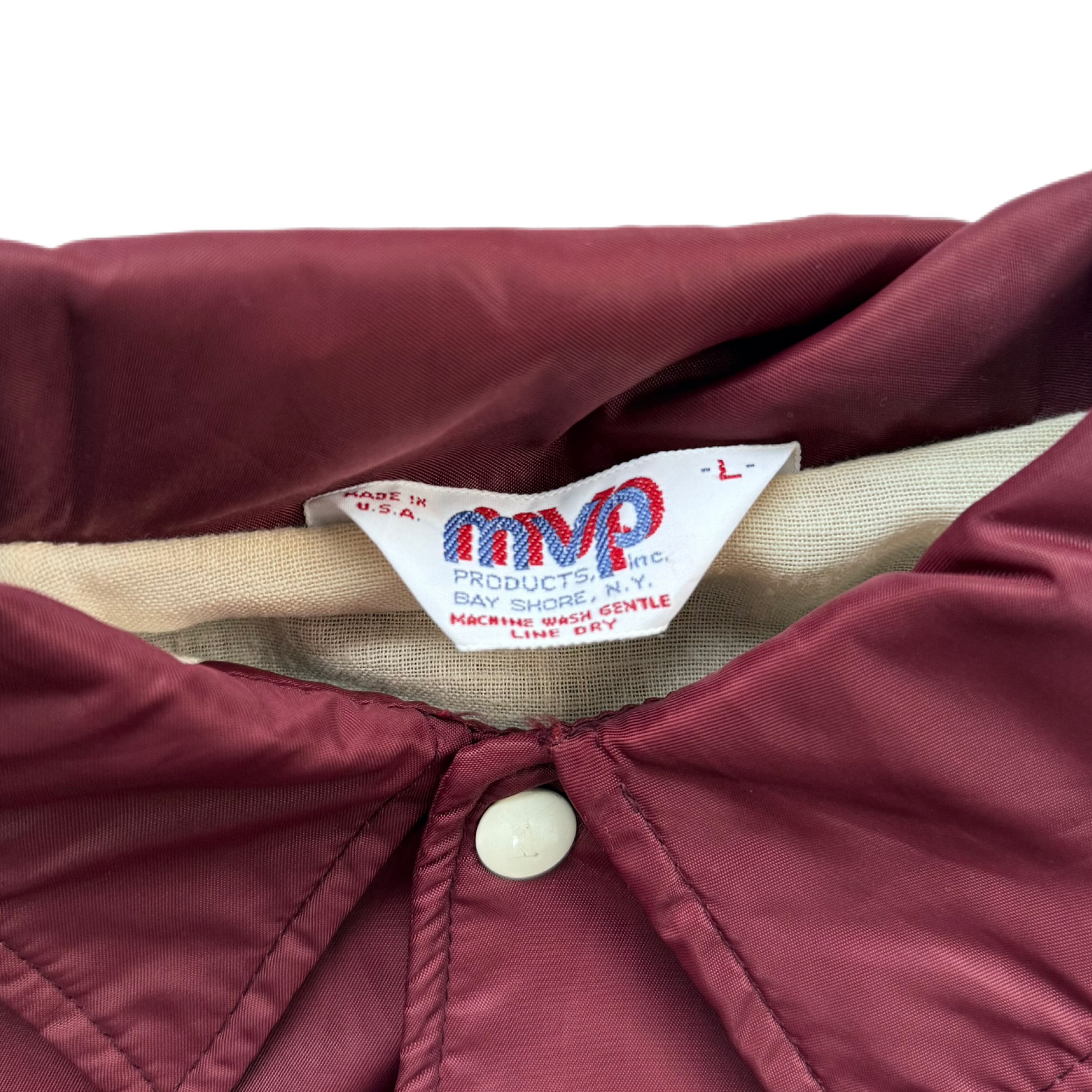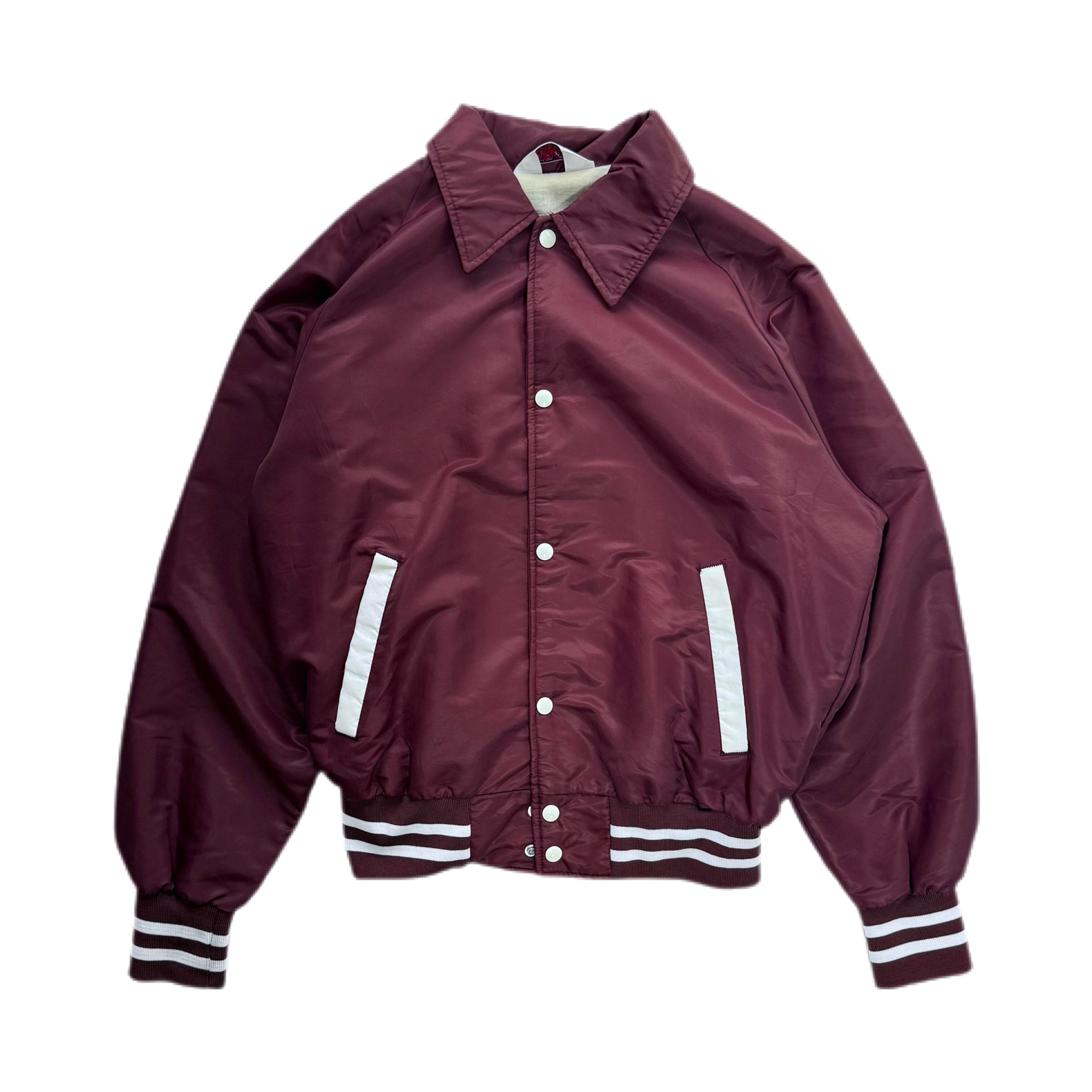 アメリカ製 MVP PRODUCTS, Inc. のナイロンジャケット。バーガンディカラーにホワイトのラインリブが映えるクラシックなデザインです。