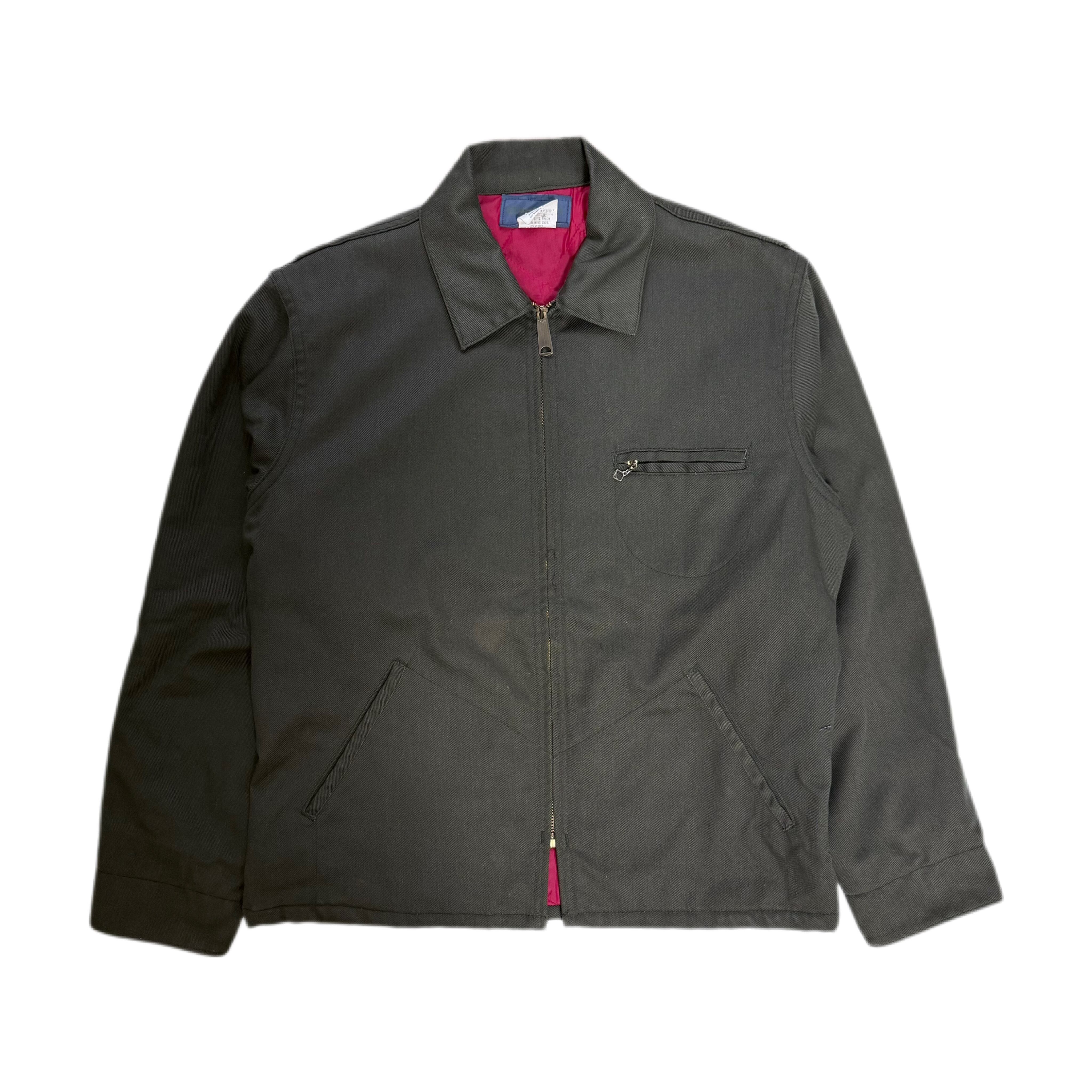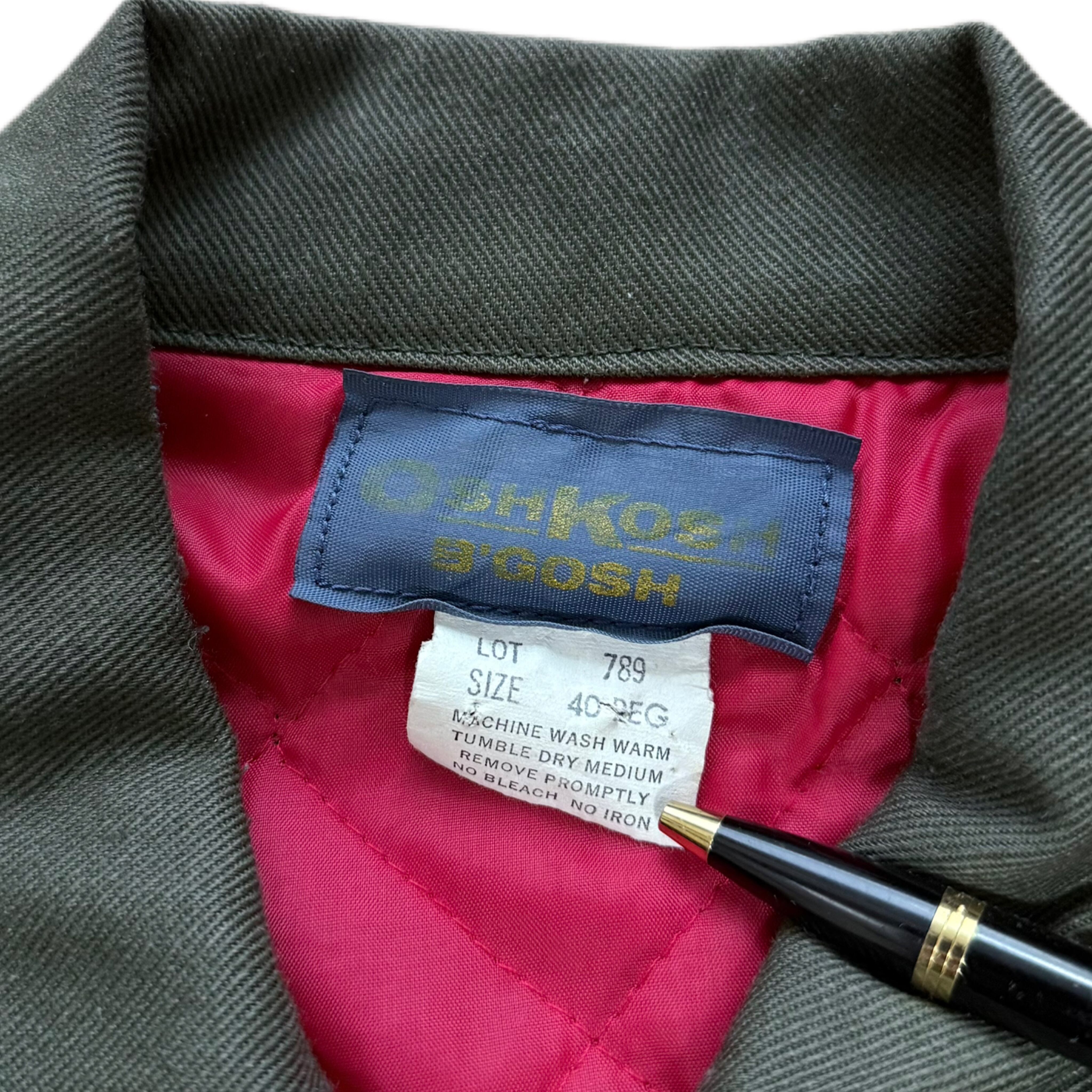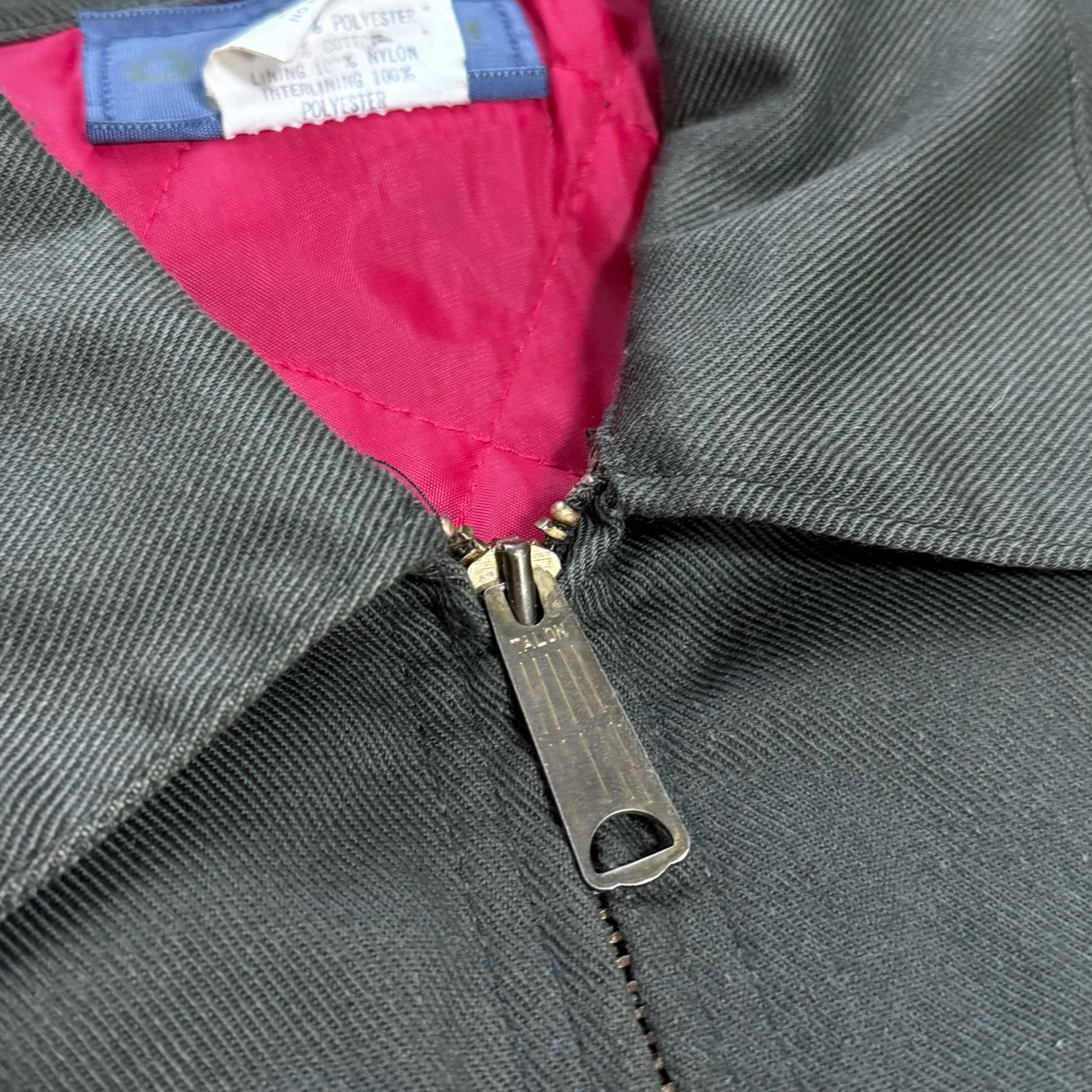 アメリカを代表するワークブランド、OSHKOSH B’GOSHによる70sワークジャケット。ポリ×コットンのタフなツイルに、発色の良いレッドのキルティングライナーという、当時ならではの配色&素材感。フロントは棒TALON、胸にはチェーン引き手付きジップポケット、ハンドポケットはやや斜め付き。60s〜70sのハンティング/ショップコートのディテールを踏襲した、実用寄りの設計が魅力です。
