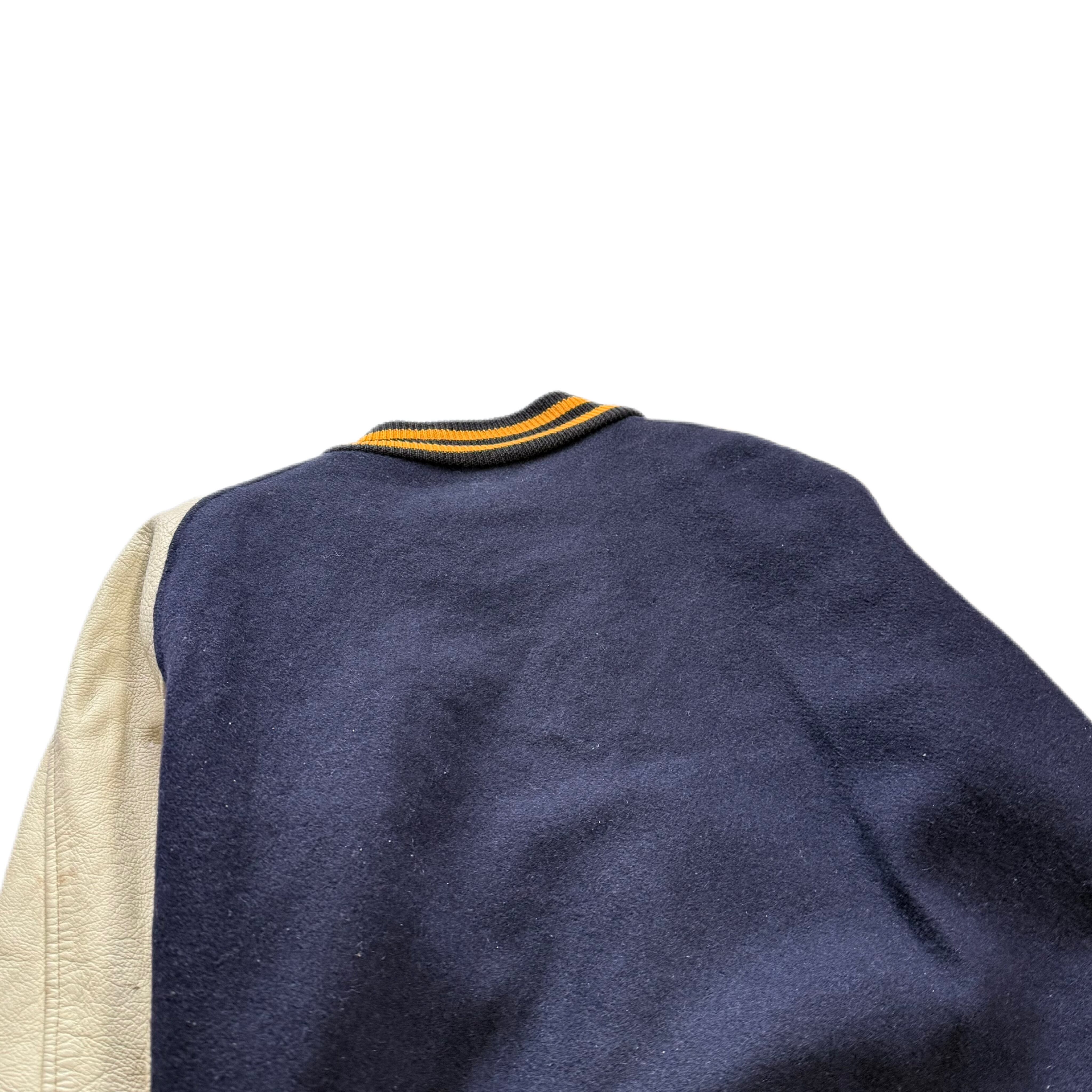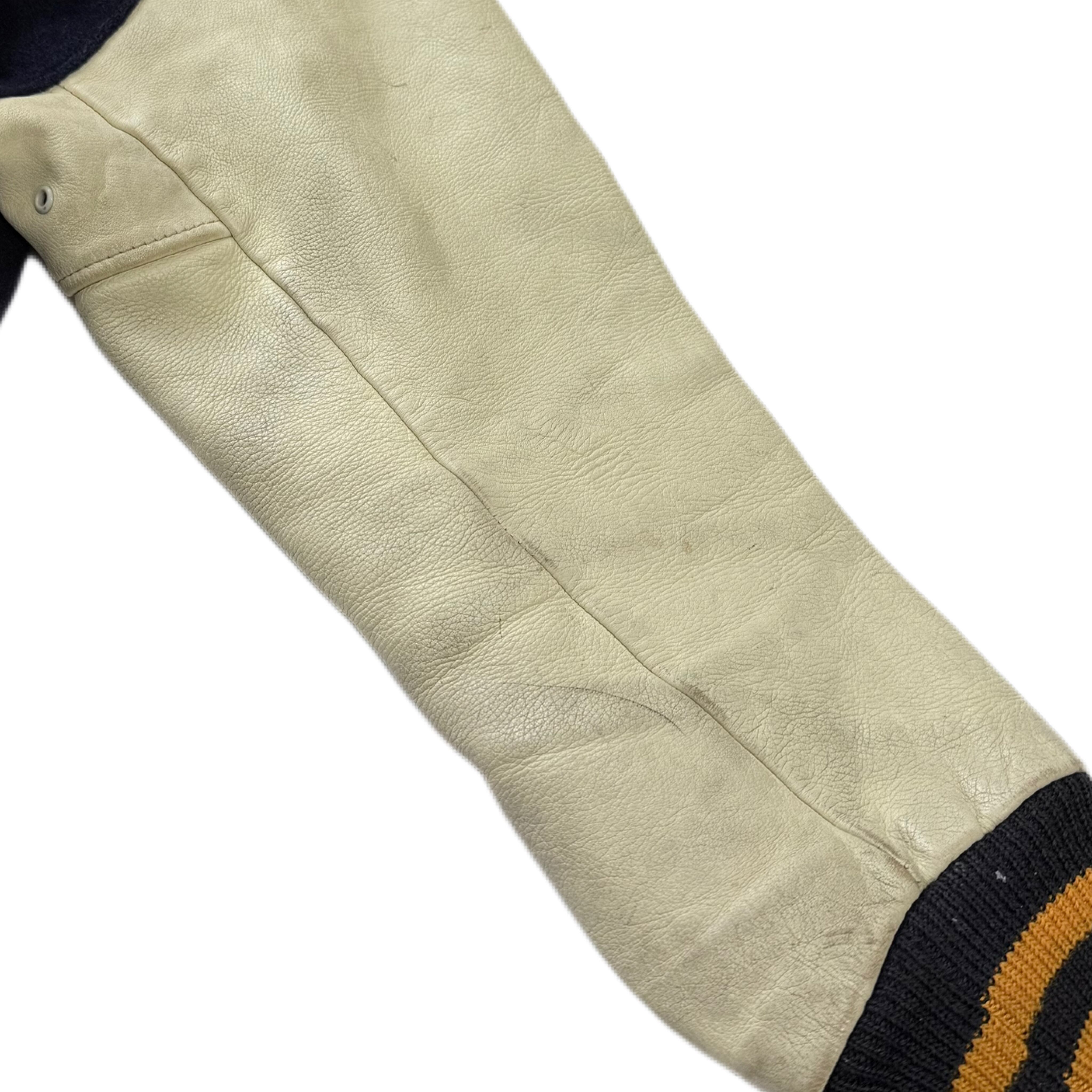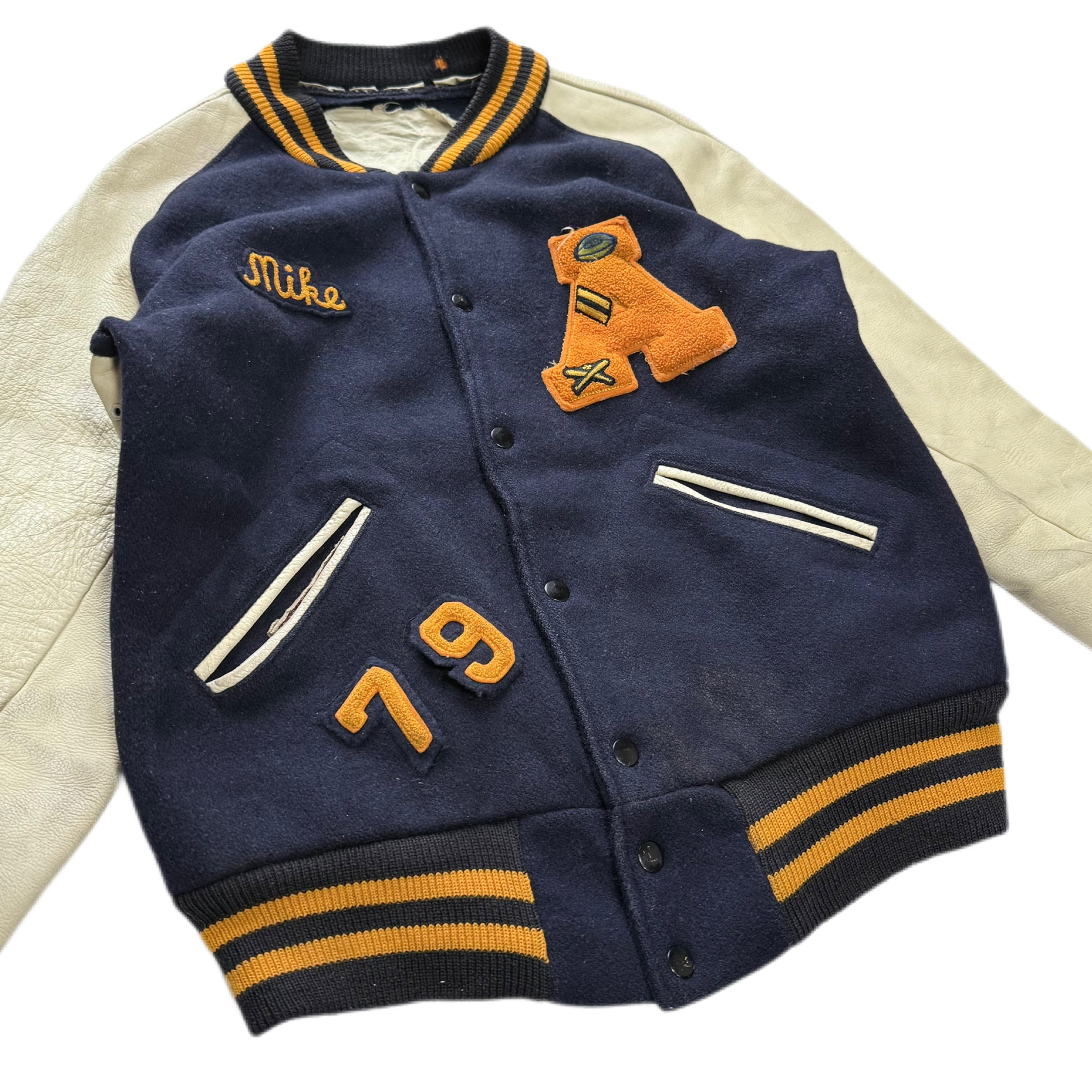 肉厚なウールボディや上質なレザースリーブなど、当時のスクールジャケットらしい堅牢な作りが特徴の一着。ネイビーのウールボディに、アイボリーのレザースリーブという王道の配色。胸元には“A”のシニールワッペンと、ネーム刺繍「Mike」が入ります。