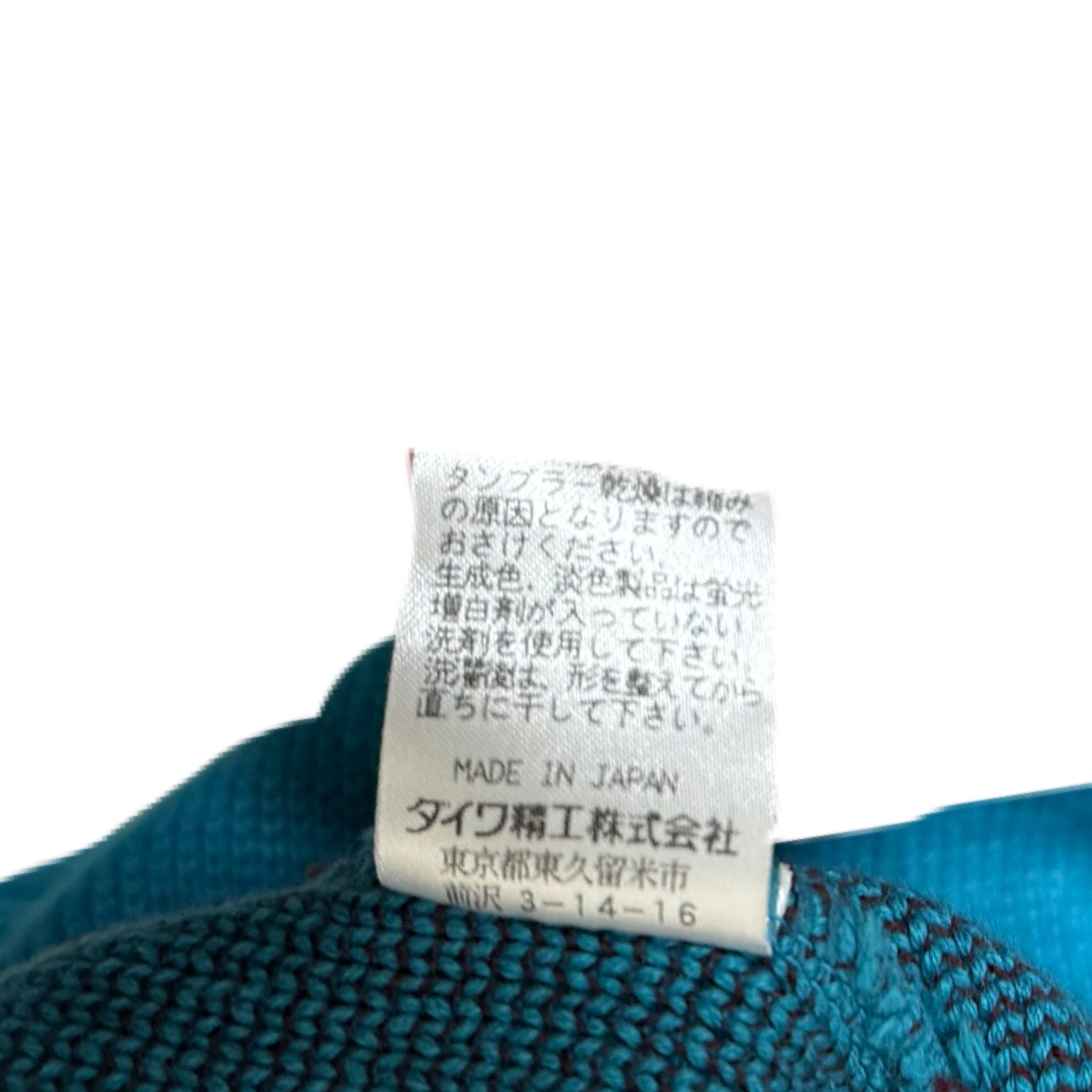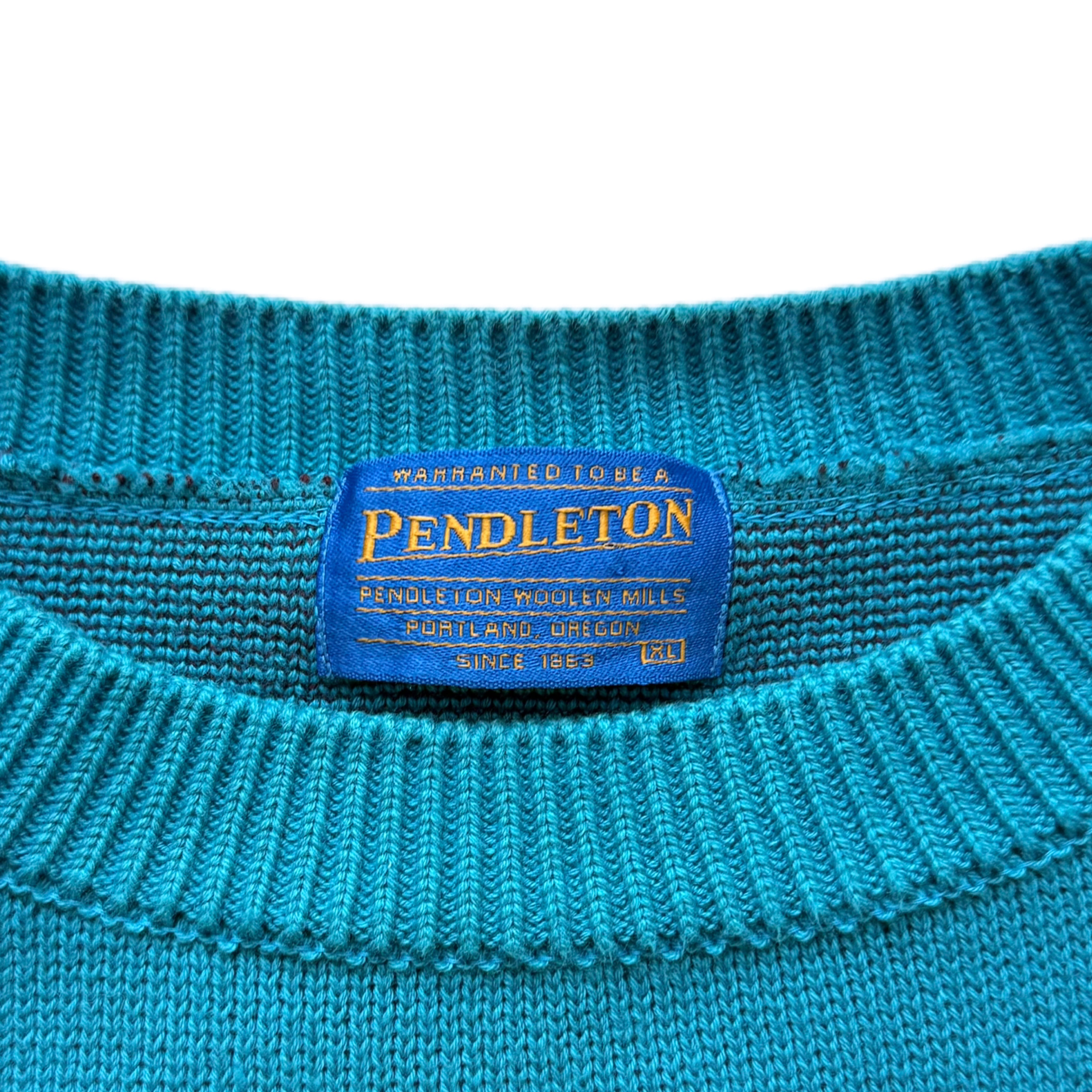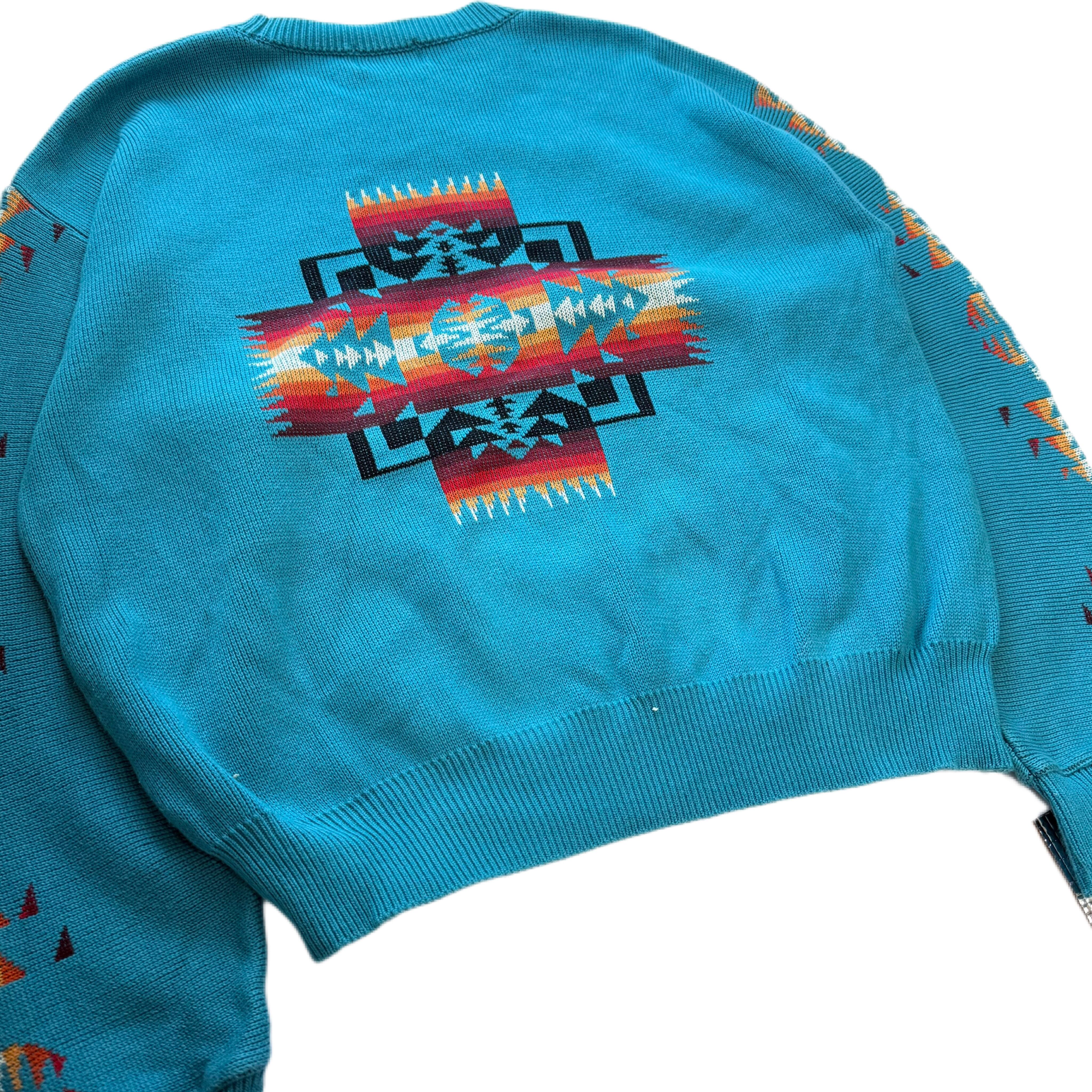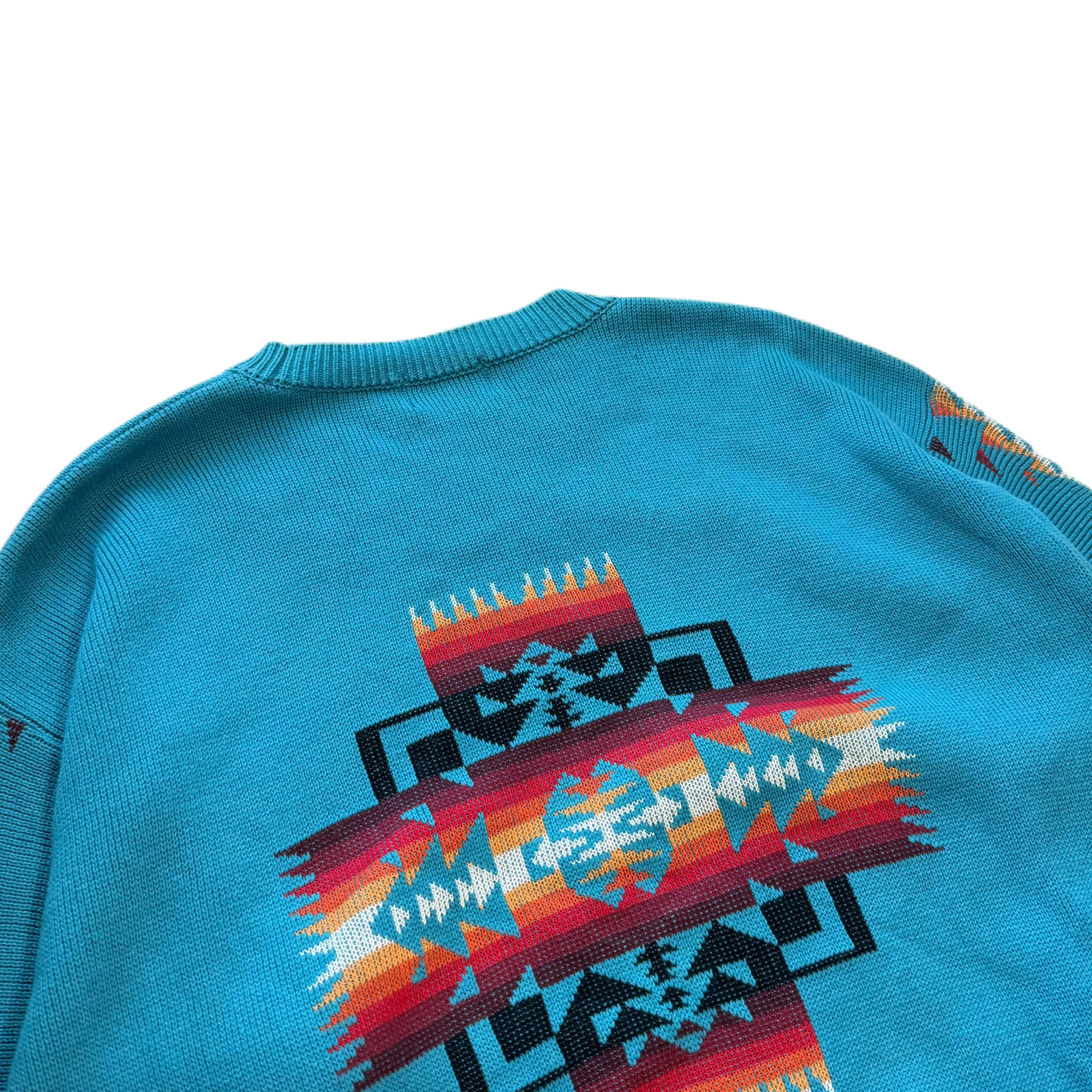 ターコイズブルーのボディに、フロントと袖へ配されたネイティブ調モチーフが目を引く一着。Pendletonらしい配色バランスと幾何学的なデザインが際立つ、存在感のあるニットです。