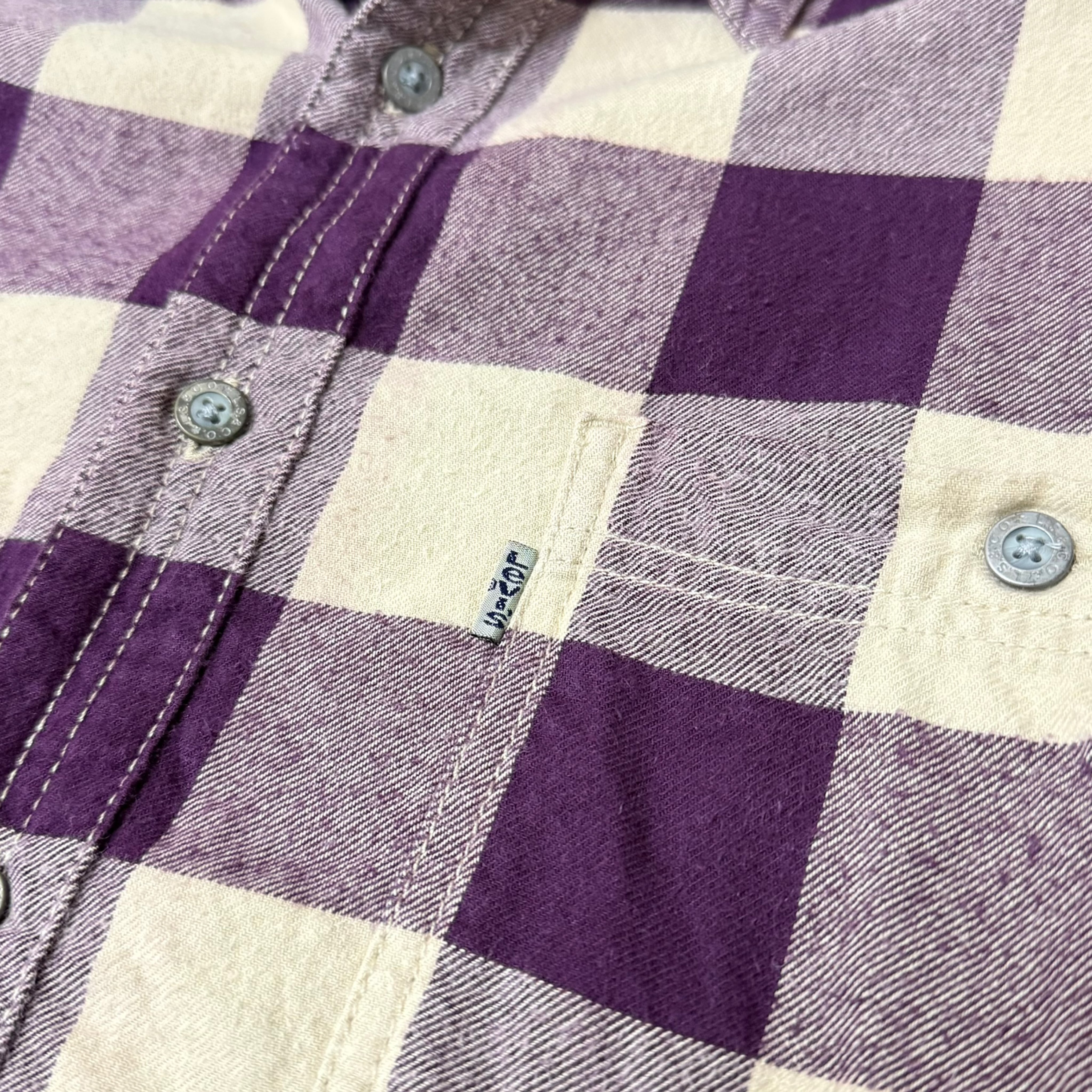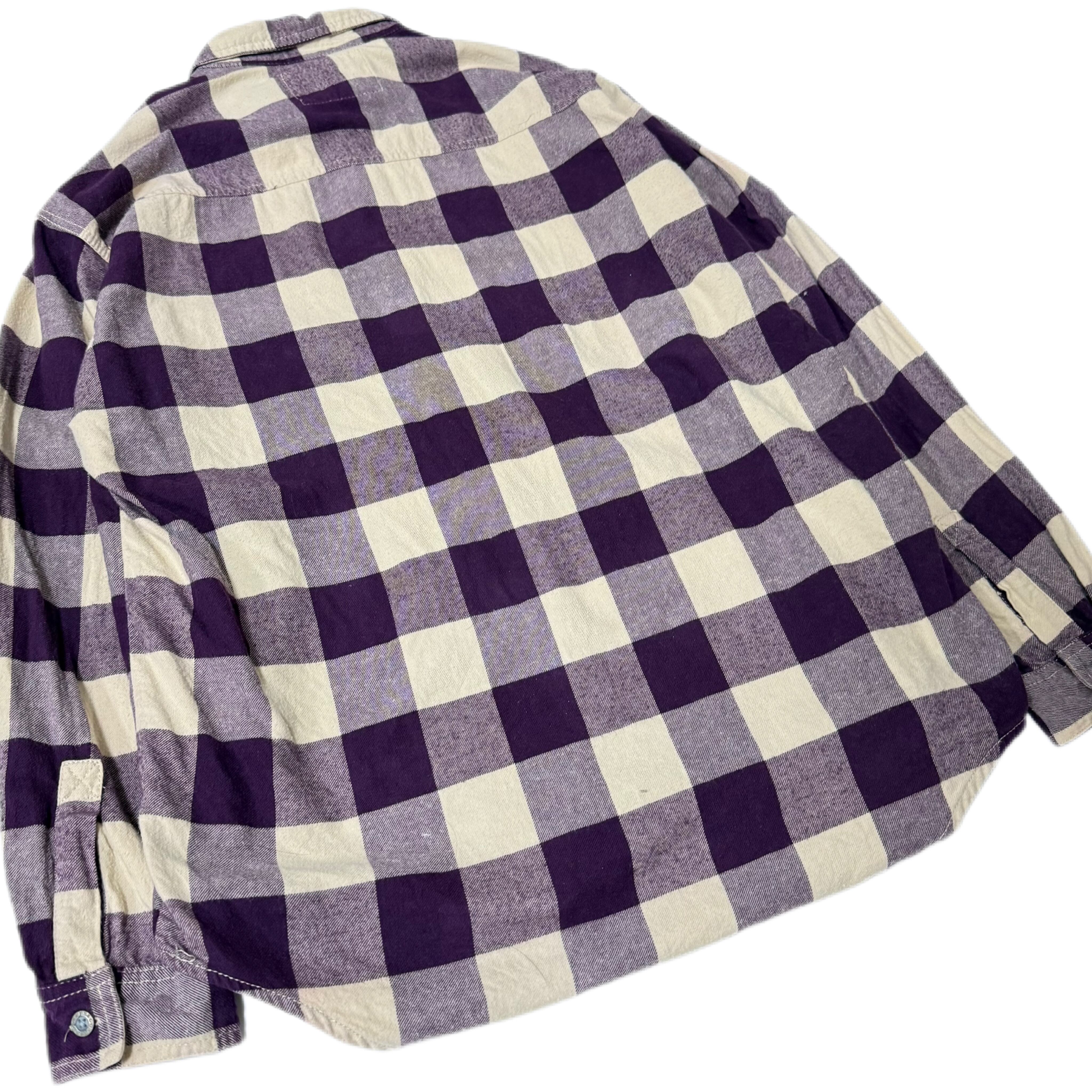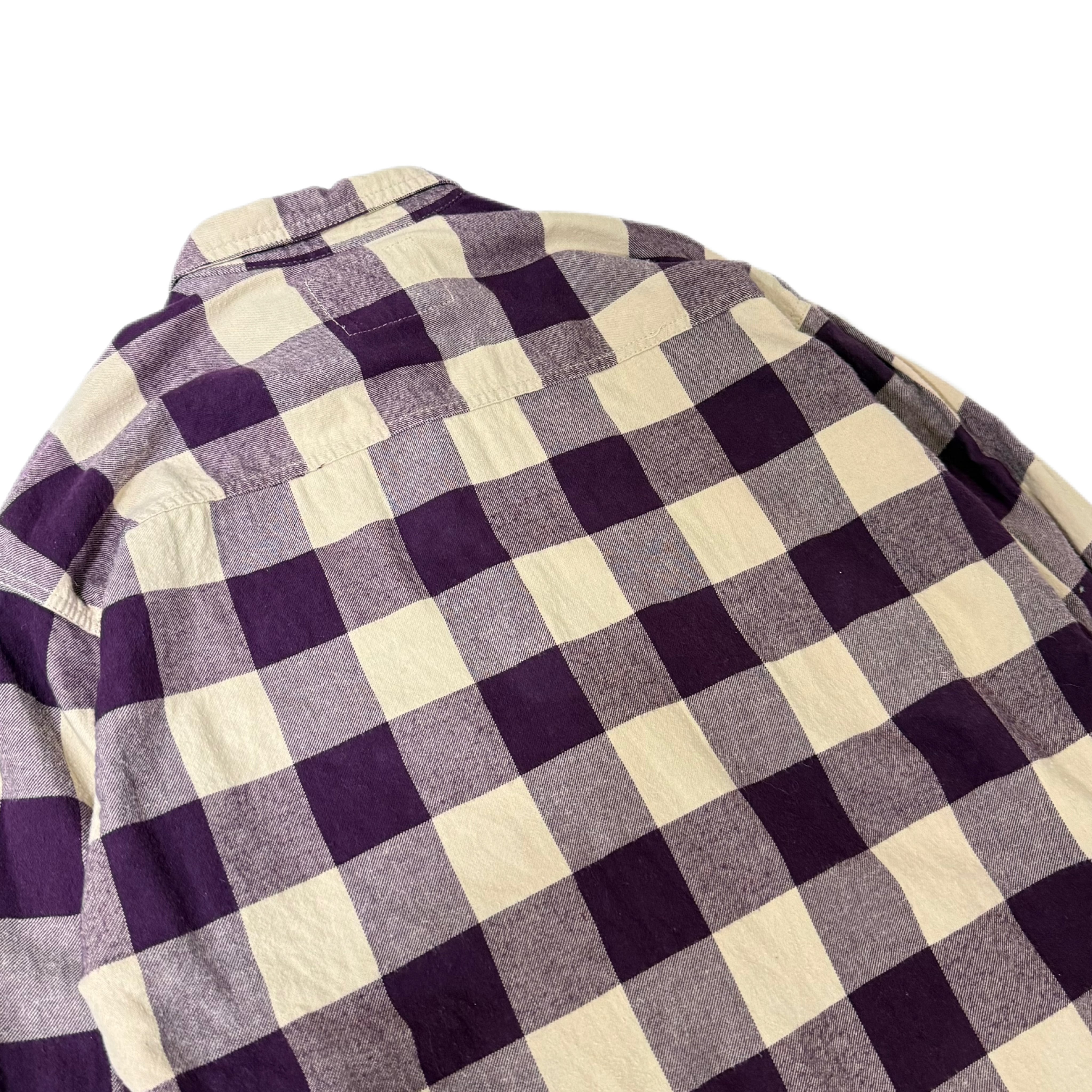 パープルとアイボリーで構成された大判のバッファローチェックが印象的な一着。クラシックなワークシャツのディテールをベースにしながらも、当時には無い配色バランスです。