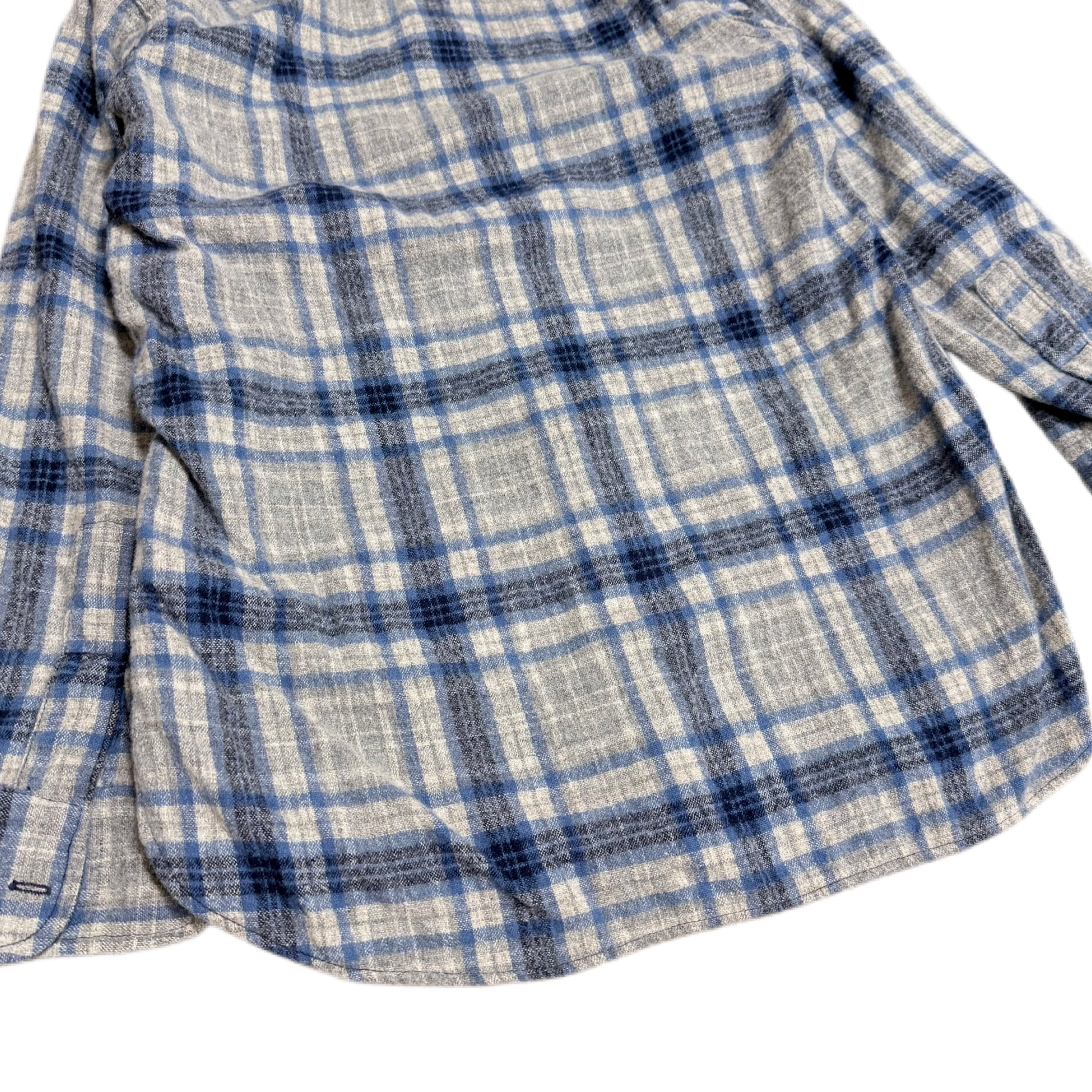 ブルー×グレーの落ち着いた配色が印象的なシャツ。