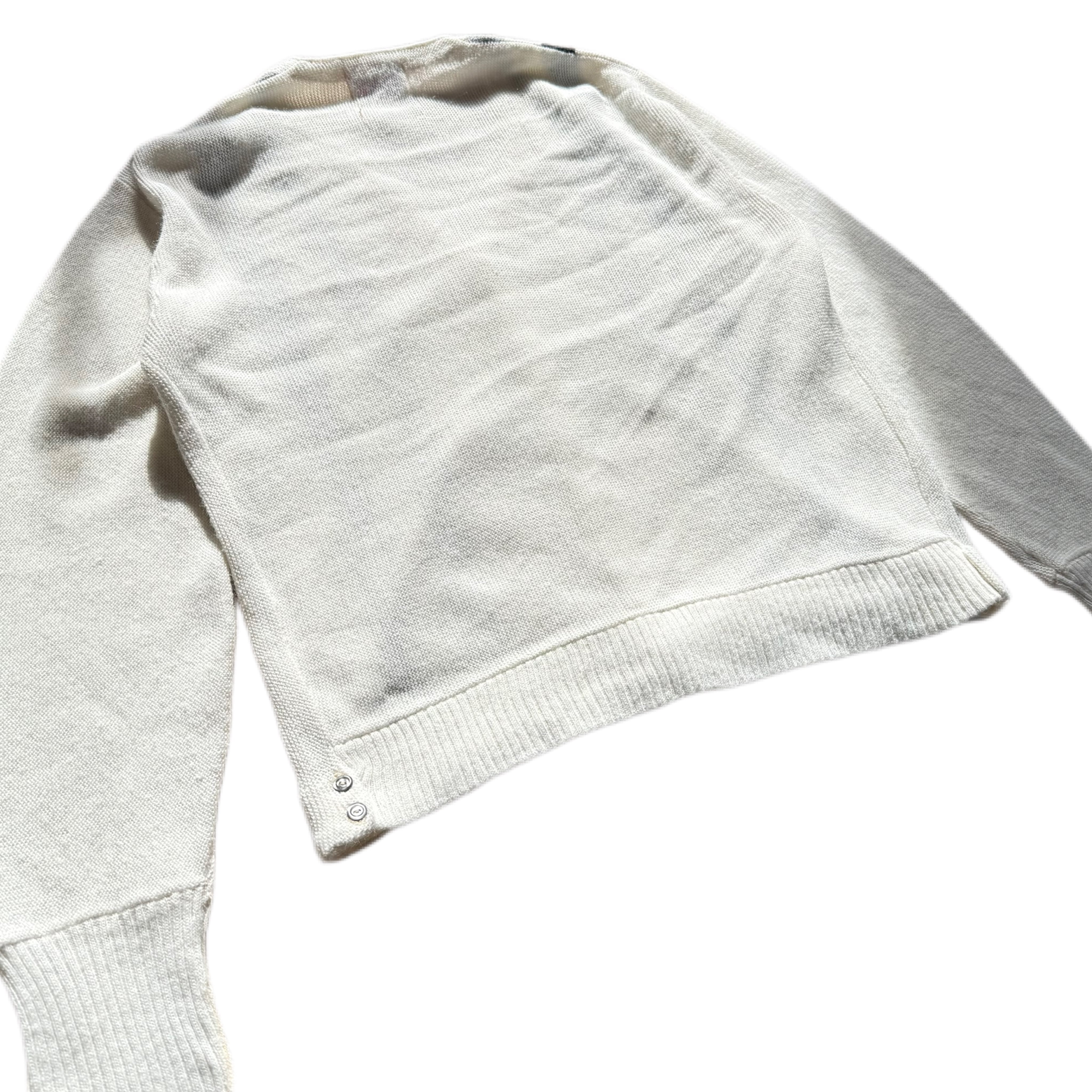 深めのVネック、ややショート寄りのシルエット、そしてサイド裾に付くボタンディテール。