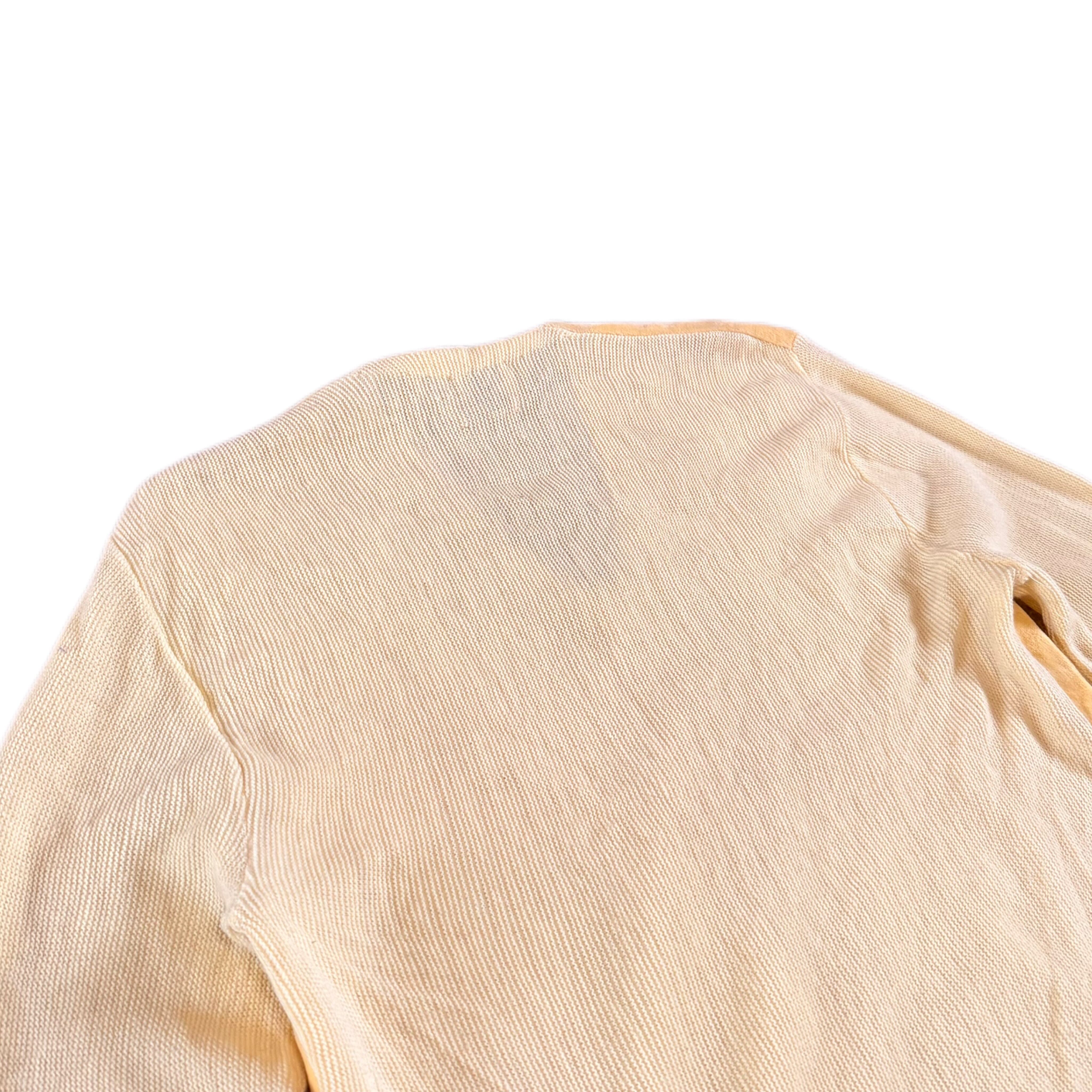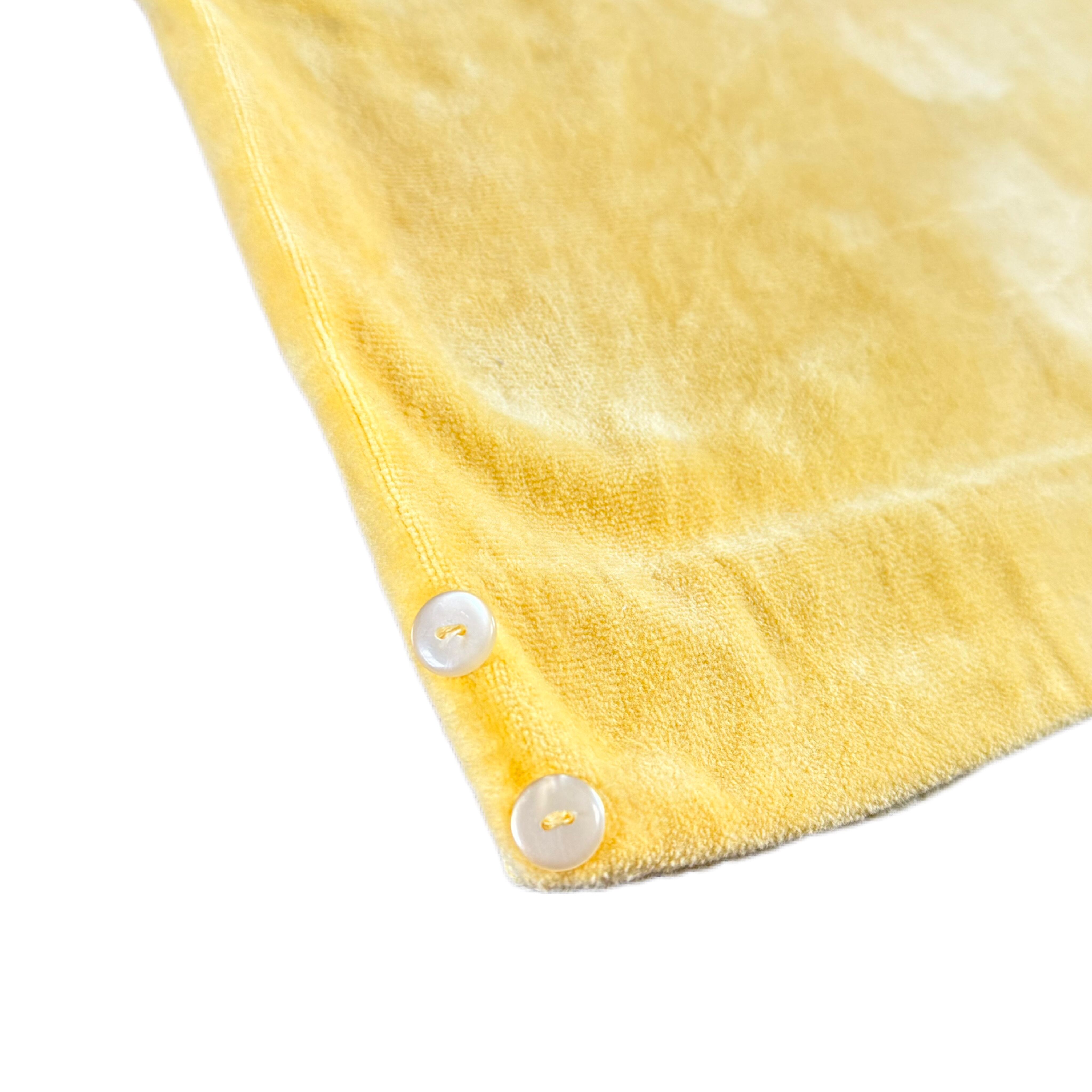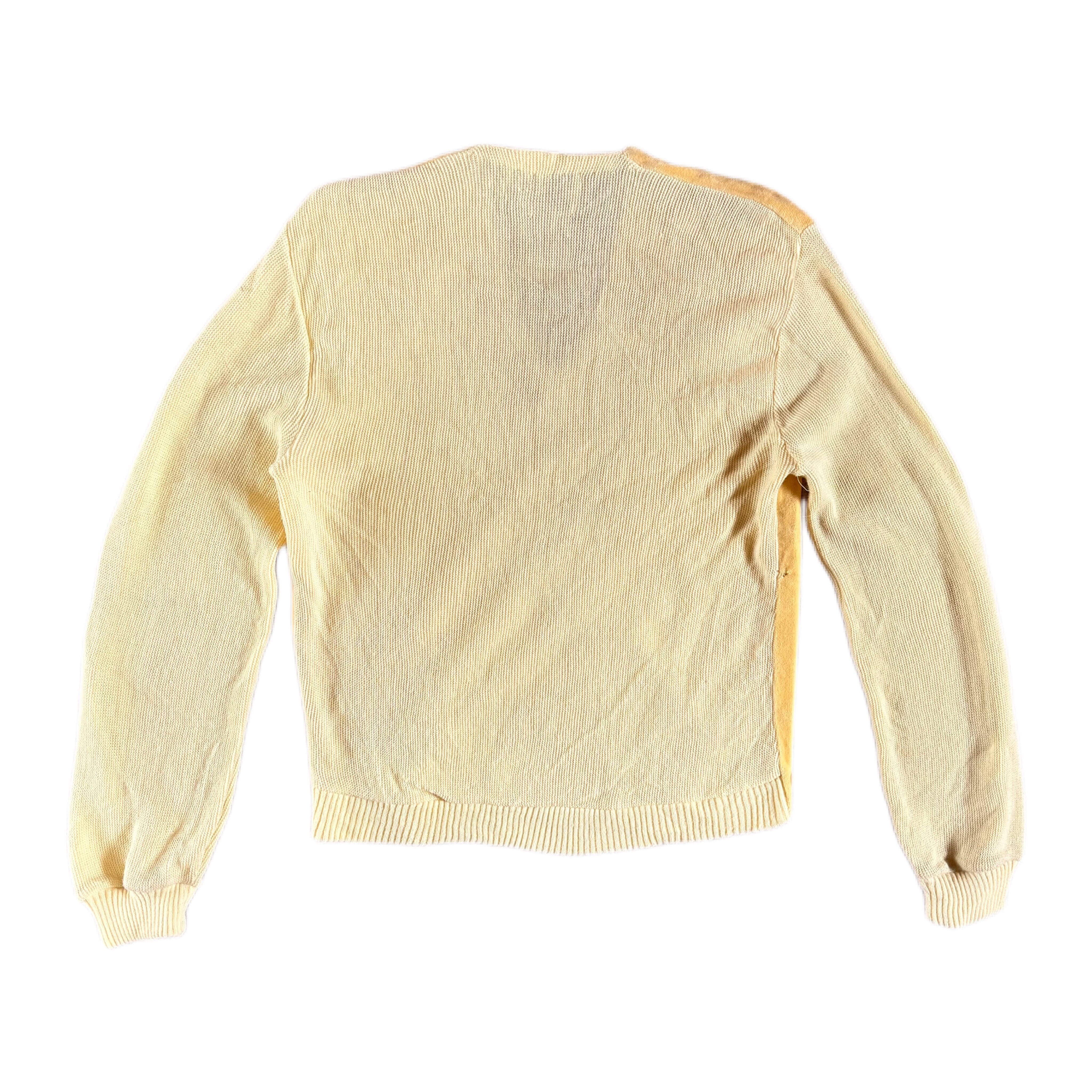 淡いイエローのボディに、フロントのみコットンベロアで切り替えられた異素材コンビのVネックニット。