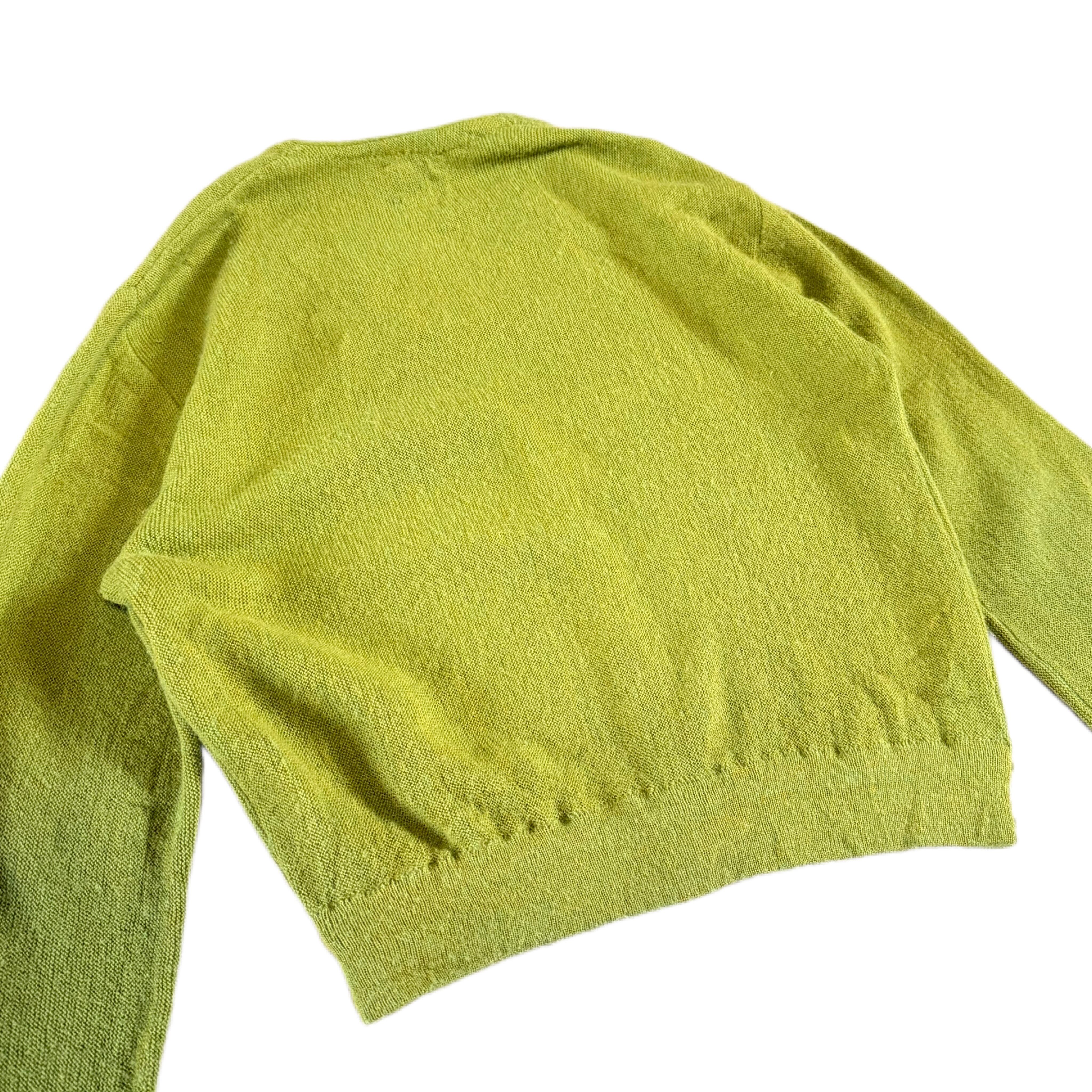 黄緑をベースに、黄色や少し茶色が混ざったような奥行きのある色味が印象的なモヘアカーディガン。単色ではなく、複数の色糸が混ざったメランジのような表情で、光の当たり方によって見え方が変わる雰囲気のあるカラーです。