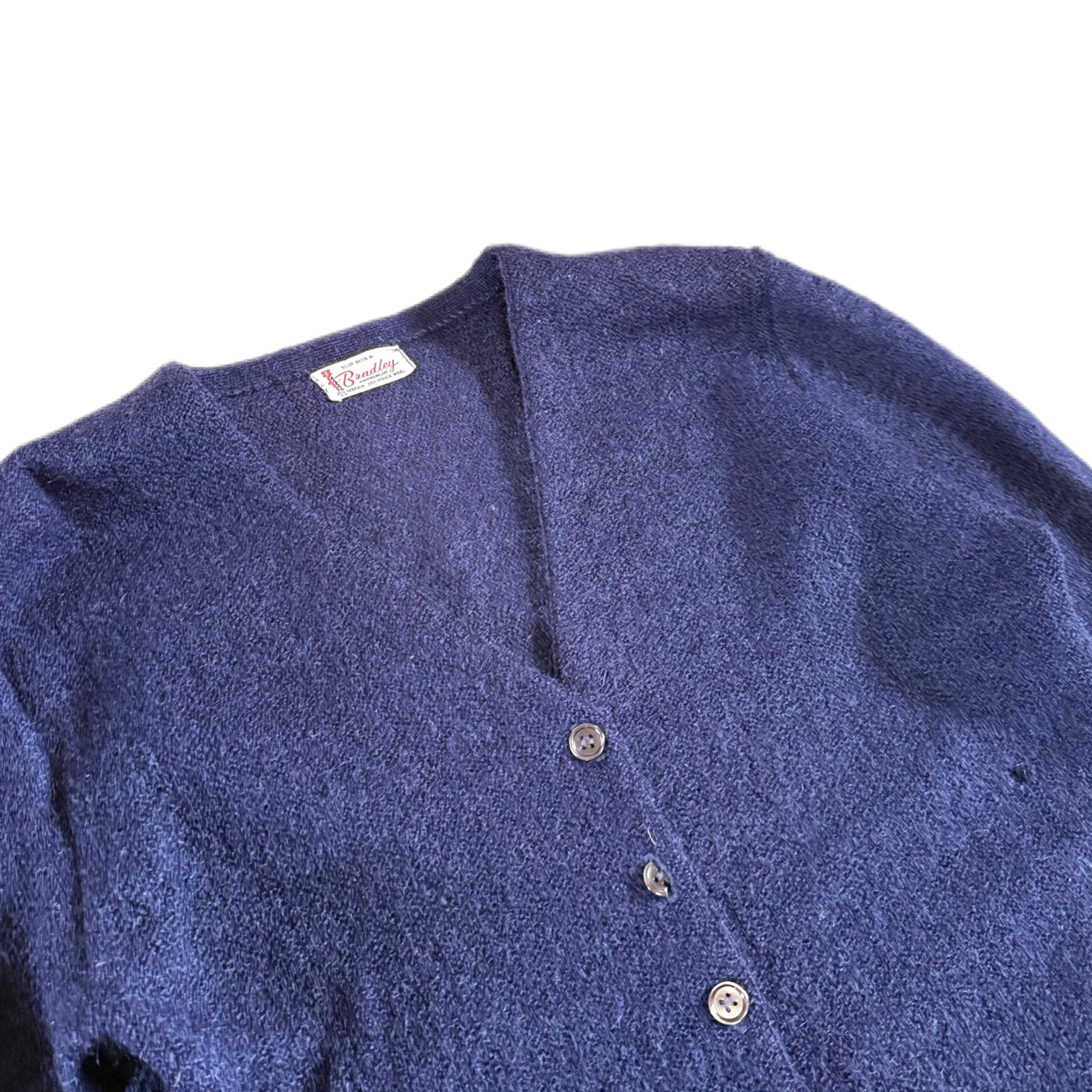 タグは“Bradley”。素材表記は 75% Mohair / 25% Virgin Wool。モヘアのふわっとした軽さと、ウールのしっかりとしたコシを併せ持った生地感です。毛足は長すぎず、柔らかい表情のある質感で、ヴィンテージモヘアらしい雰囲気があります。