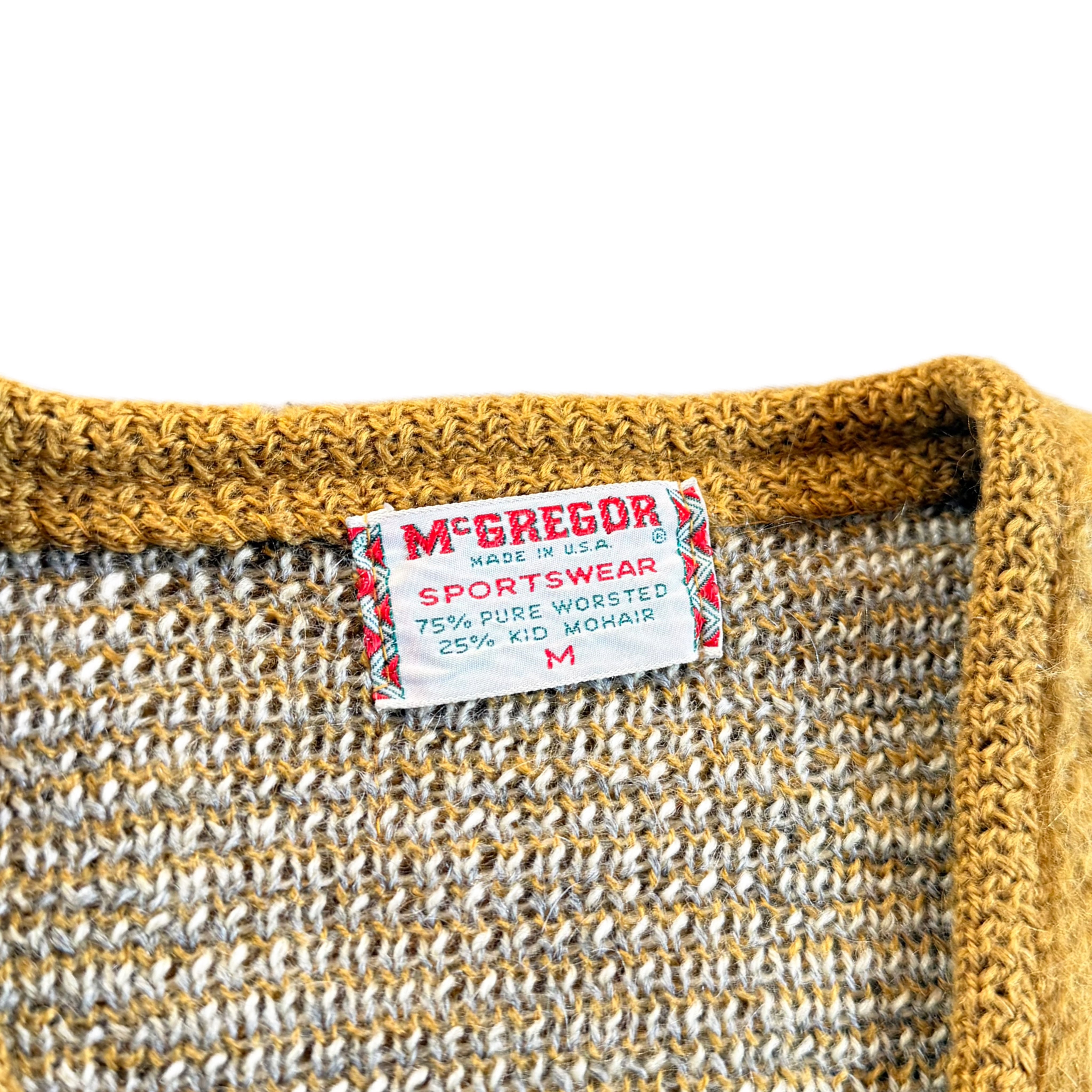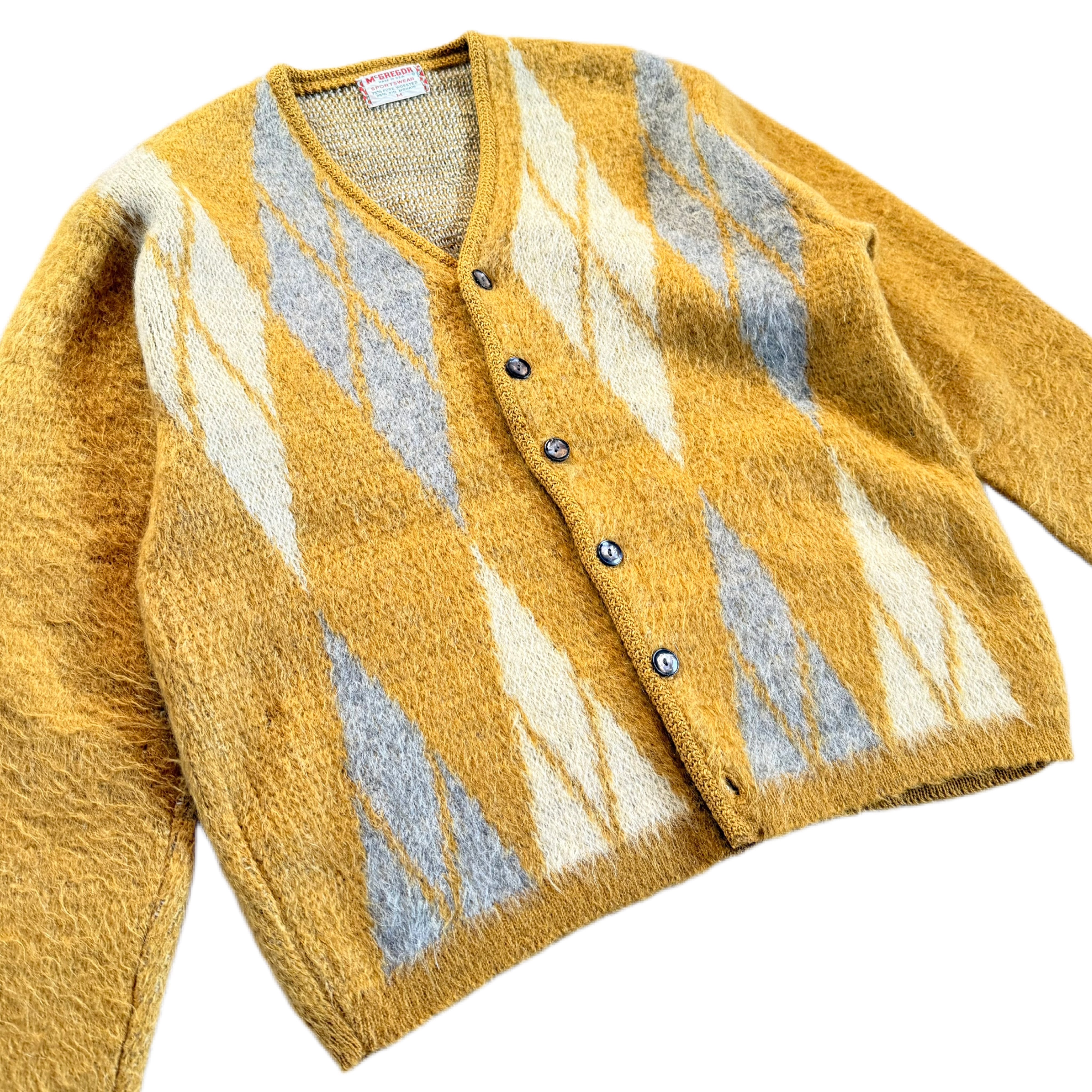 マスタードカラーをベースに、グレーとホワイトのアーガイル柄が入る1960年代頃のモヘアカーディガン。