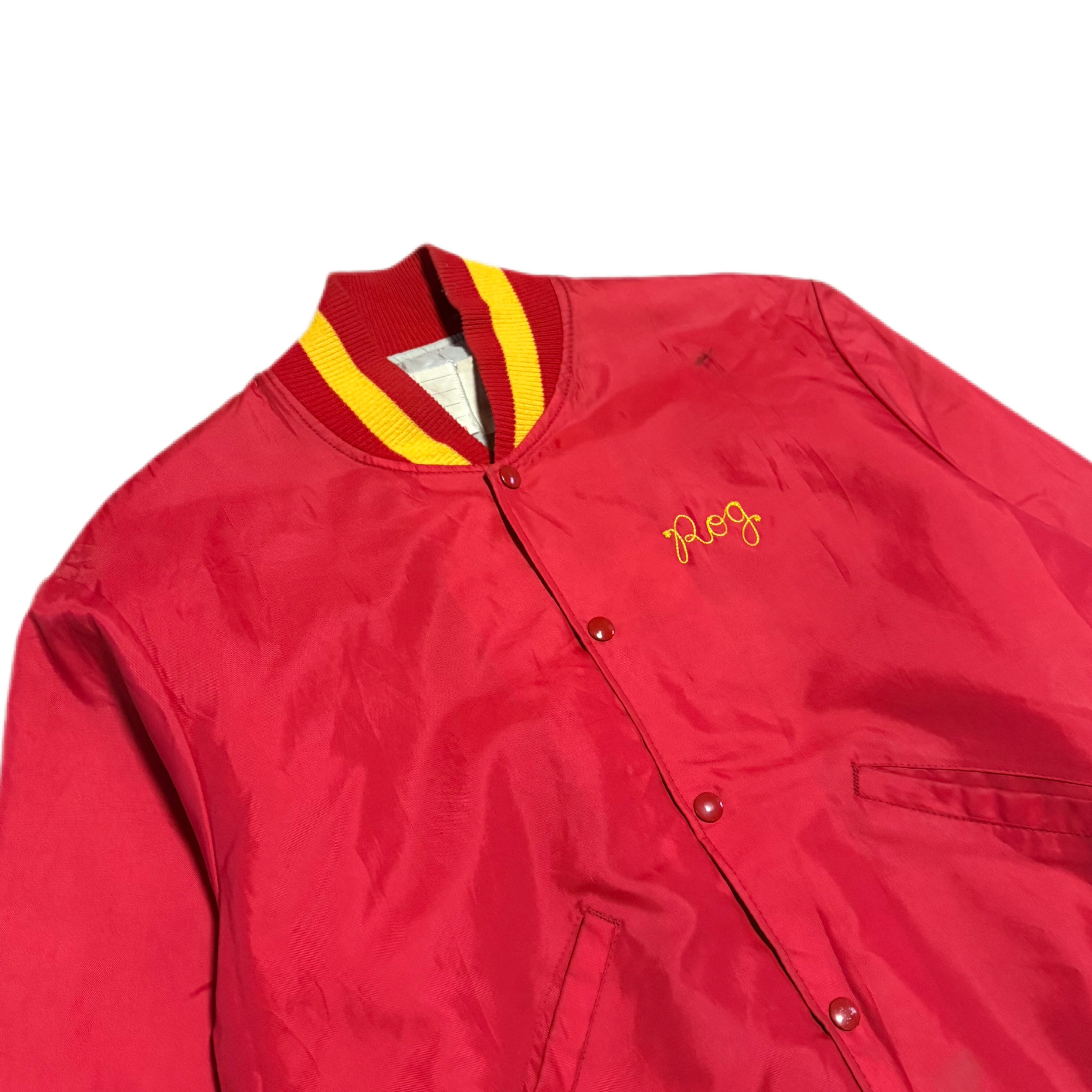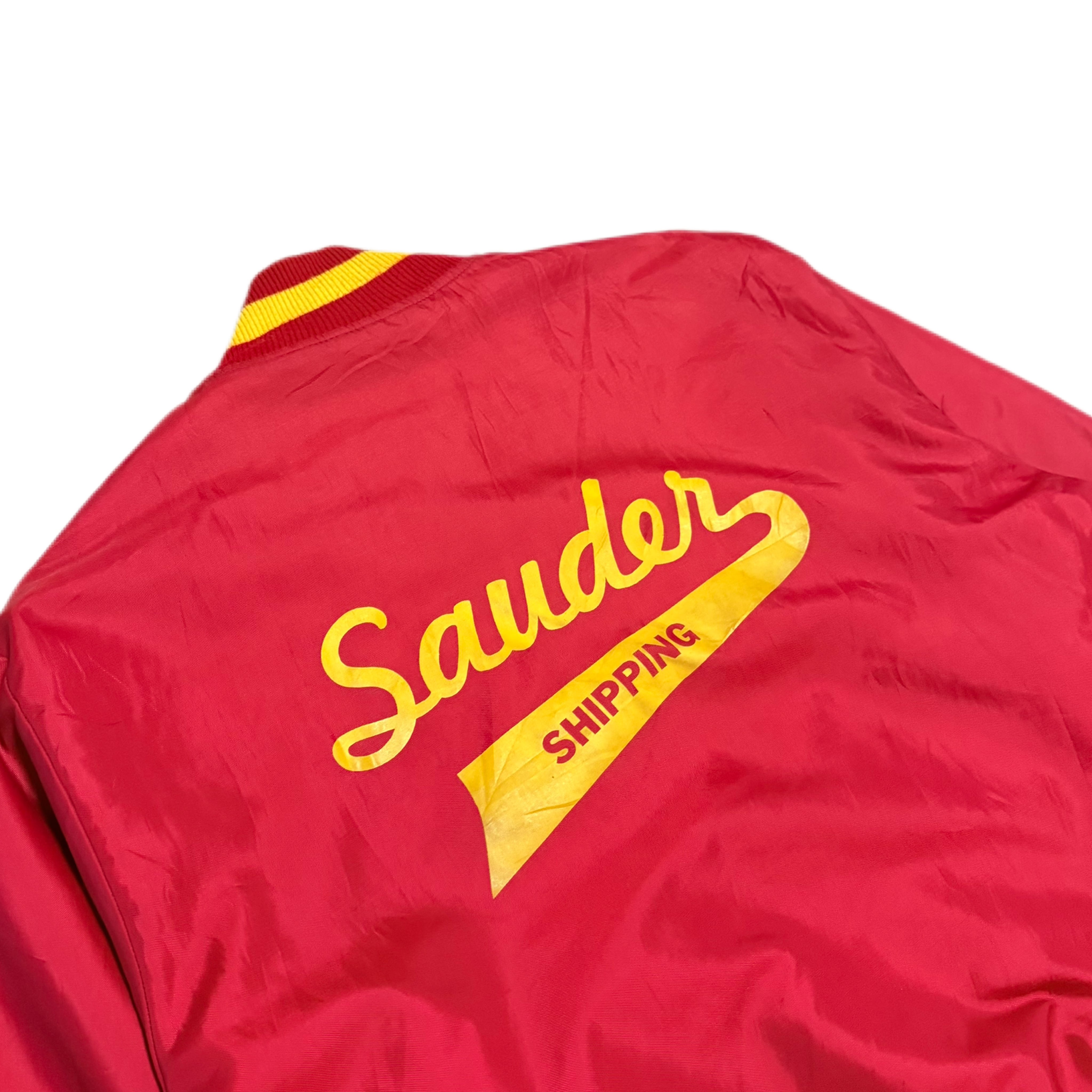 フロントにはチェーンステッチで「Roy」のネーム刺繍、バックには「Sauder Shipping」のプリントが入る、企業モノらしい雰囲気のある一着です。