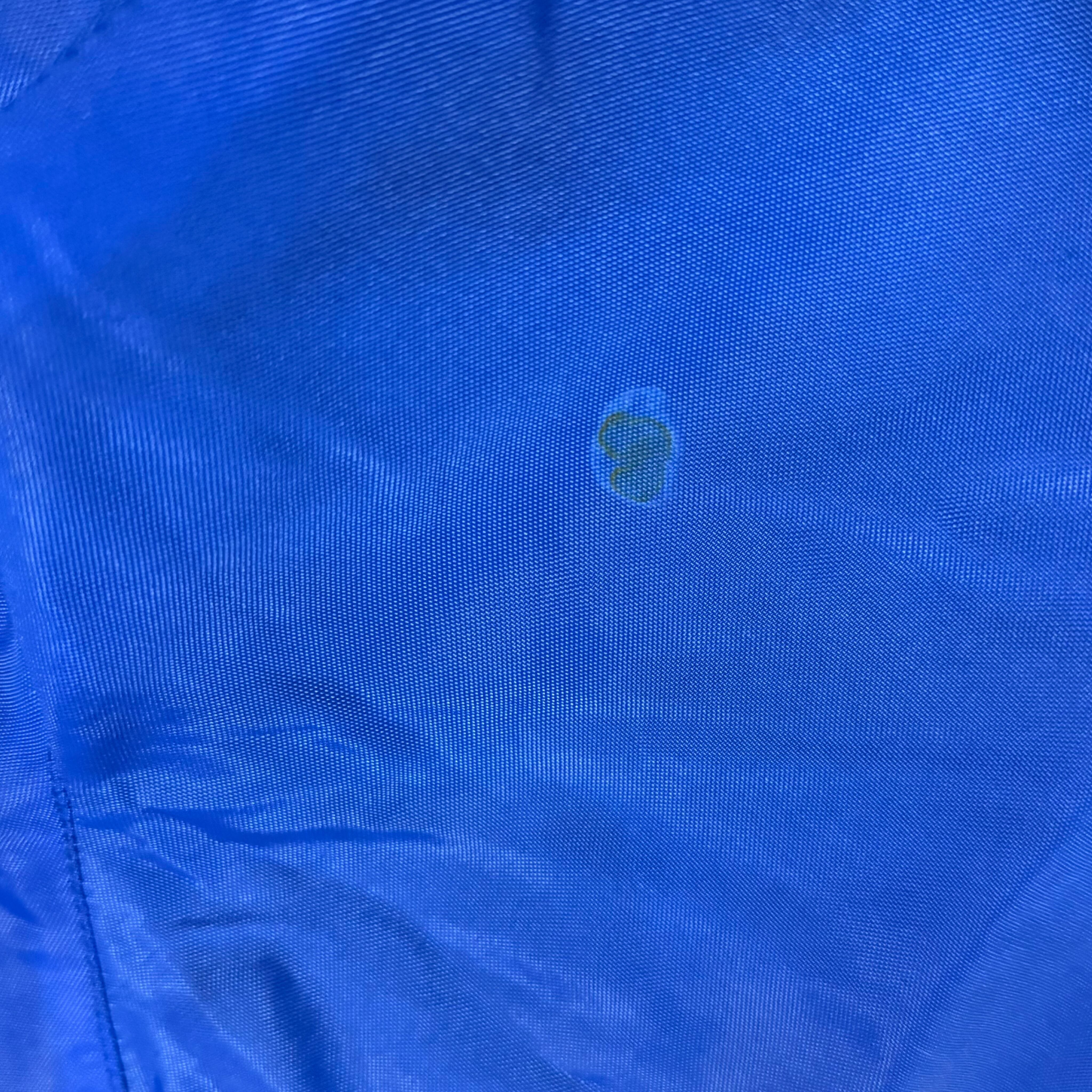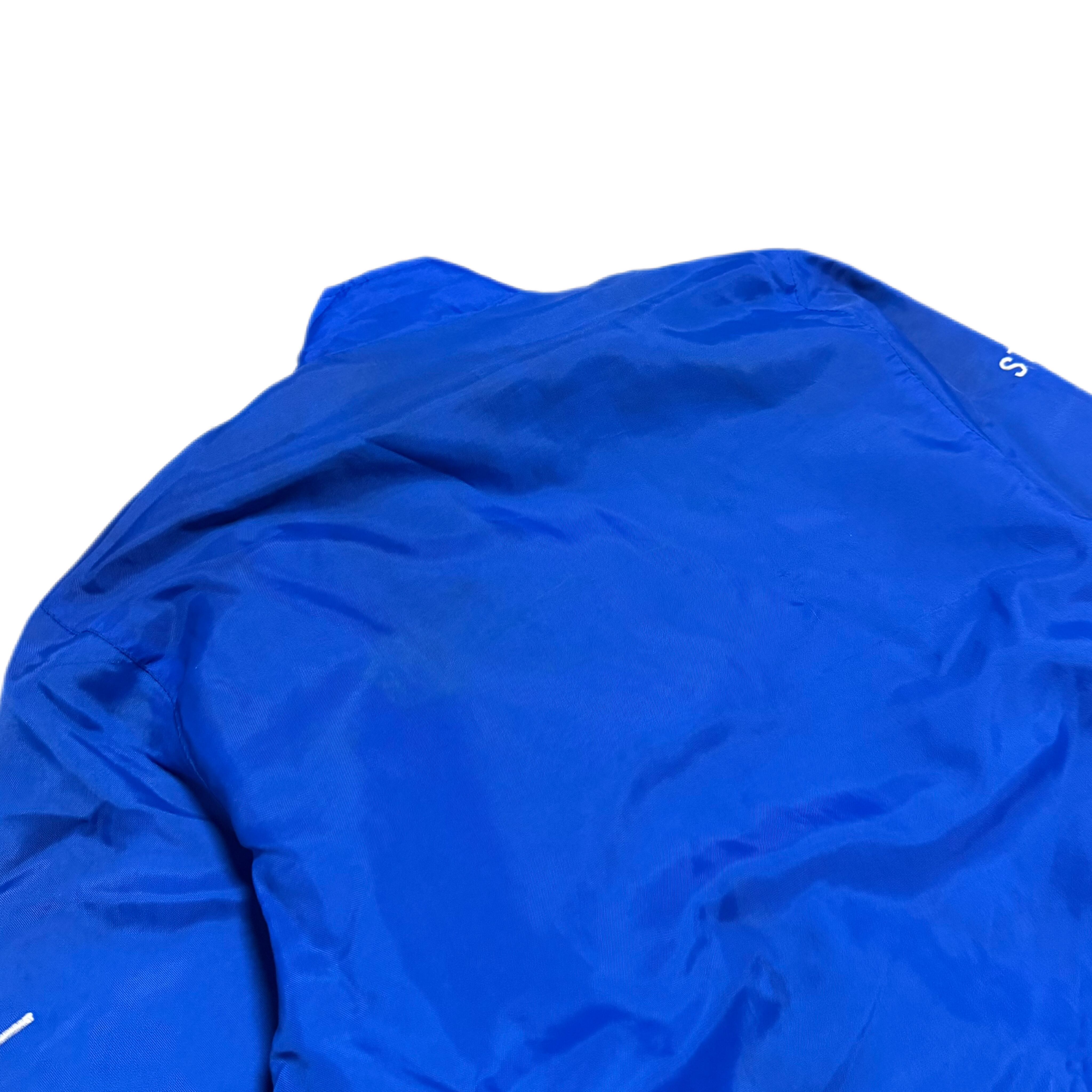 鮮やかなブルーボディに、企業ロゴとチーム背景が落とし込まれたナイロンジャケット。