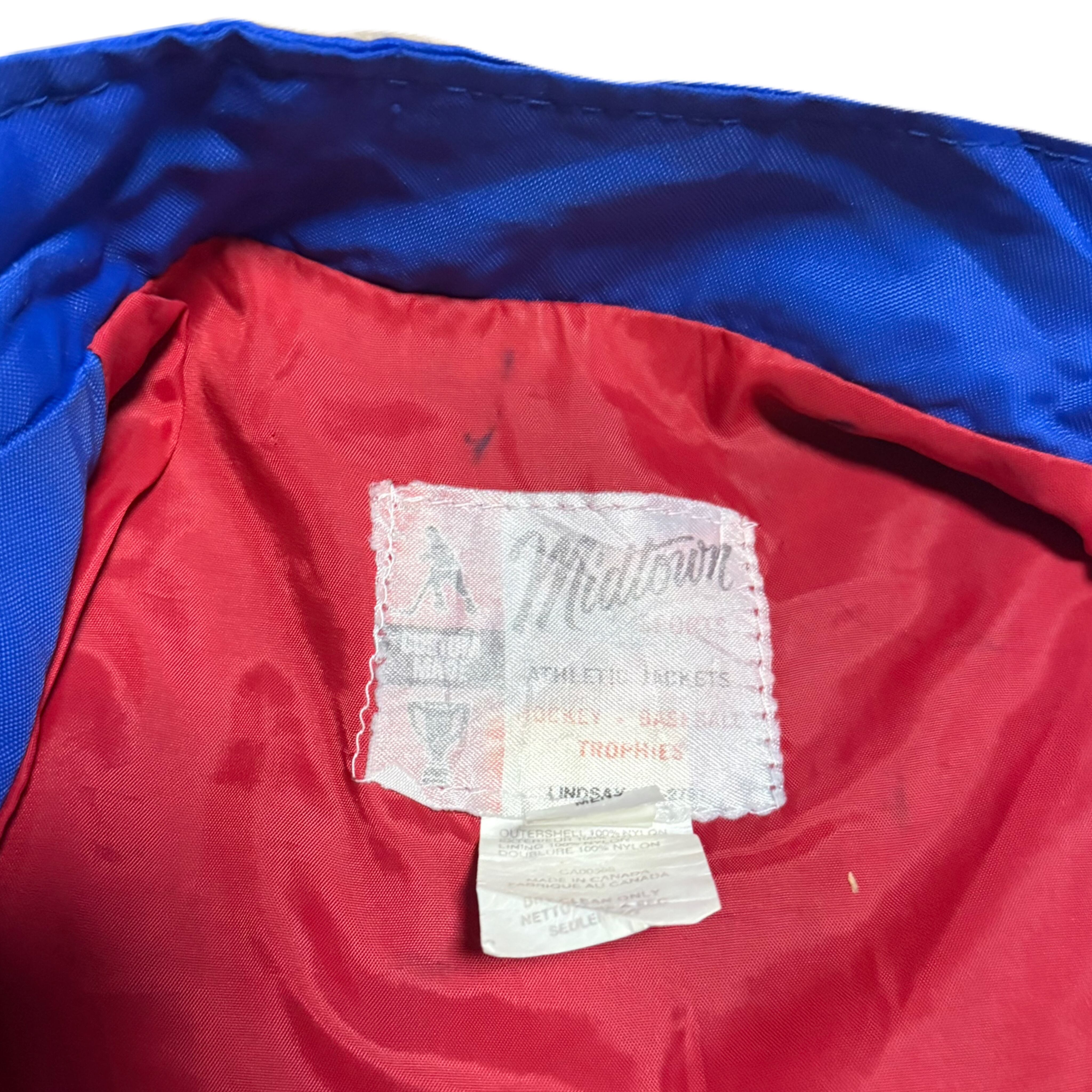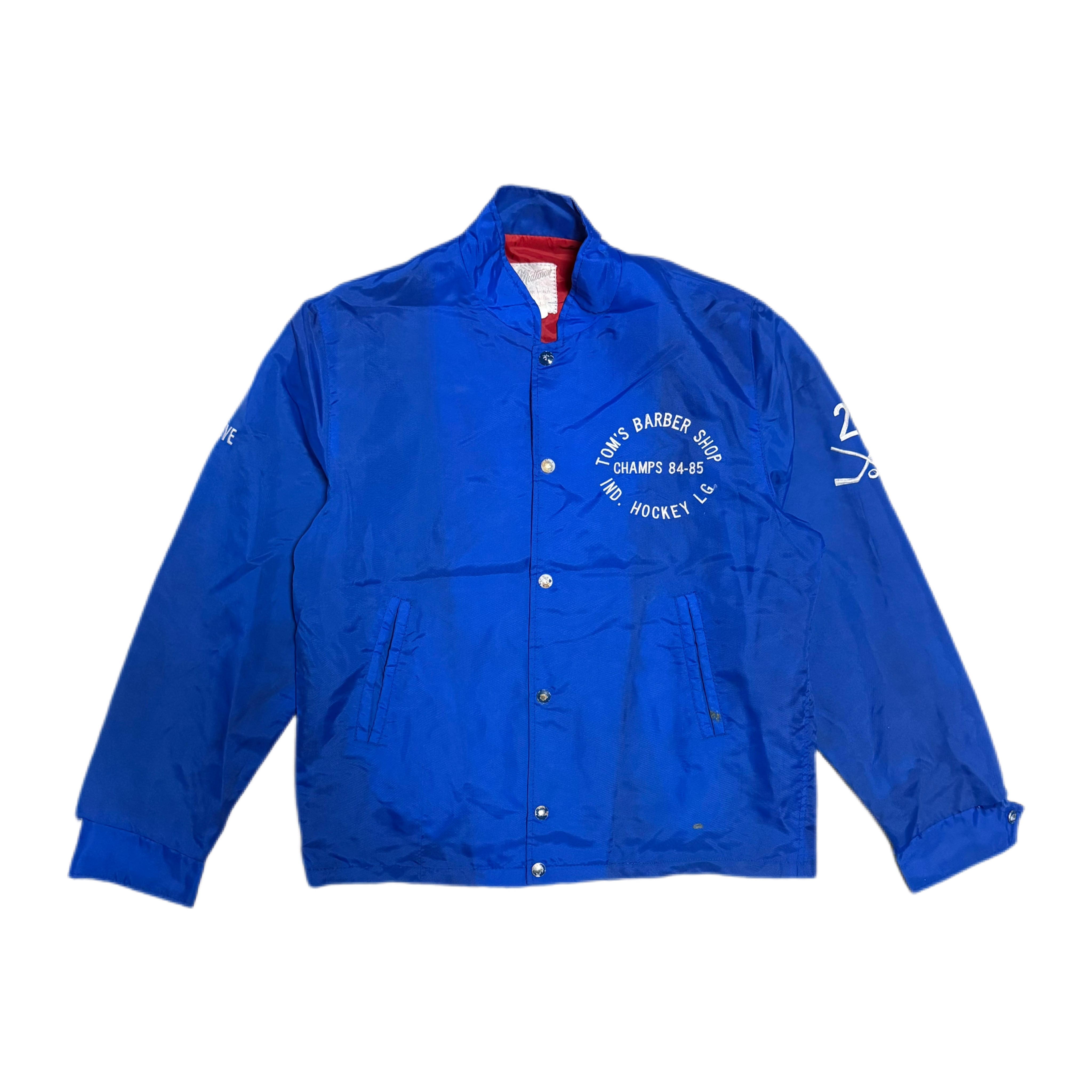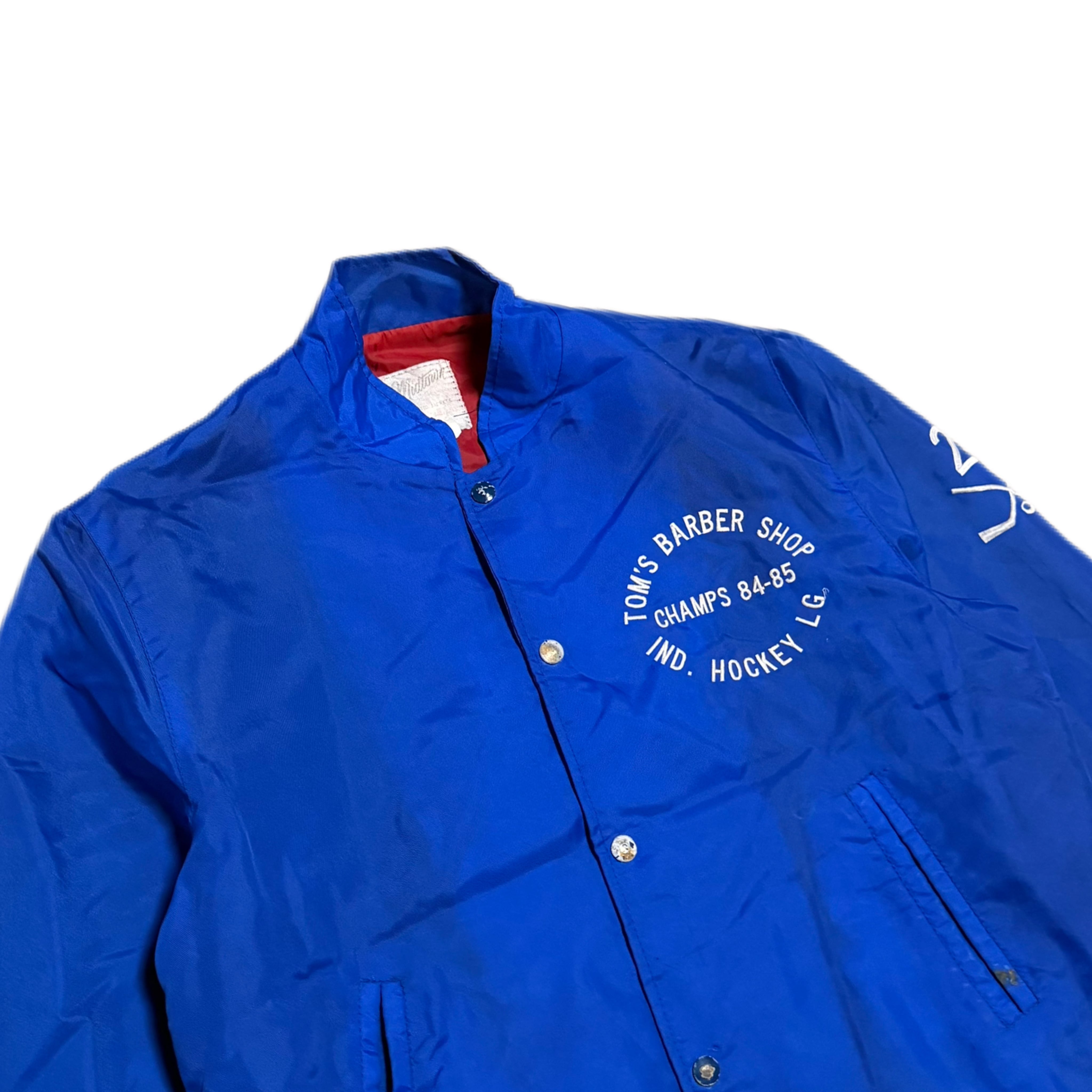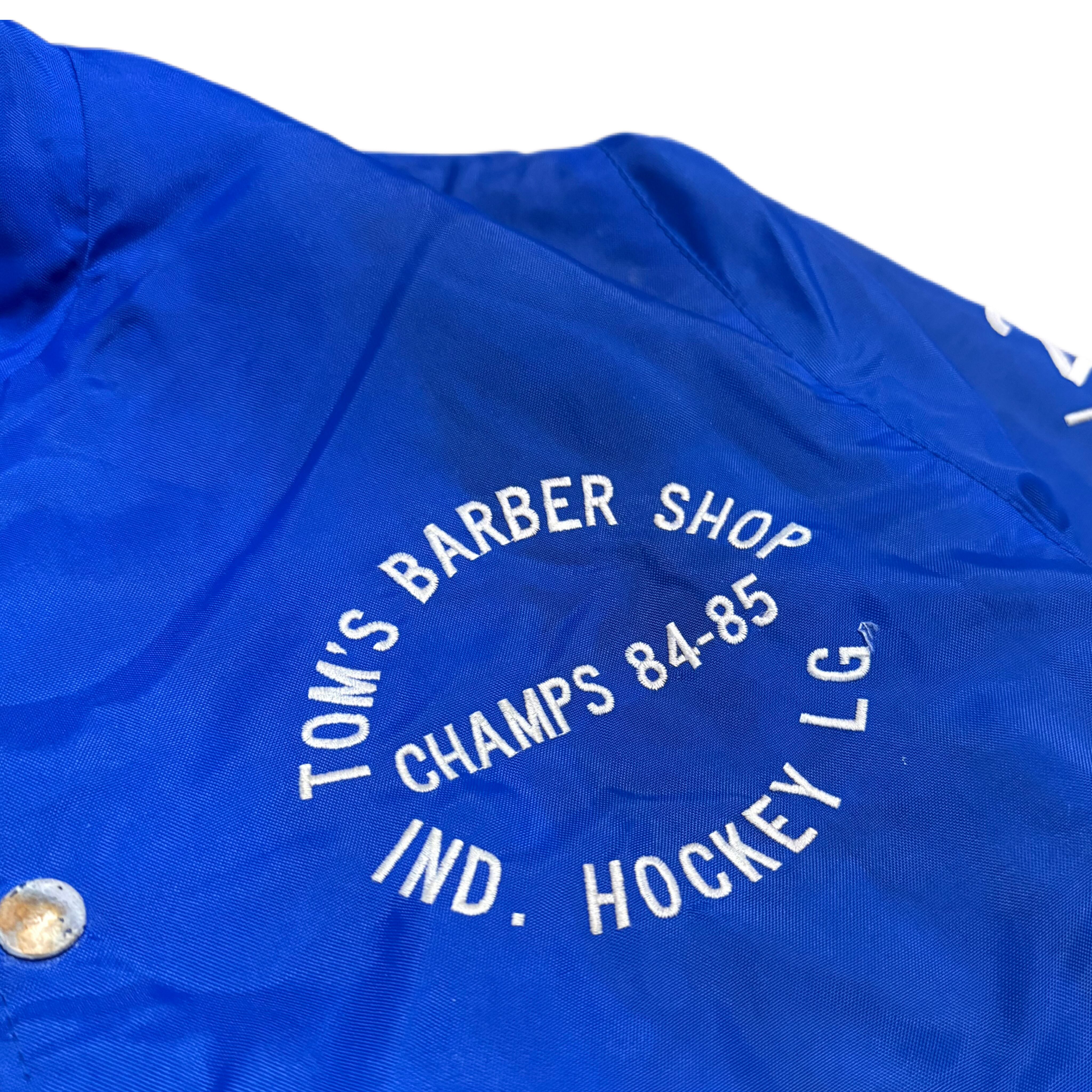 フロントには「TOMS BARBER SHOP / CHAMPS 84-85 / IND. HOCKEY LG」のプリントが入り、当時のチーム・企業の関係性を感じられる一着です。