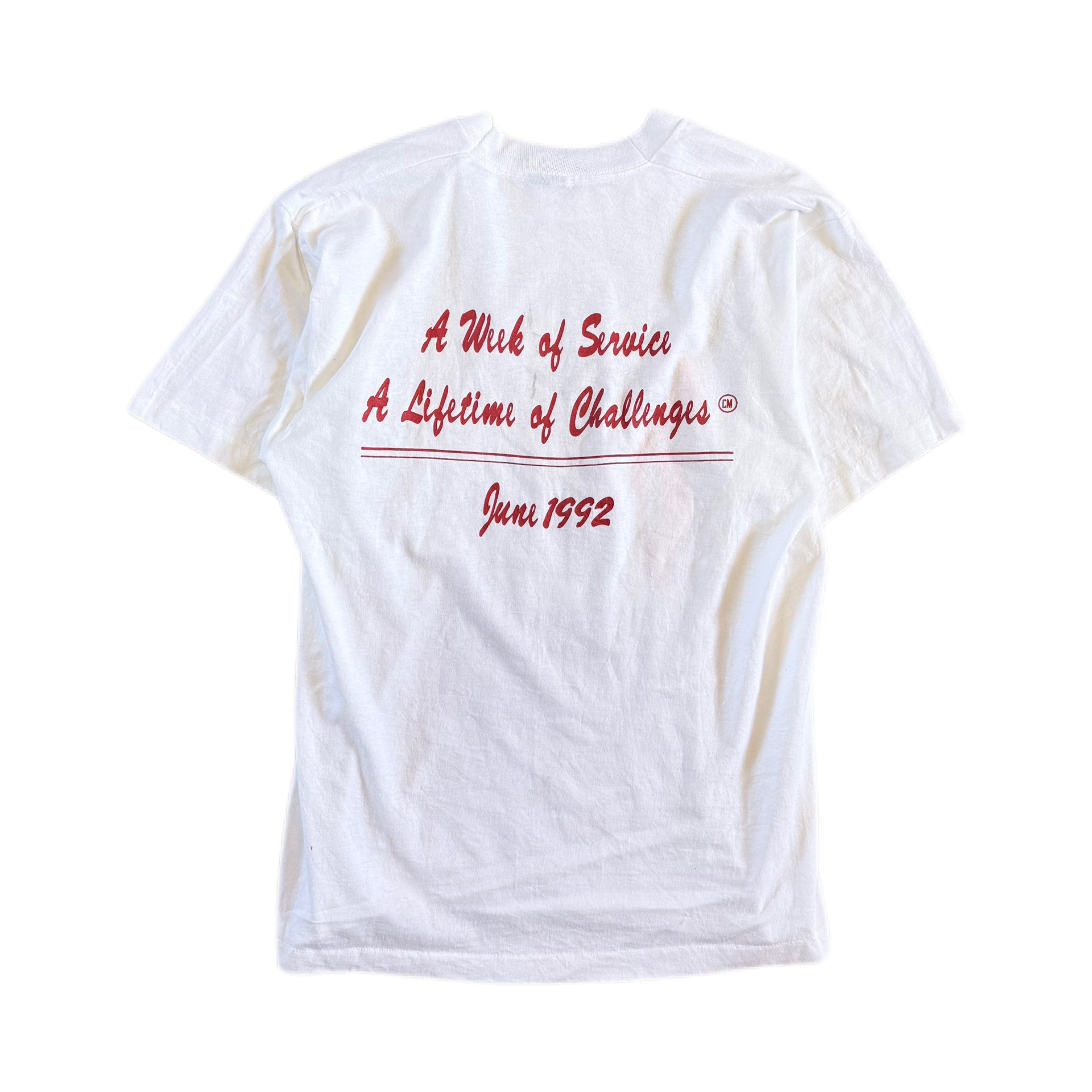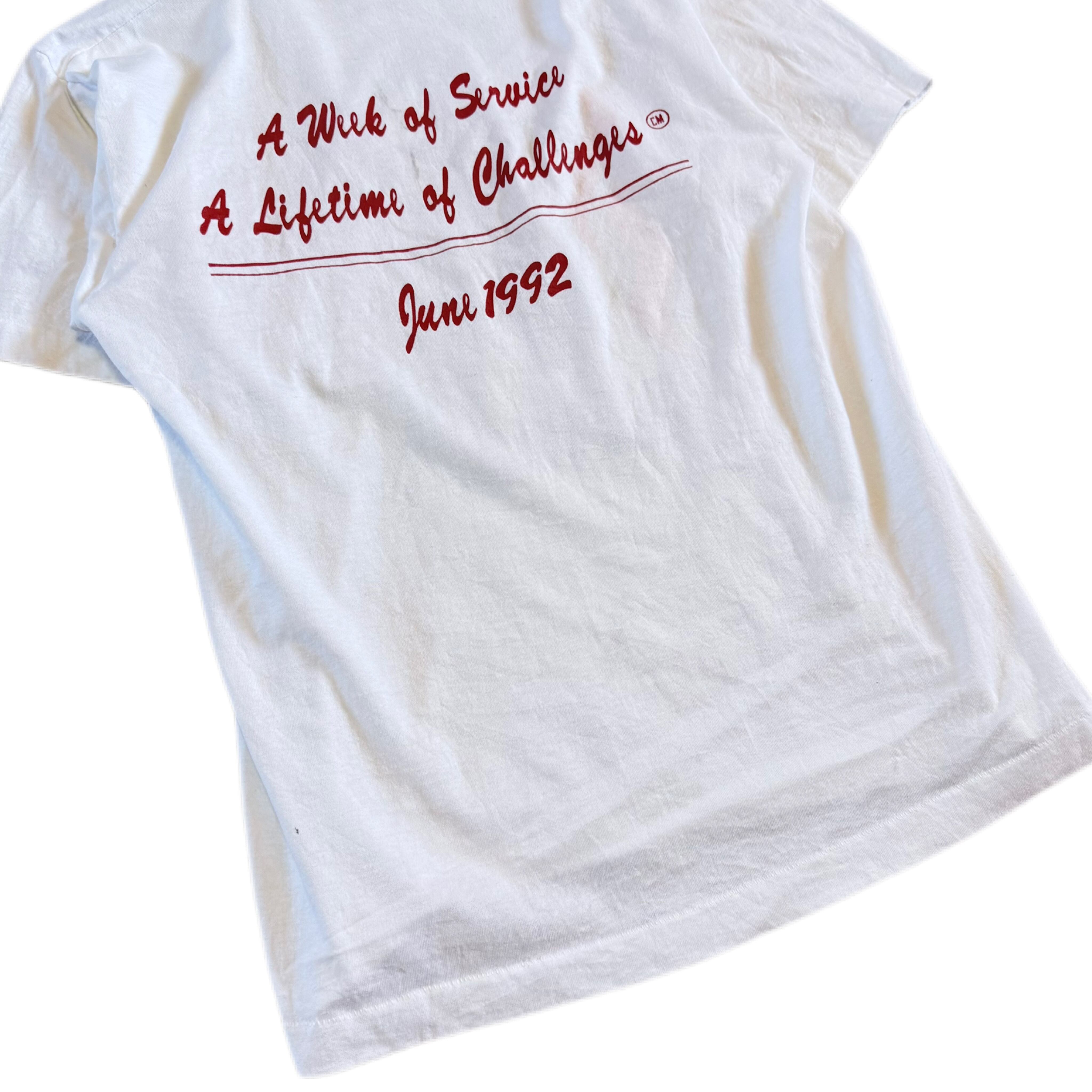 バックには“A Week of Service, A Lifetime of Challenges / June 1992”とプリントされており、1992年に行われたボランティア・奉仕活動の記念Tシャツと推測されます。
