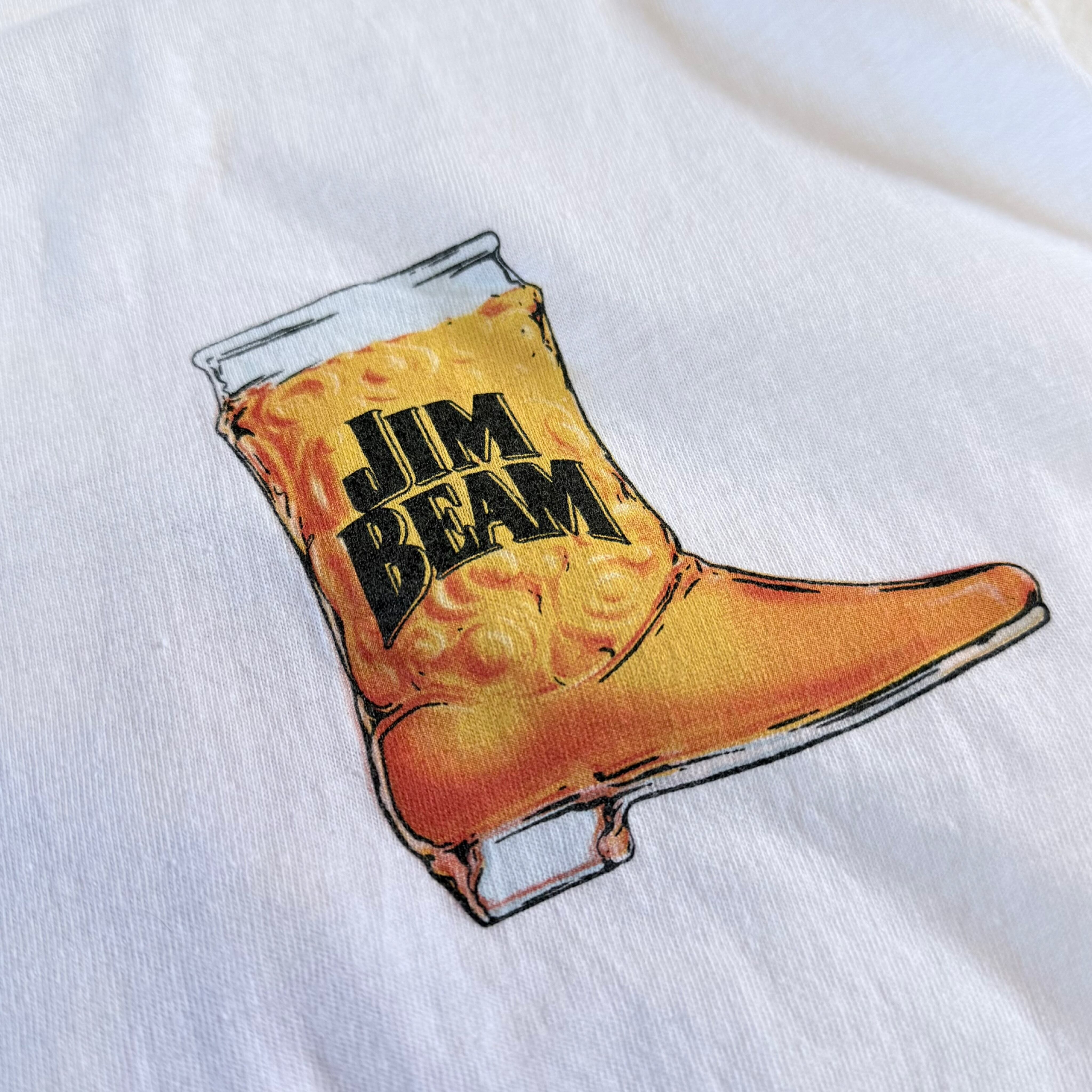 フロントはワンポイント、バックには大きく配置されたグラフィックと「I GOT THE BOOT FROM JIM BEAM」のコピーが入る、バランスの良い両面プリント仕様。