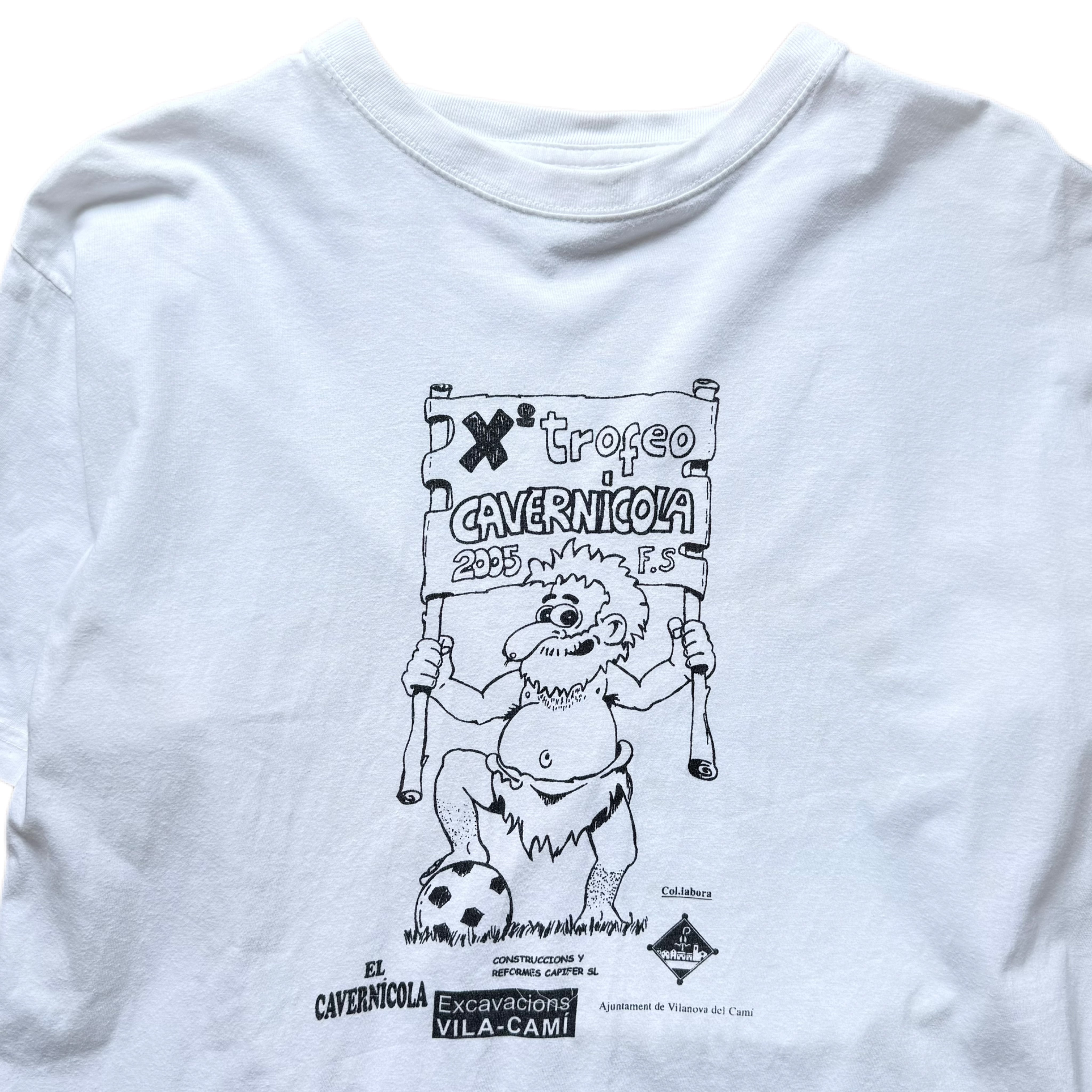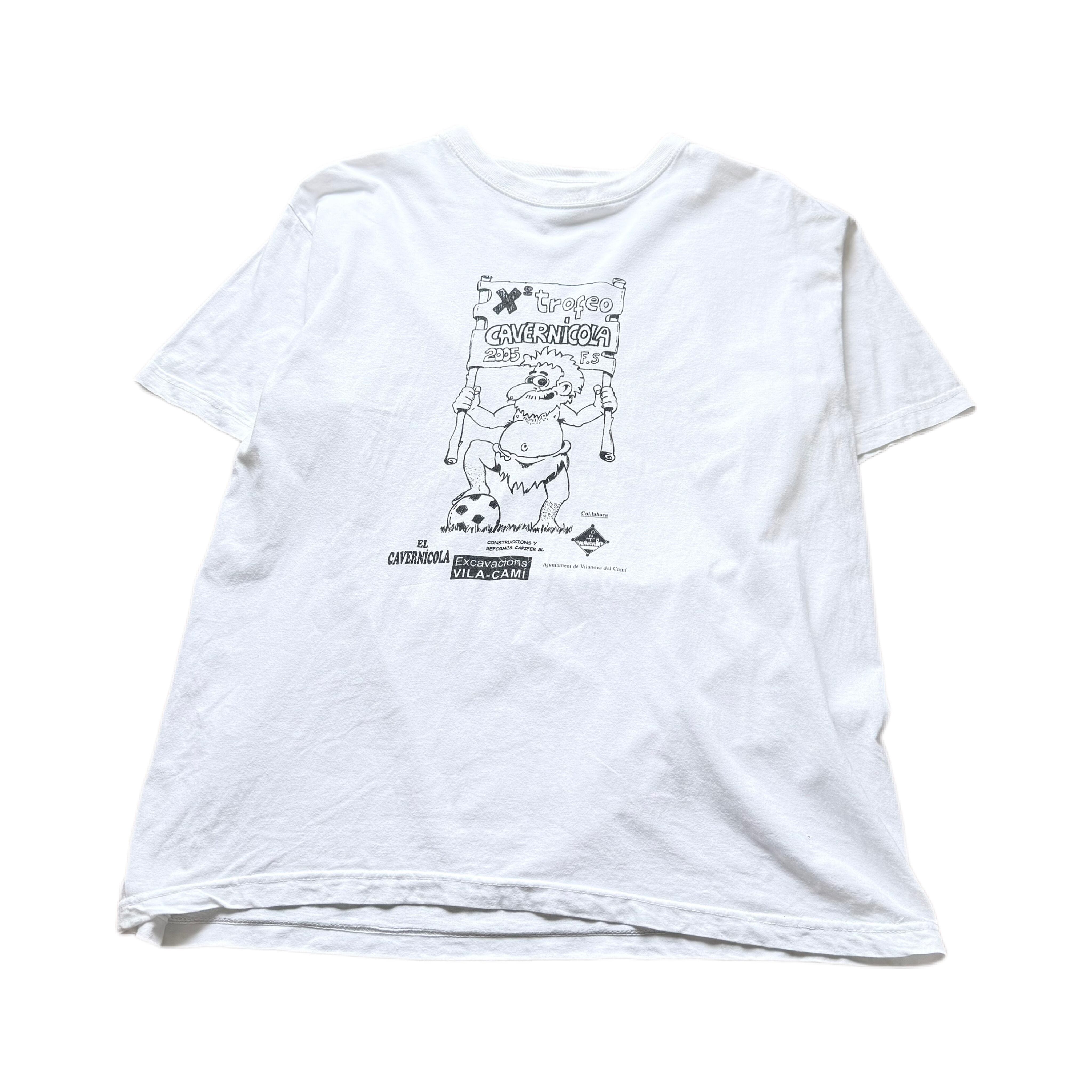 「trofeo CAVERNICOLA(洞窟人トロフィー)」と書かれた看板を掲げた、ゆるいタッチの原始人キャラクターが印象的なプリント。足元にはサッカーボールが描かれており、スポーツイベント系のTシャツであることが伺えます。