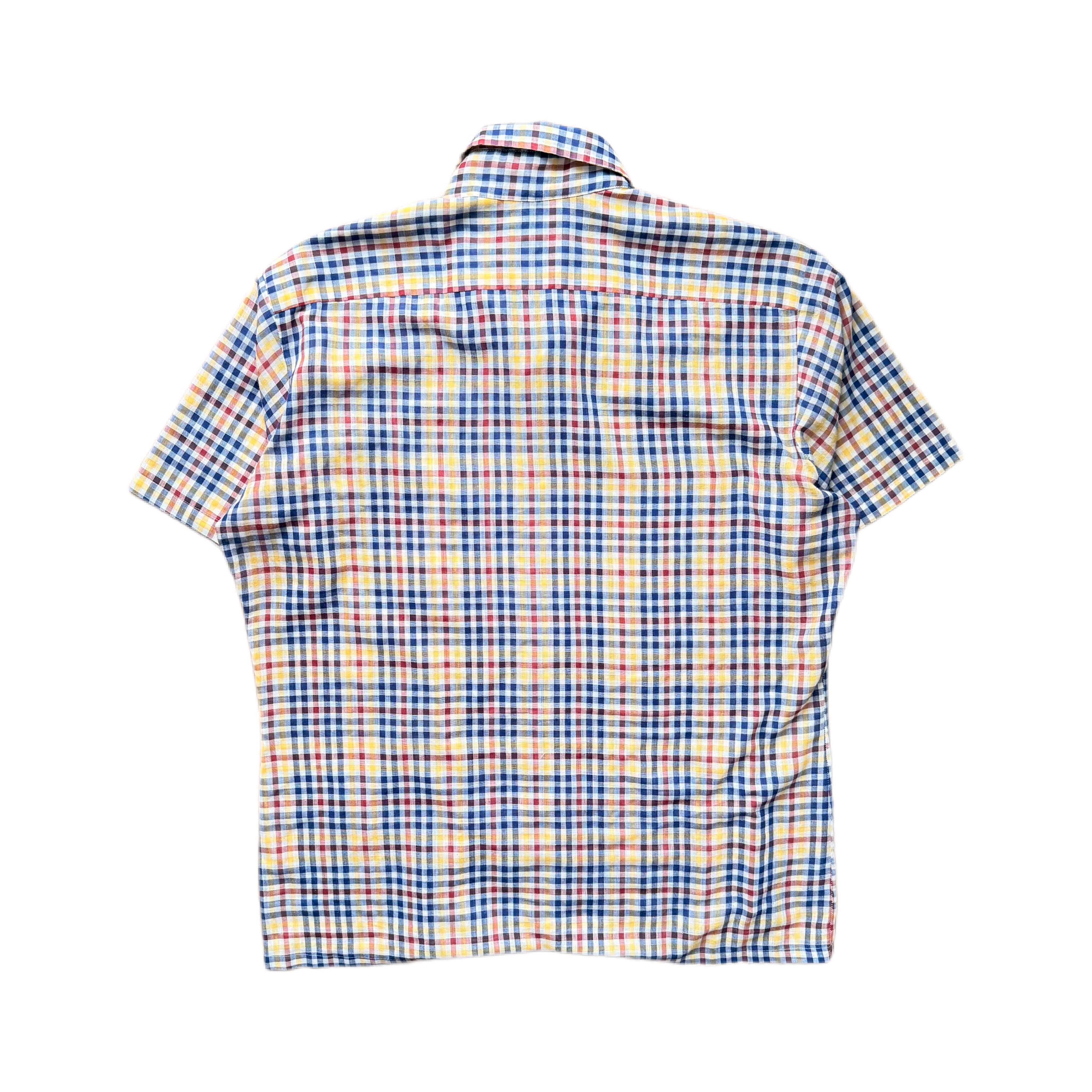 細かいピッチのチェックに、イエロー・レッド・ブルーがバランス良く入った配色が特徴的で、ヴィンテージらしい雰囲気のある一着です。