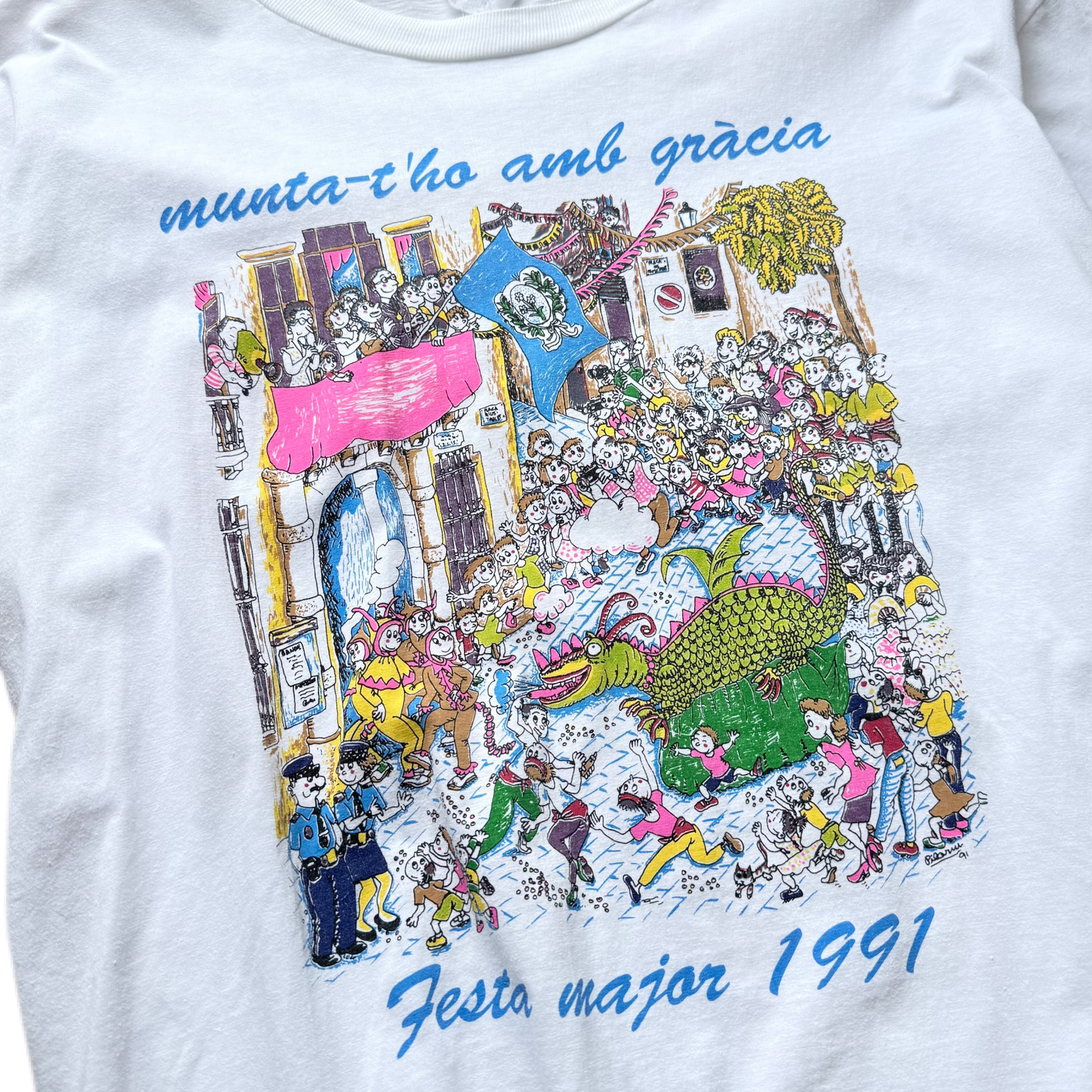 下部には「Festa major 1991」と年号入り。さらにカタルーニャ州旗や自治体紋章、ビールメーカー「San Miguel」などのロゴも入り、当時のイベント用に制作されたリアルなカルチャーTであることが分かるディテールです。
