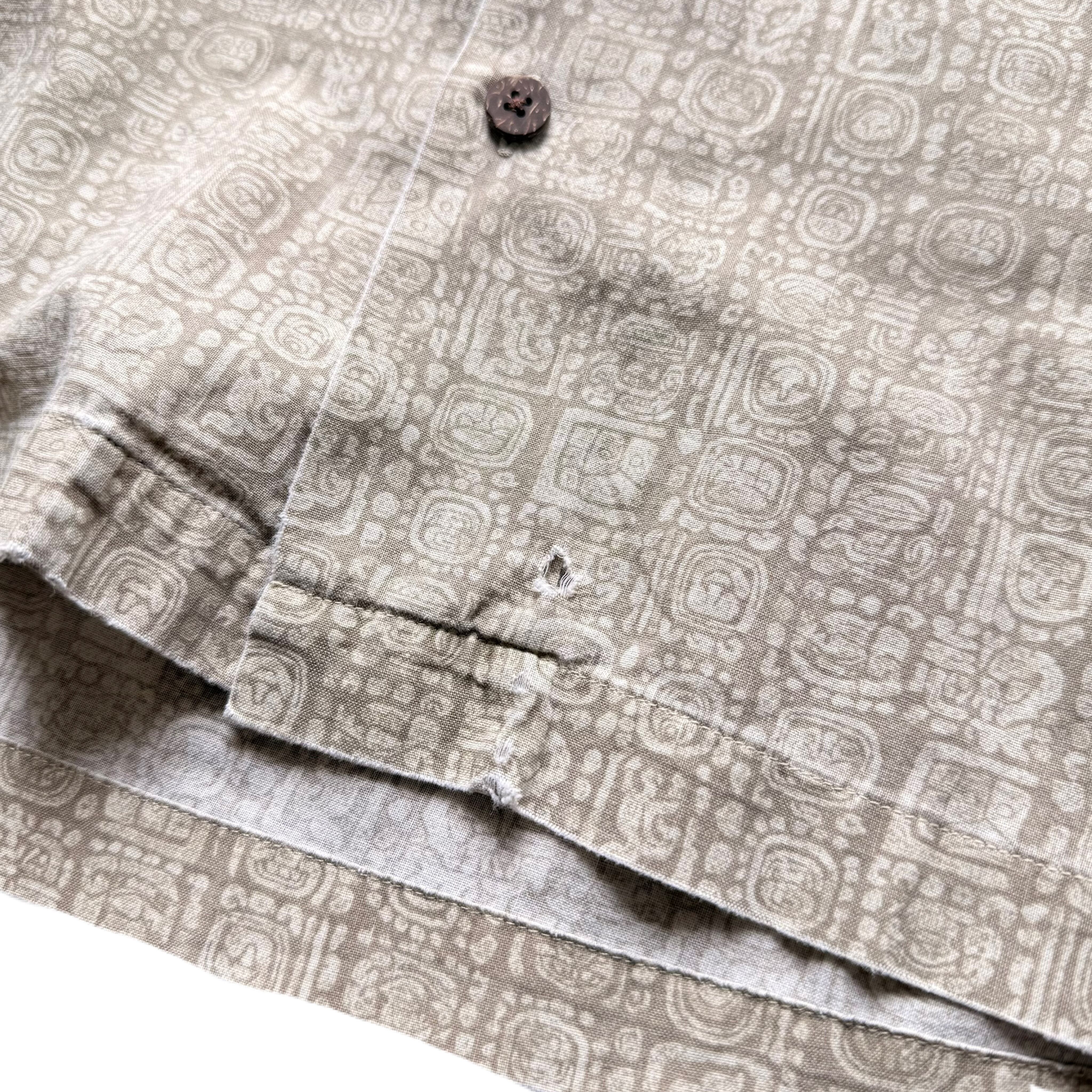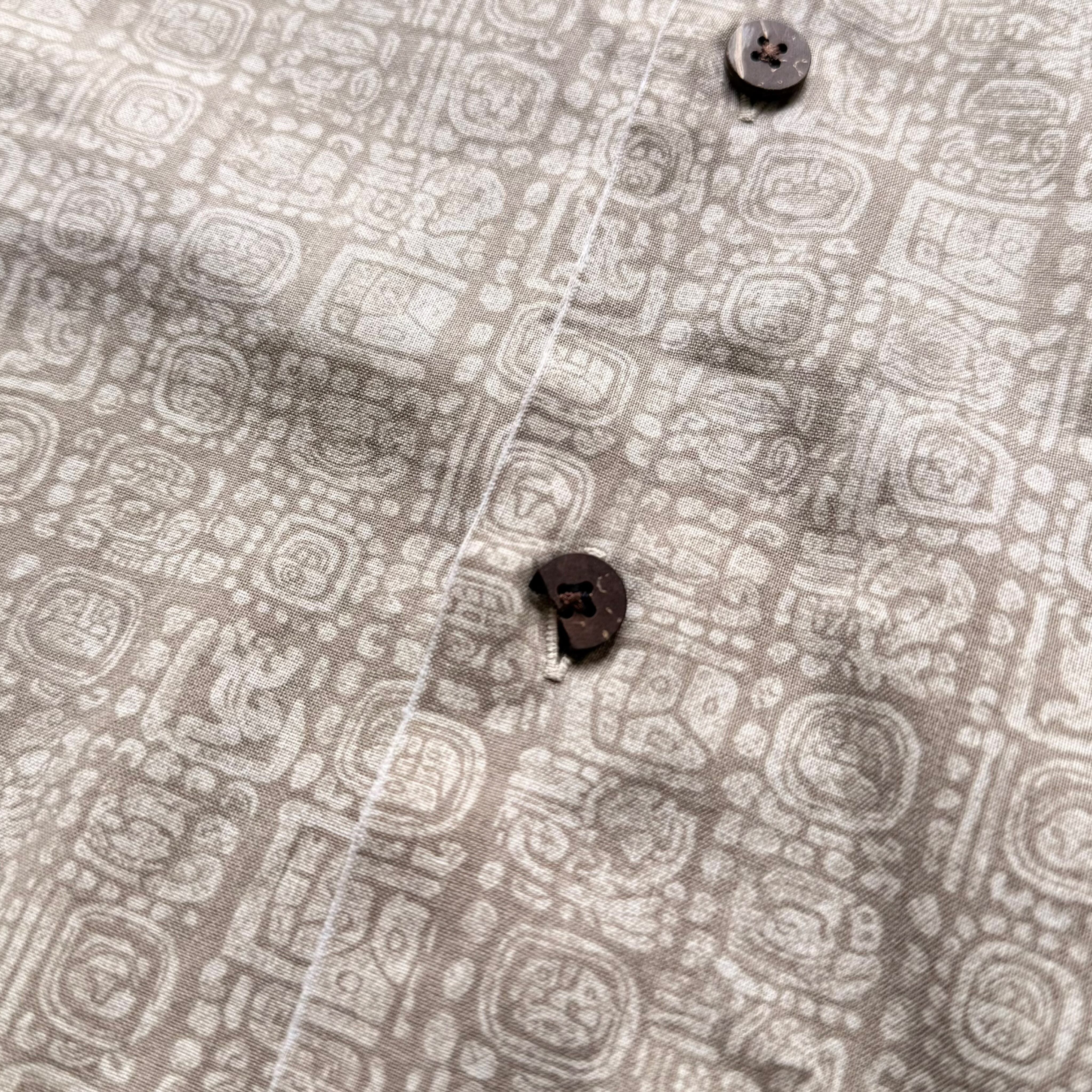 全体に細かく敷き詰められた幾何学モチーフが特徴的な、所謂“総柄(オールオーバパターン)”のハワイアンシャツ。派手な配色のハワイアンとは違い、日常使いしやすい一着です。