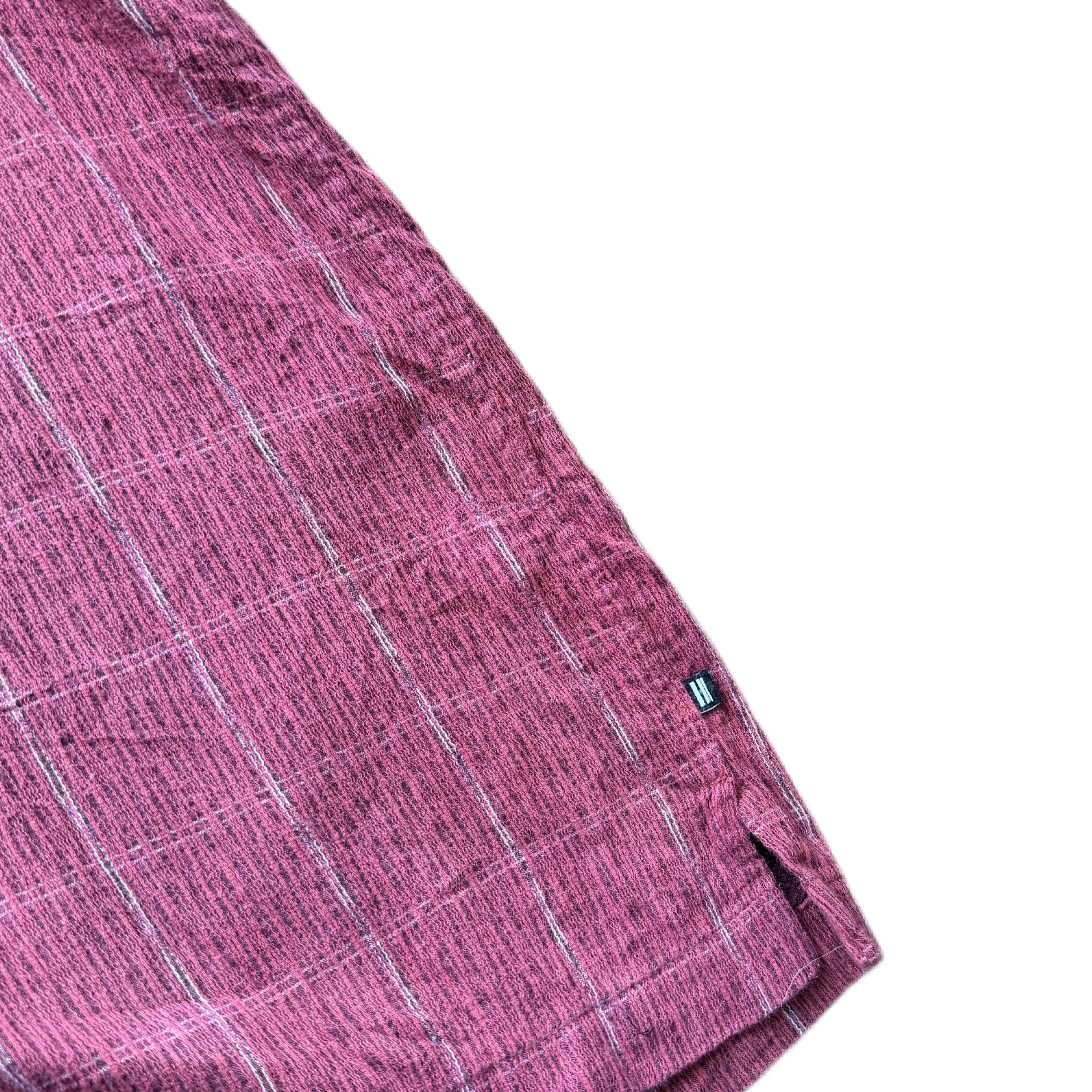 落ち着いた赤みのボディに、かすれたような織り柄と細かな格子が重なる、雰囲気のある一着。