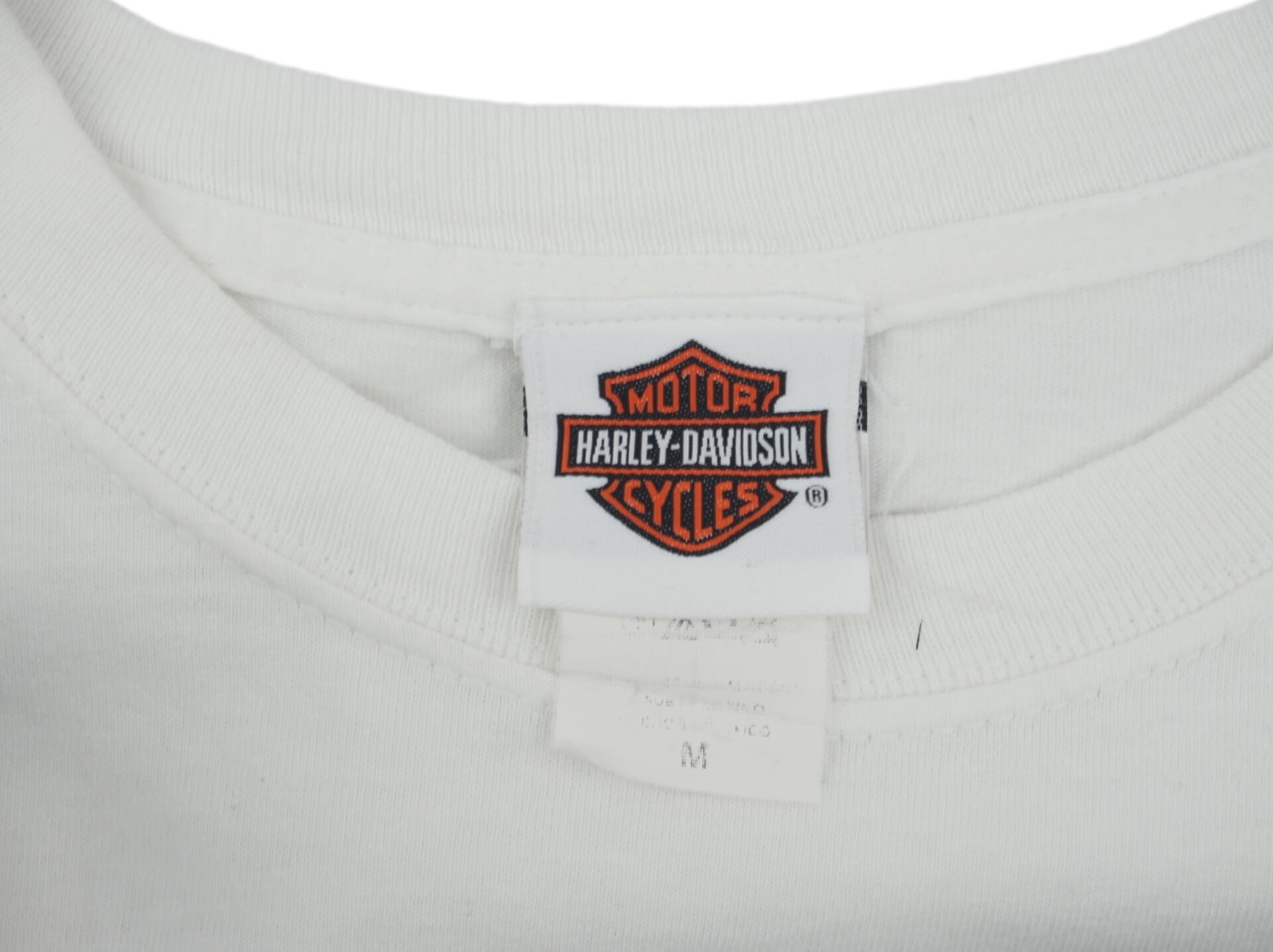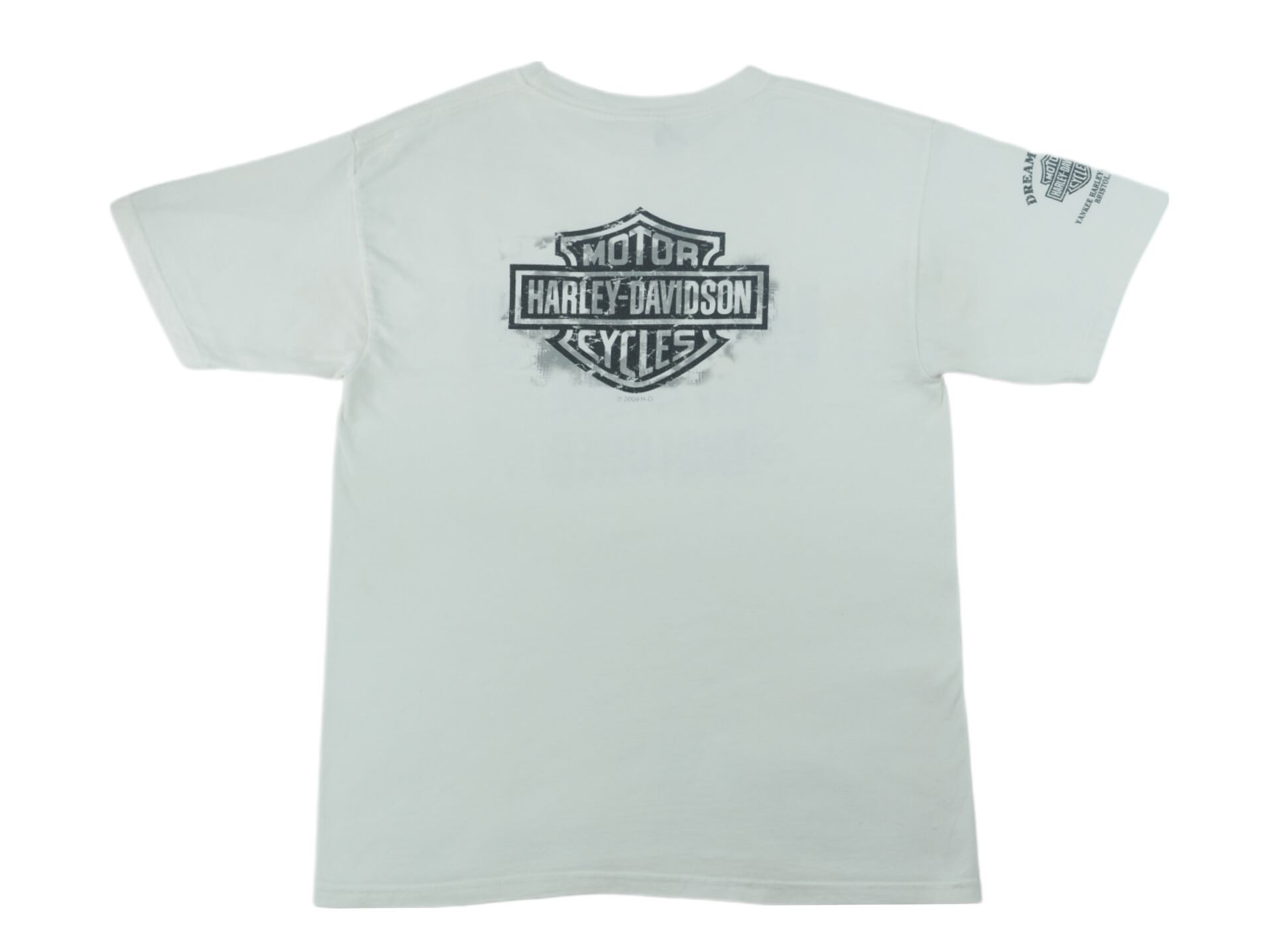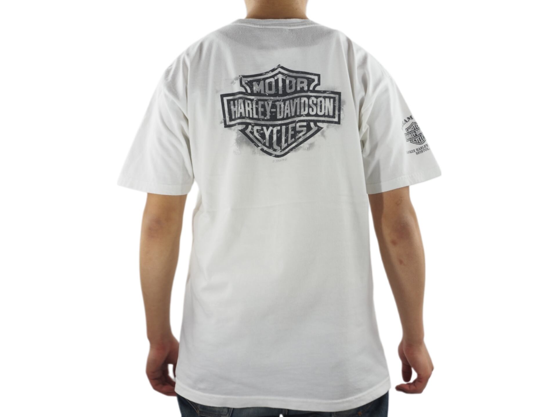 ハーレーダビッドソンよりロゴTシャツのご紹介です。2009年のコピーライトが入ったこの1枚。白いボディに映える黒のロゴが特徴的です。ロゴの背景にはバイクが描かれており、シンプルでありながらも迫力のあるデザインはさすがハーレーダビットソン。ハーレーファン以外の方にもおすすめの1枚です。