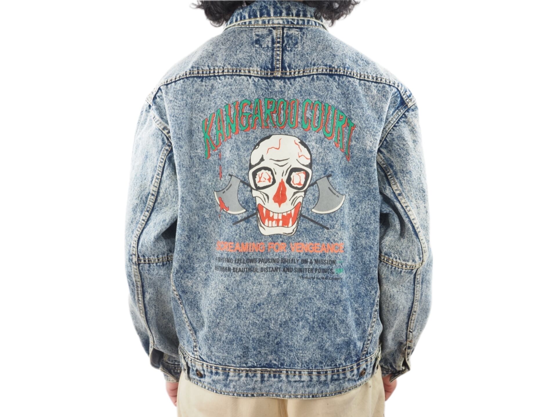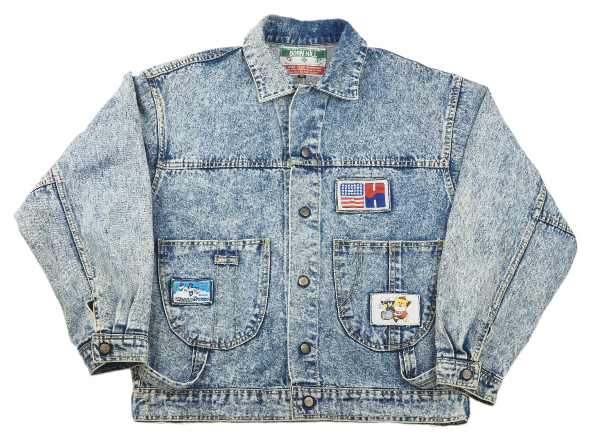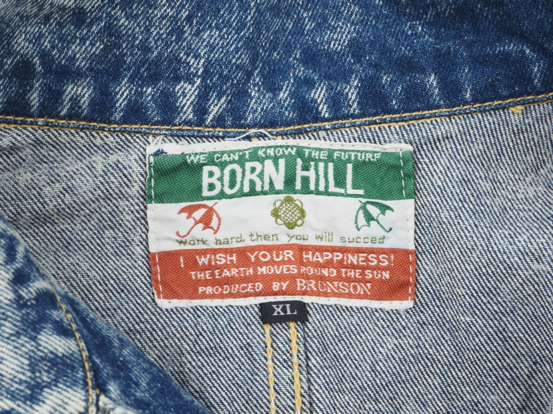格好良いデニムジャケットが入りました。ドクロのバックプリントが目を引く、最高にイカした1着です。表面のワッペンやポケットのディティール、シルエット、どれもめちゃくちゃ良く、スナップボタンなのも面白いポイントです。born hill というブランドのようですが、調べても出てきませんでした。少々の黄ばみ等あるものの、それがむしろ雰囲気を引き立ていて格好良いです。おすすめの1着です。