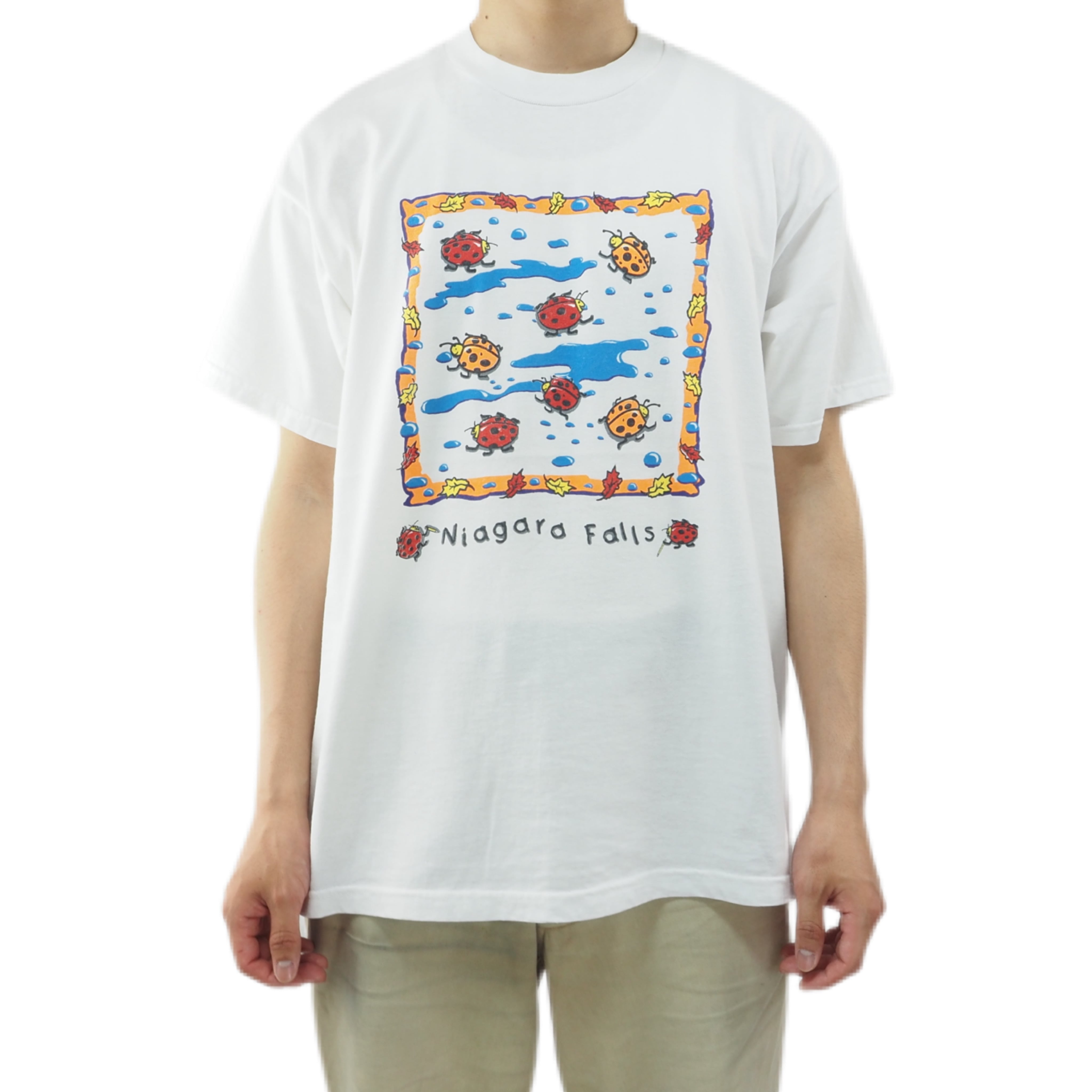 90’s FRUIT OF THE ROOMのプリントTシャツです。てんとう虫とメープルリーフが目を引く1枚。プリントの下部には、ペンを持ったてんとう虫が描かれており、"Niagara Falls" のフォントが手書き風になっているのが素敵です。