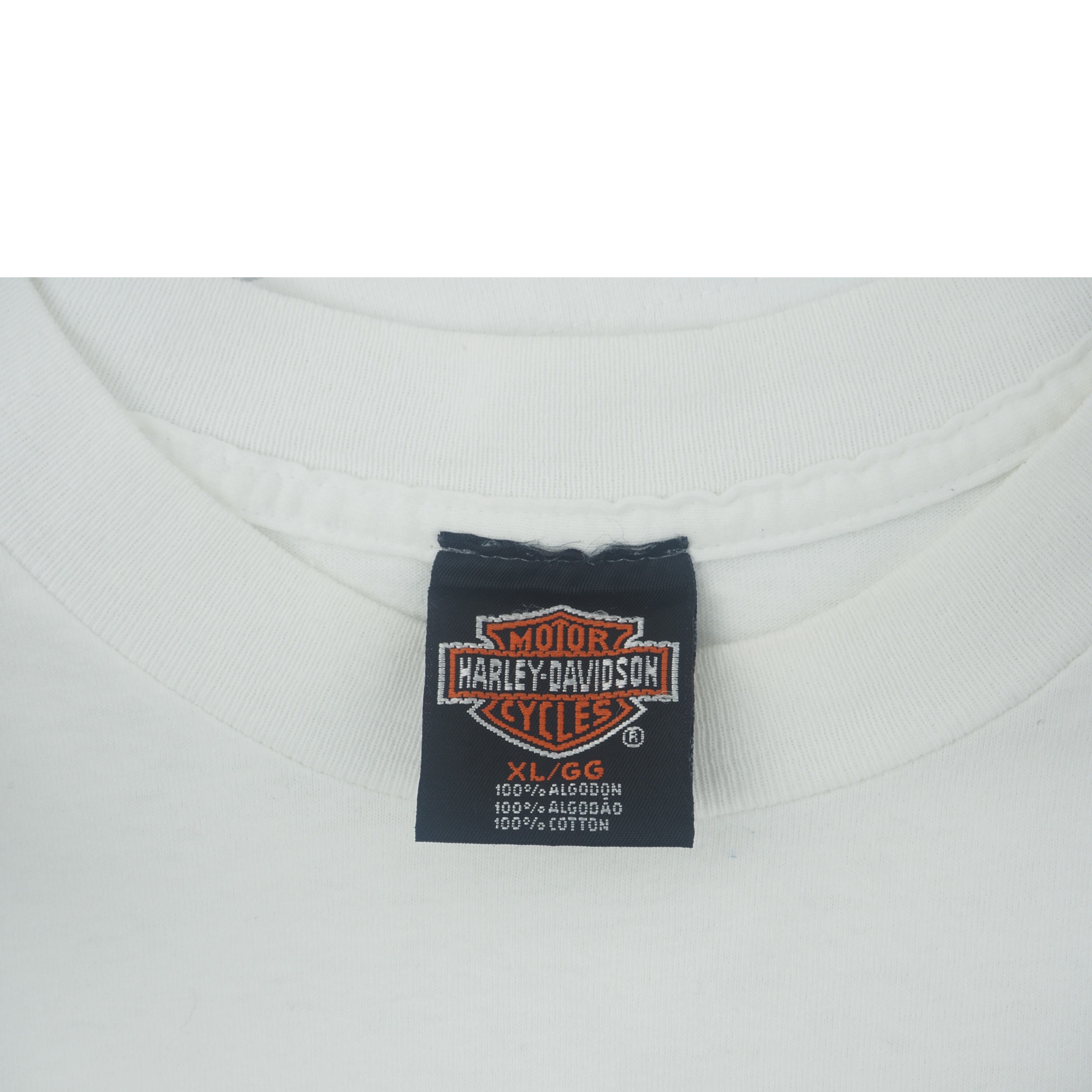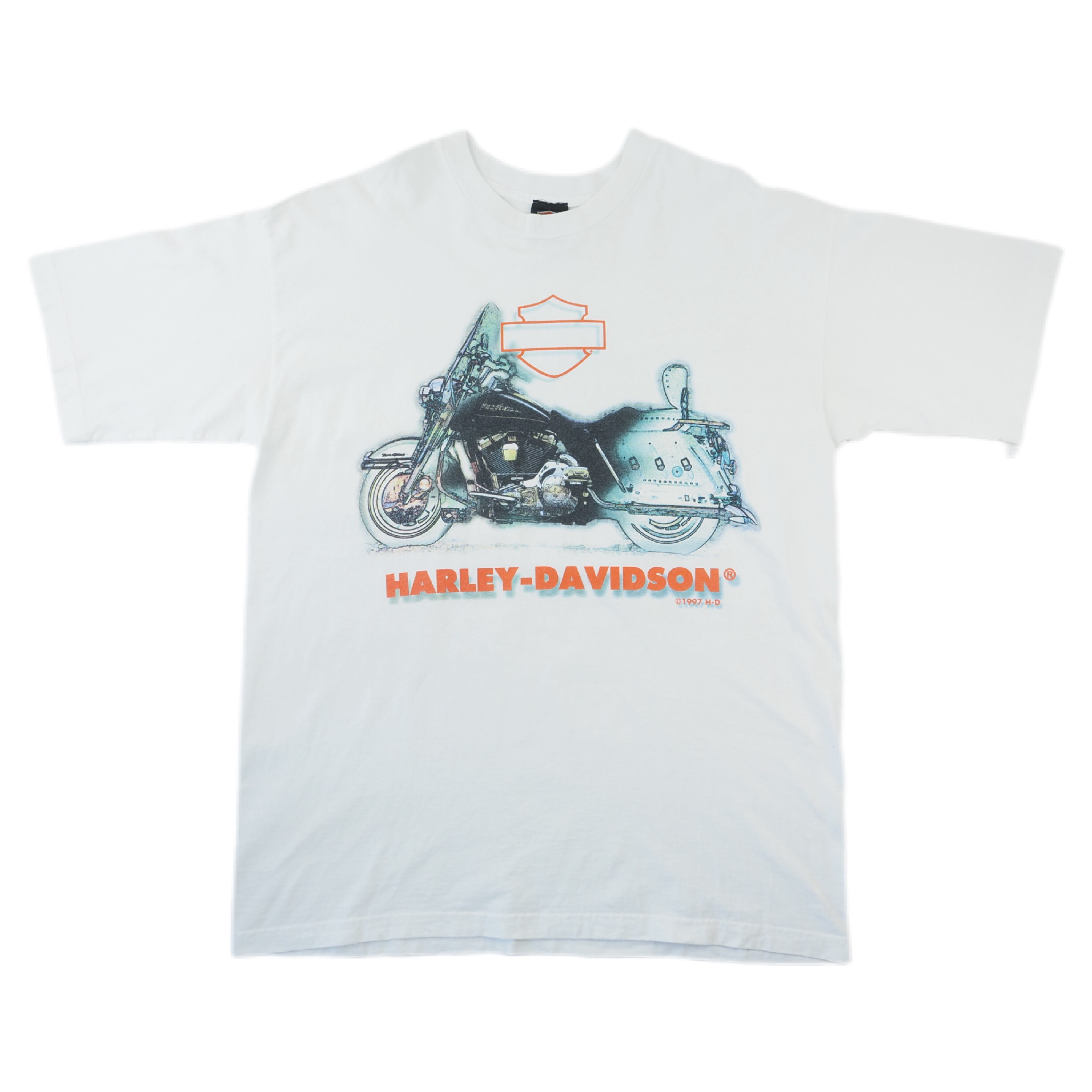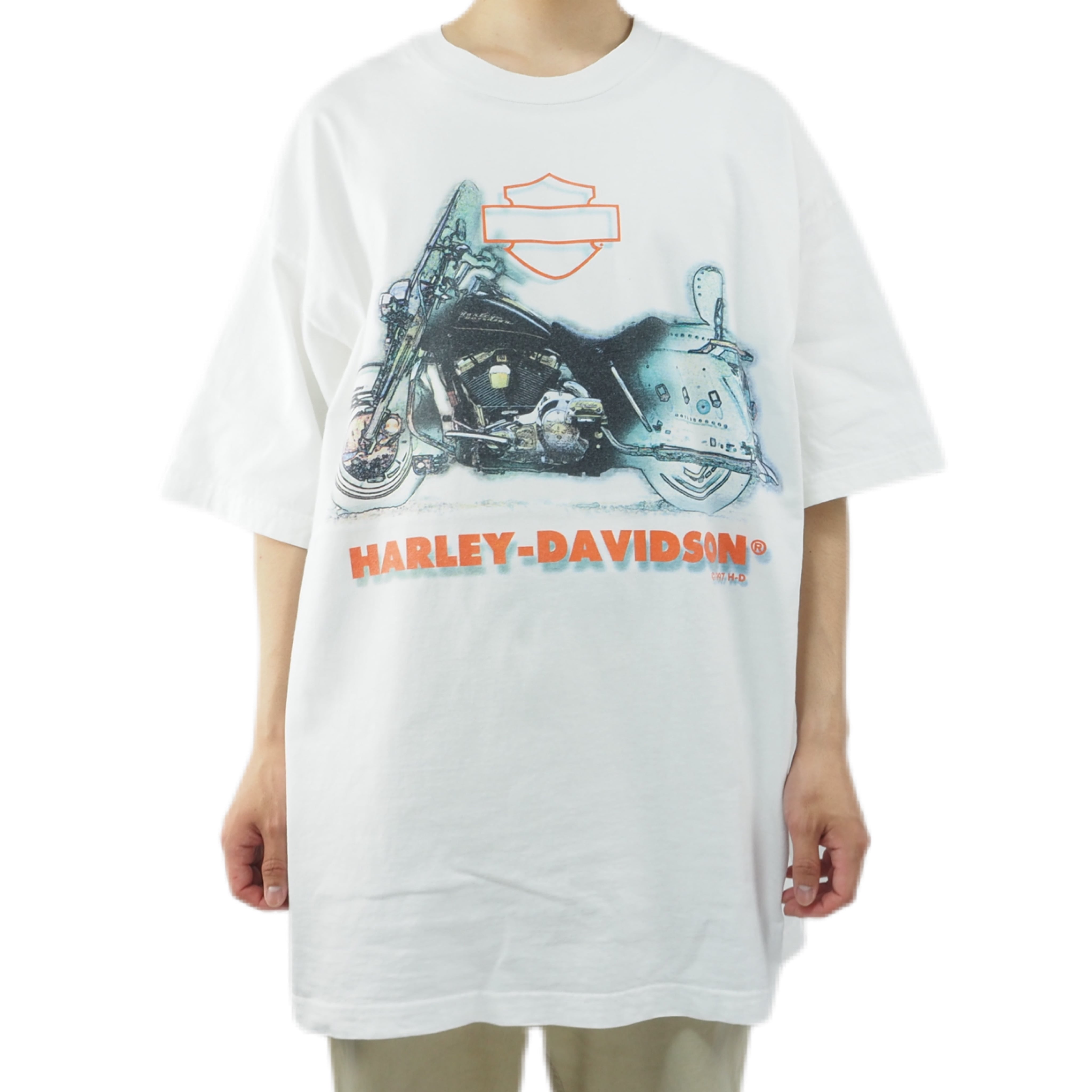 90s Harley-DavidsonのプリントTシャツです。大きくプリントされたバイクが目を引く1枚。浮き上がった様に見えるフォントや青とオレンジの配色も良いです。裏面はロゴと文字のシンプルなデザイン。非常に格好良いTシャツです。