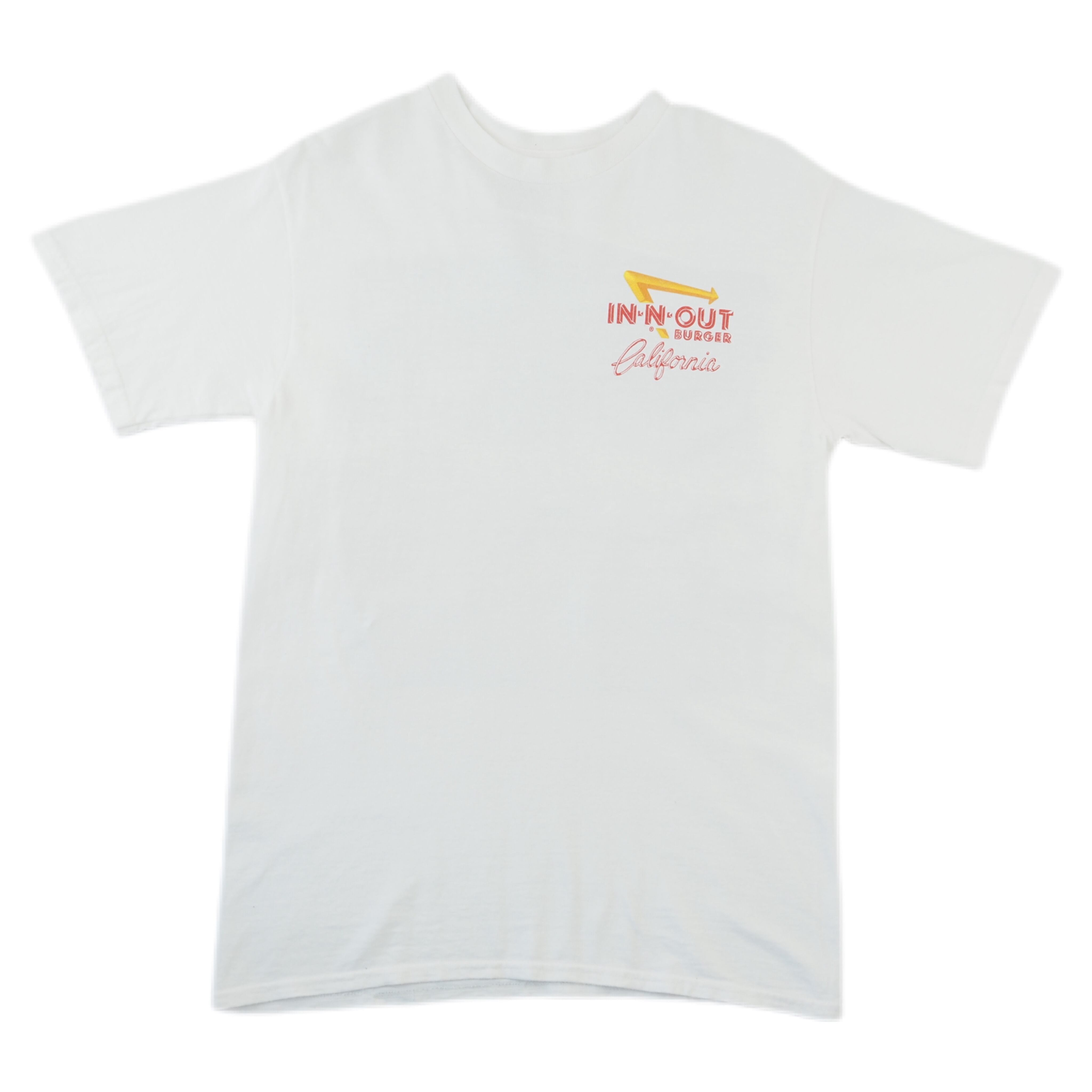 イン・アンド・アウト・バーガーのTシャツです。アメリカの西海岸を中心に人気のバーガーチェーン、InーNーout burgerの企業Tシャツ。ワンポイントの企業ロゴ、ハリウッドの夜の街並みが描かれたバックプリントが良いデザインです。