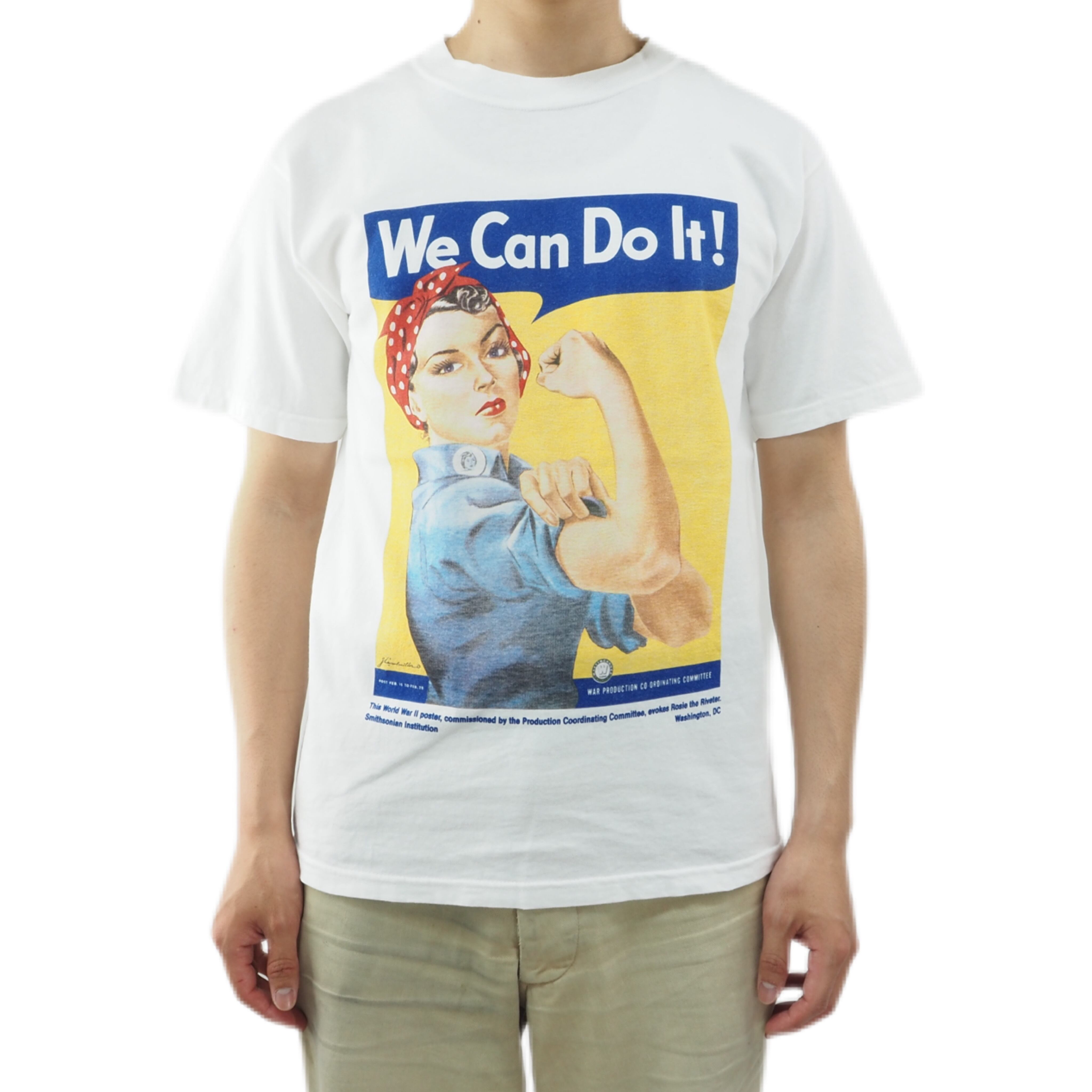 2000年代プリントTシャツです。第二次世界大戦中に工場や造船所で働いていた女性たち、ロージー・ザ・リベッターのポスターがプリントされた1枚。女性が自発的に軍事物資等の生産に従事するよう促すために政府によってつくられたポスターで、近年ではフェミニズムと女性の経済的自立のシンボルとなっています。こういう時代背景を感じられるところが良いですね。素材はコットン100%で夏にガシガシ着用出来ると思います。サイズ感は表記SサイズですがMサイズでジャストサイズ。普段Sサイズを着用される方は少しゆとりを持って着用できるかなと思います。