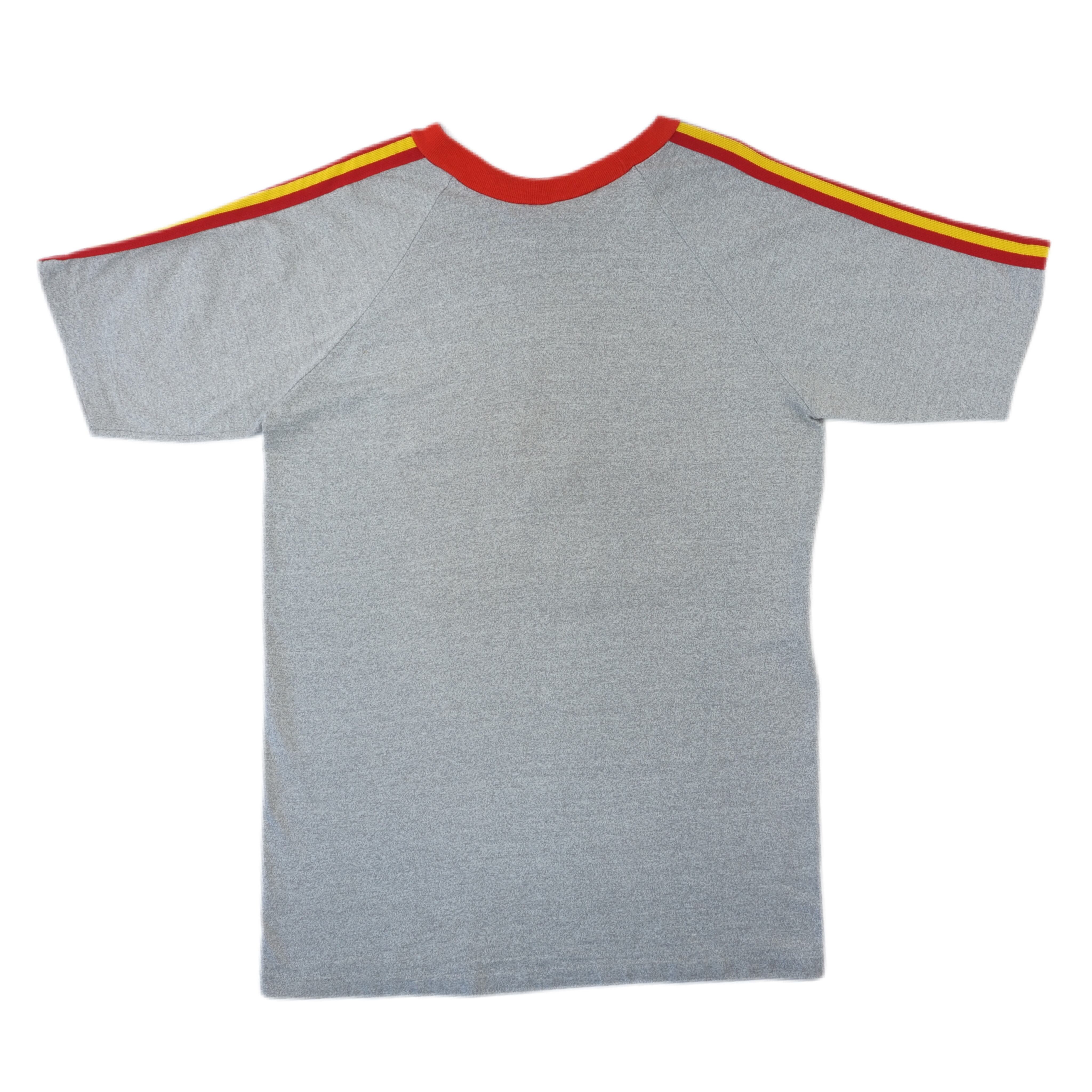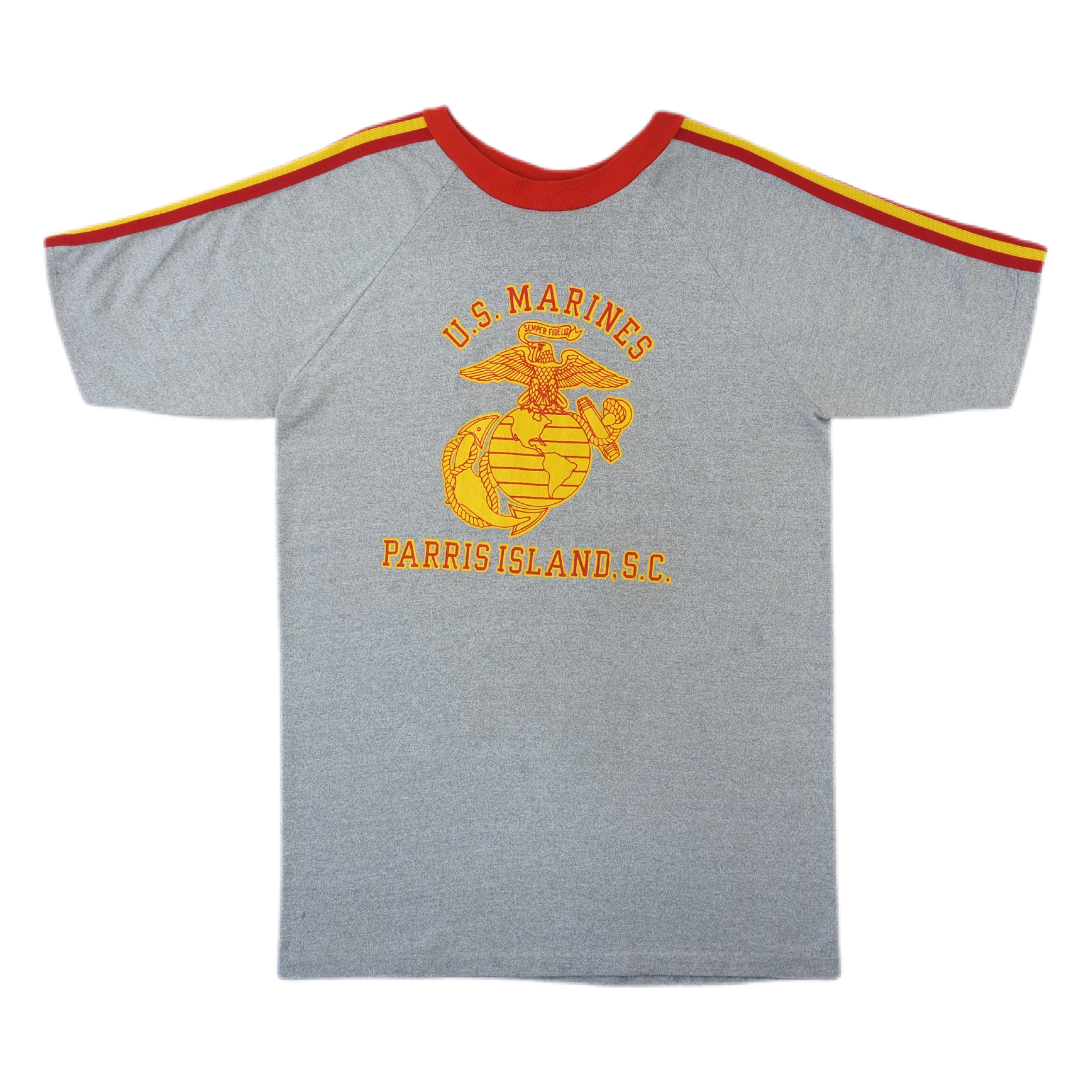 70年代後期~80年代前半Velva SheenのヴィンテージTシャツです。タグは切り取り取られていますが形跡からVelva Sheenのタグと判断しました。大学やスポーツチームのプリント用ボディとして広まった同ブランド。品質はアメリカ海兵隊のコスチュームボディに使用されていた程です。こちらの1着も同様にアメリカ海兵隊で使用されていたと見られる1着。肩のジャージラインが特徴的で、ごま塩柄ボディにUSMC(アメリカ海兵隊)のロゴが目を引きます。軍モノのTシャツということで少し周りと差をつけられる1枚です。