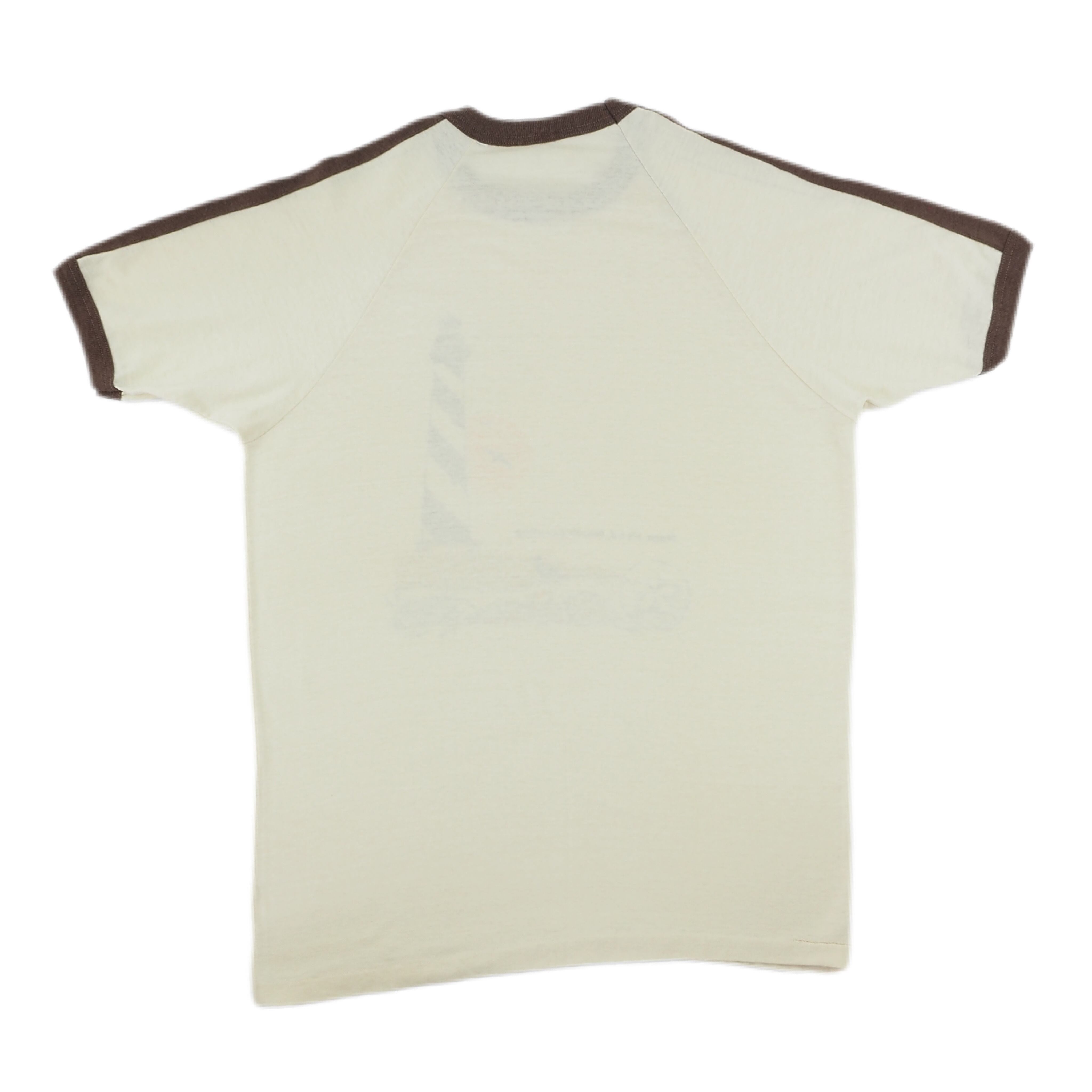 80年代、ラグランスリーブのリンガーTシャツです。ノースカロライナ州ナグスヘッドの海岸沿いの景色がプリントされたTシャツ。夕日や灯台、貝など、ナグスヘッドの景色が良いグラフィックで描かれています。こちらは80年代に多く見られたポリエステル混紡の生地で、ヴィンテージTシャツらしい風合いが特徴的です。着用した時のシルエットも綺麗ですね。
