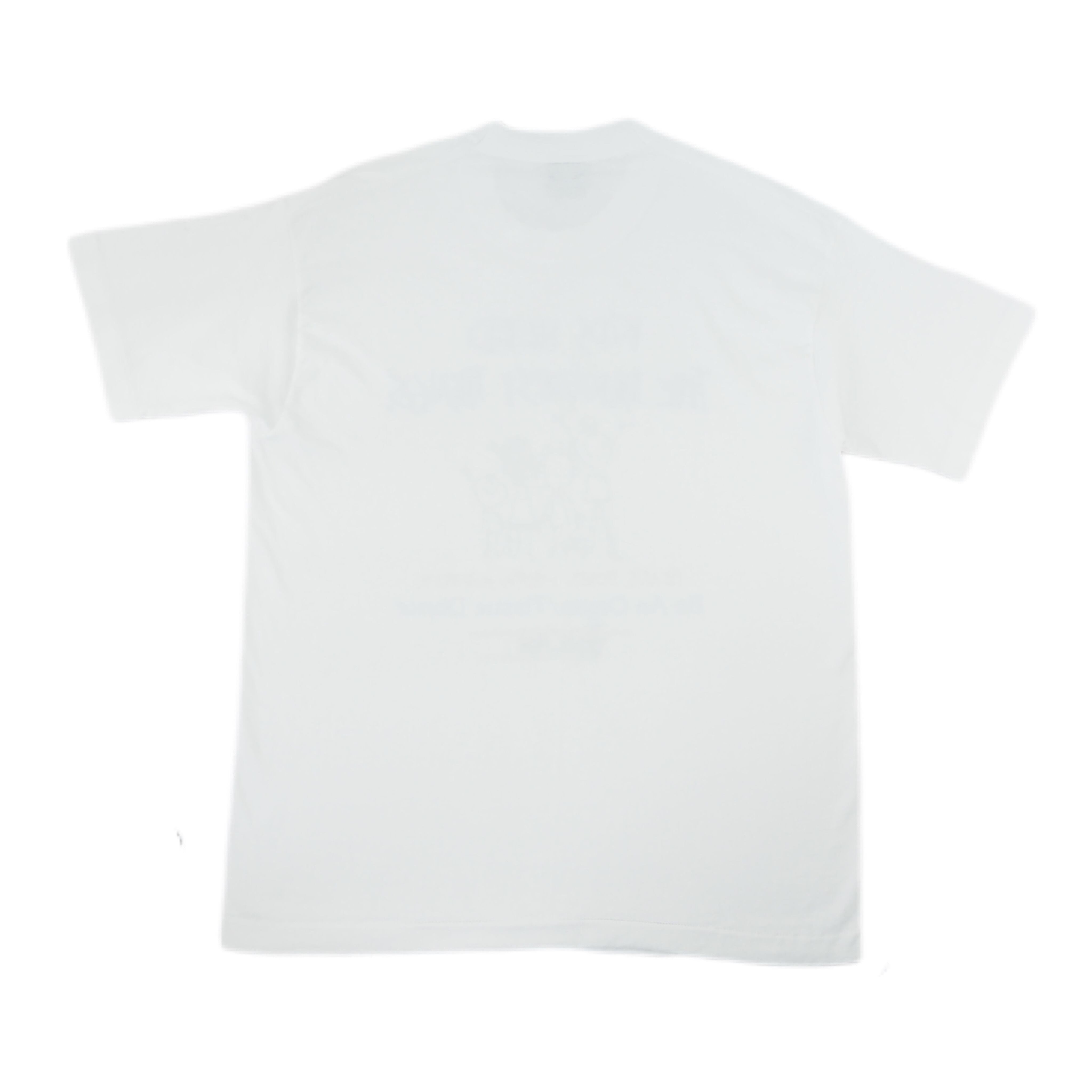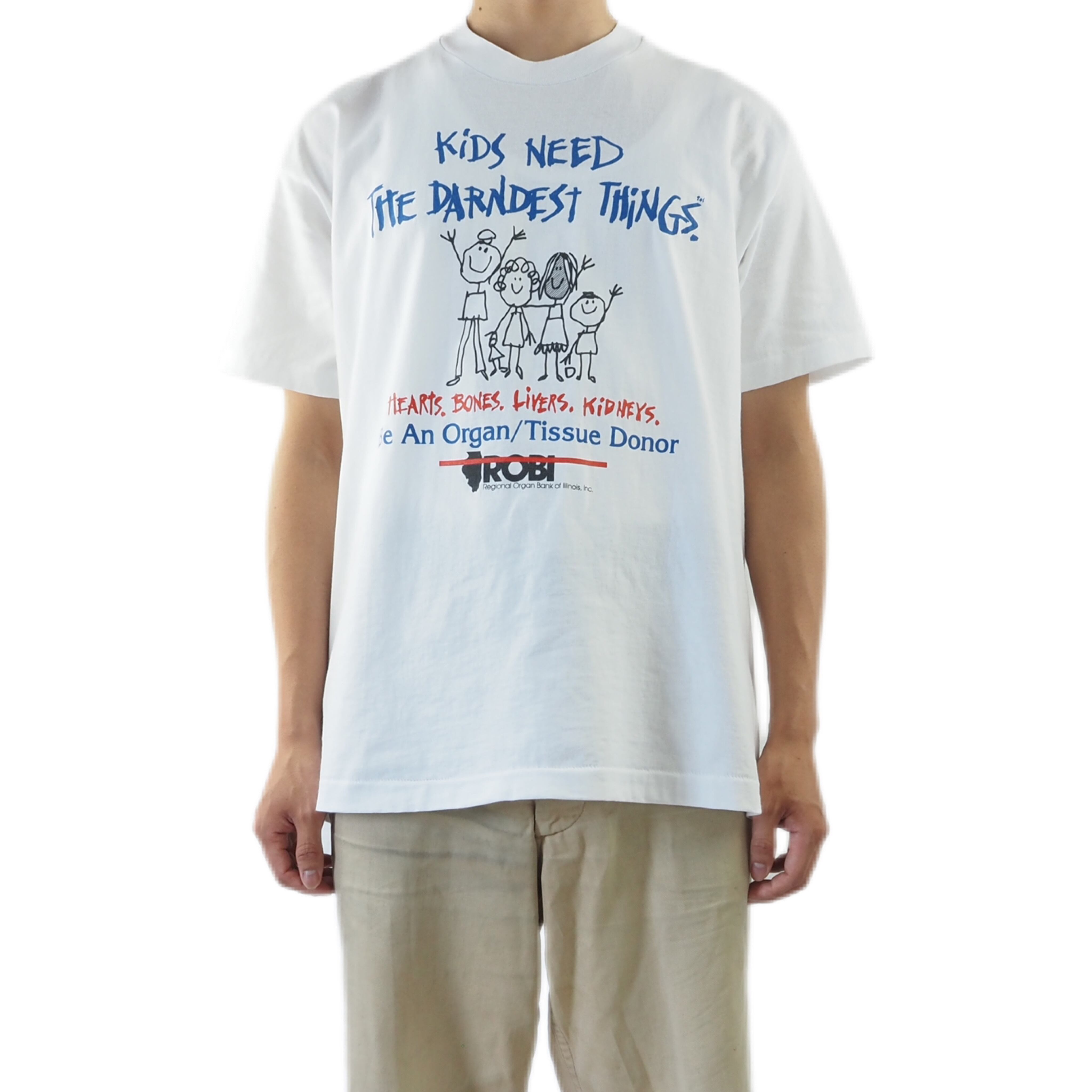 90年代フルーツオブザルームのTシャツです。手を挙げた子どものグラフィックが目を引く1枚。Tシャツには子どもの臓器提供を求める文言が書かれています。子供が書いたようなグラフィックの絵がグッドです。