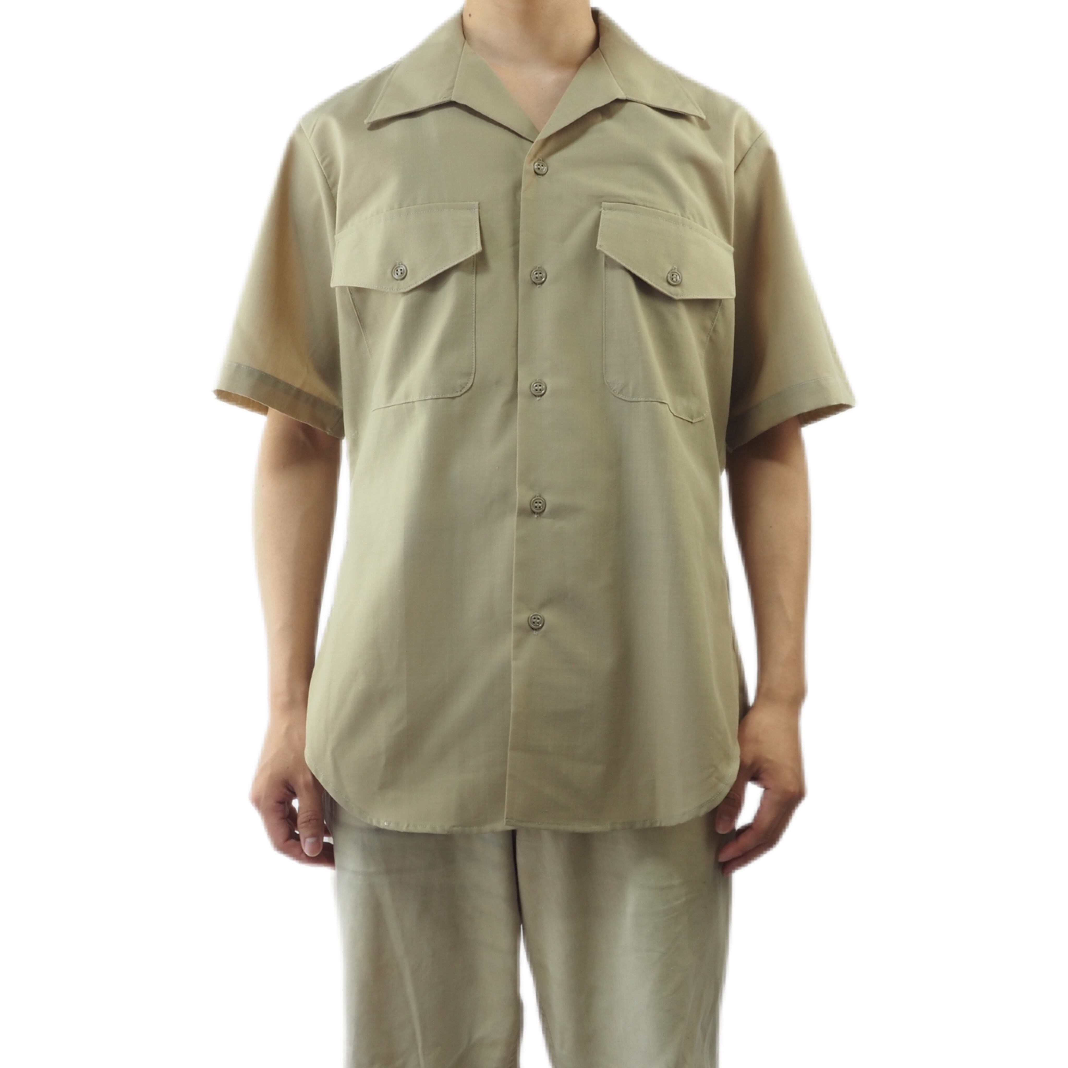 米軍 DSCP サービスドレスシャツです。式典用制服として位置づけられているサービスドレスユニフォームのトップスにあたるアイテム。フラップタイプの胸ポケットが左右に設けられており、袖口はシングルタイプとなっています。ファブリックには薄手でしゃり味のあるトロピカルを採用。首もとには軍需物品の流通・備蓄及び補給網整備などを担当する国防兵站局(DLA)の事業部門のひとつ、フィラデルフィア国防補給センター(DSCP)のタグが縫い付けられています。シンプルなデザインで、一枚持っておくと重宝するアイテム。カジュアルから少しきれいめなコーディネイトまで、幅広く活躍してくれます。