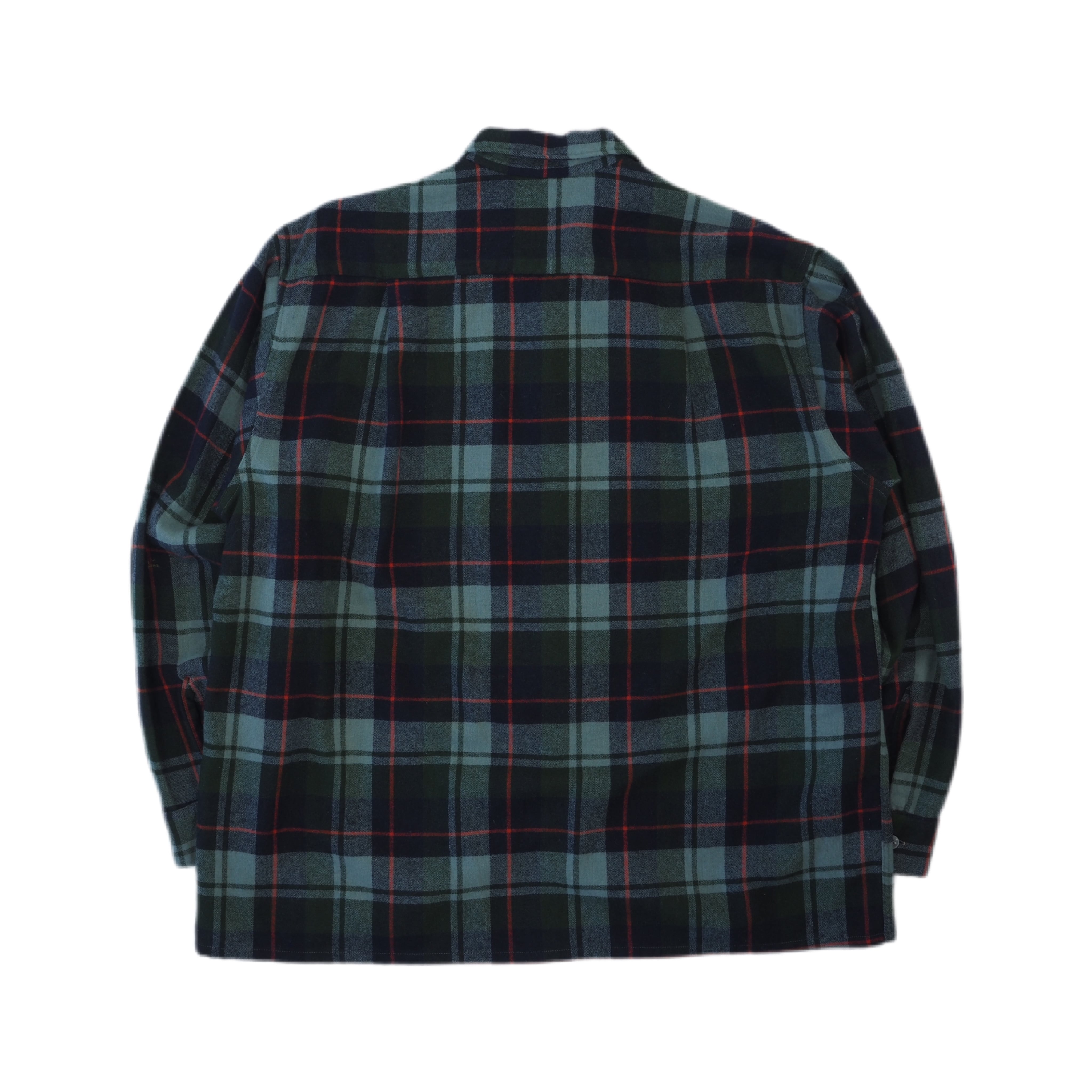 50年代の開襟ウールチェックシャツ。クラシックなデザインのシャツで、配色、シルエット共に文句無しの1着。サイズもLとゴールデンサイズ。大きなダメージ等も無く、条件の整っている1着かと。